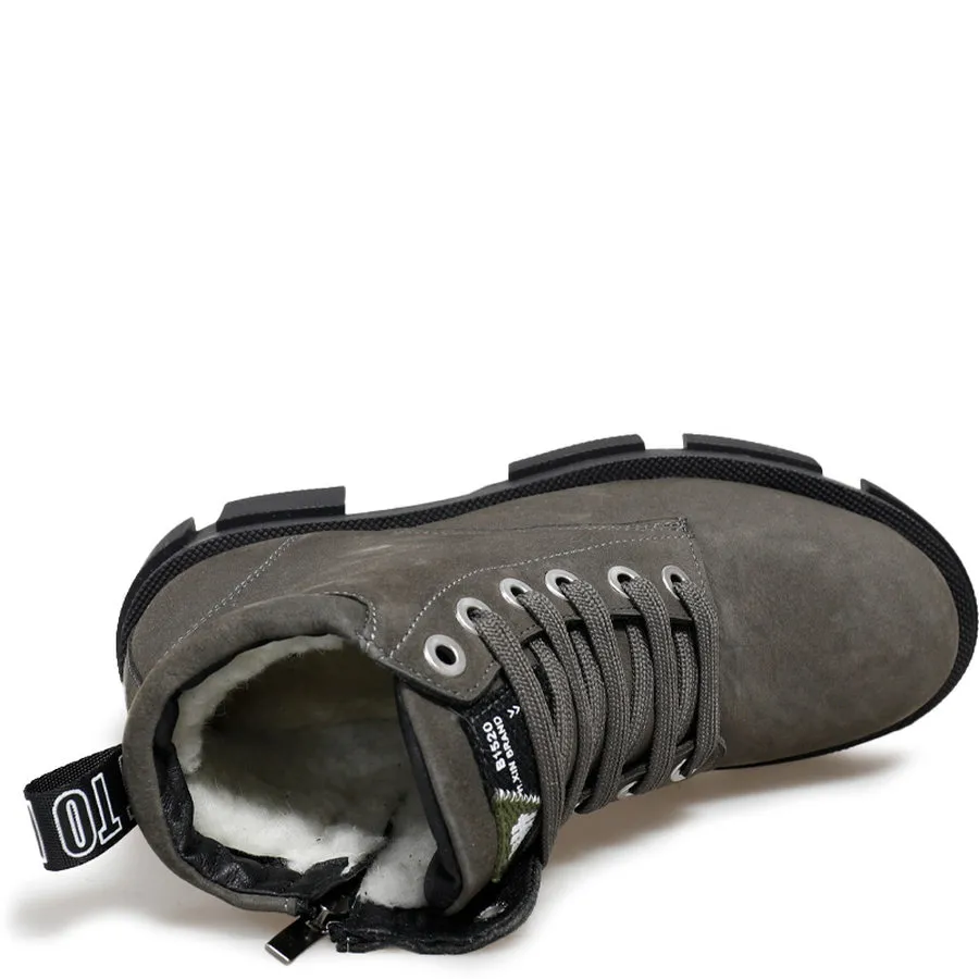 Материал верха: нубук, который придает обуви элегантный и стильный вид, а также отличается прочностью и долговечностью. Внутренний слой ботинок выполнен из теплой шерсти, которая надежно сохраняет тепло и создает комфорт даже в самые холодные дни.