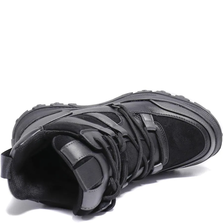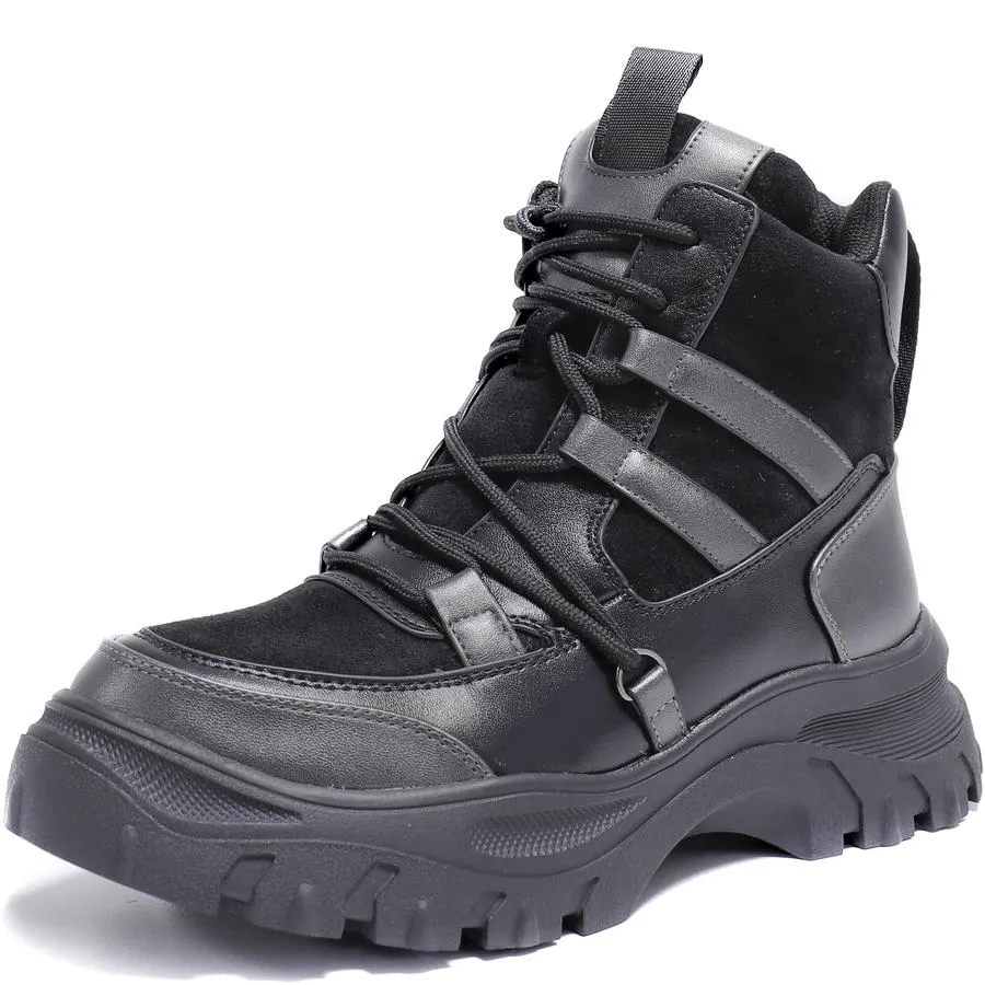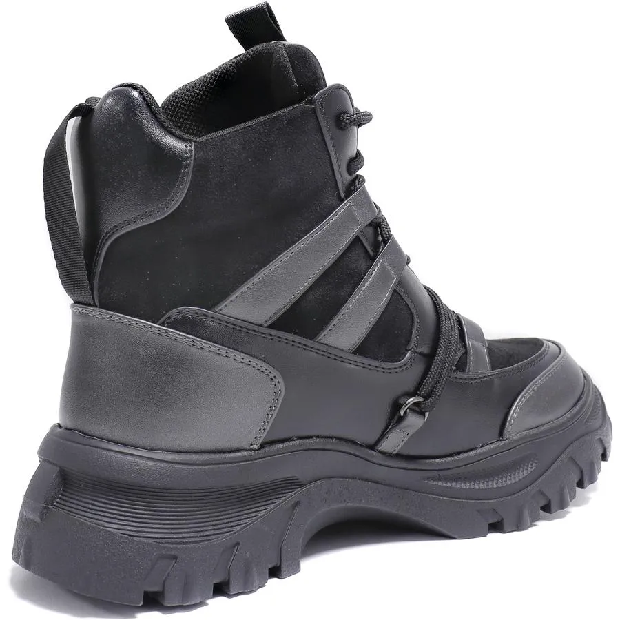 Верх ботинок выполнен из искусственной кожи, которая обеспечивает долговечность и защиту от влаги. Внутренняя подкладка из искусственного меха сохраняет тепло и придает дополнительный комфорт в холодные дни. Ботинки снабжены шнуровкой, что позволяет легко регулировать посадку и обеспечивает надежную фиксацию на ноге.