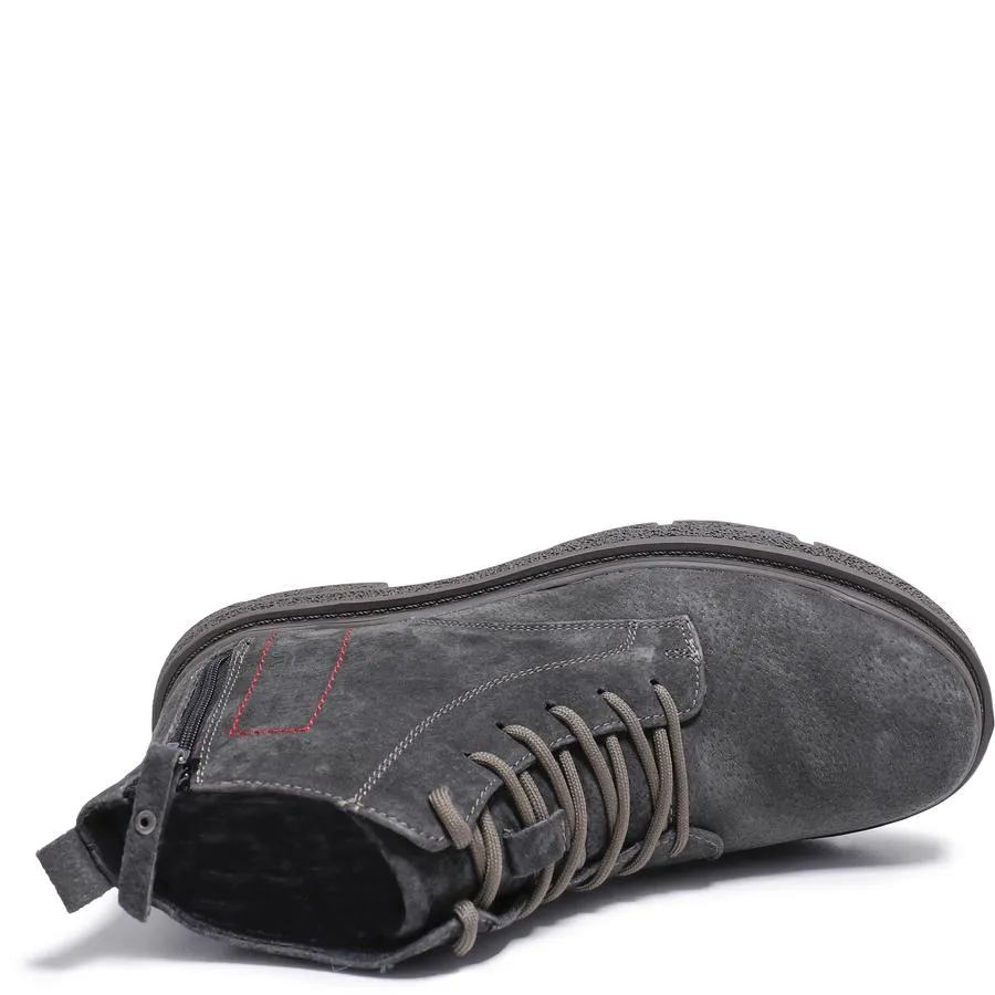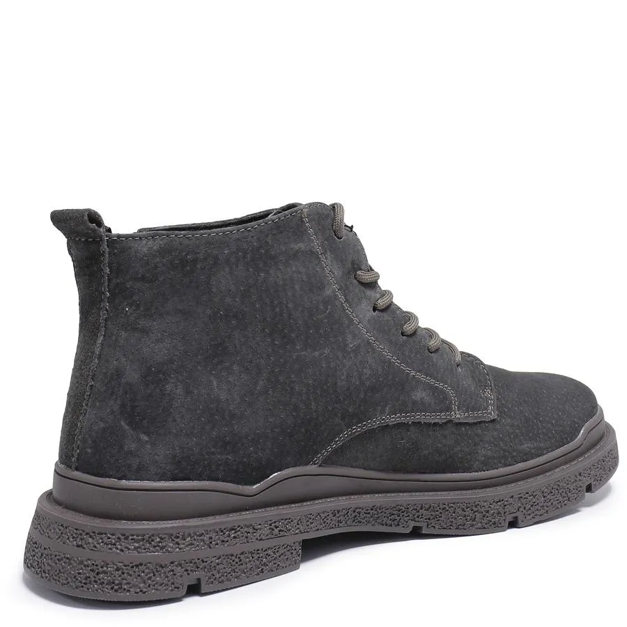 Верх модели выполнен из натурального велюра, который отличается прочностью и долговечностью. Этот материал не только приятен на ощупь, но и отлично сохраняет тепло, что делает ботинки отличным выбором для зимнего сезона. Внутри — теплая подкладка из шерсти, которая создает дополнительный комфорт и защищает от холода. Шнуровка надежно фиксирует ботинки на ноге, обеспечивая отличную посадку.