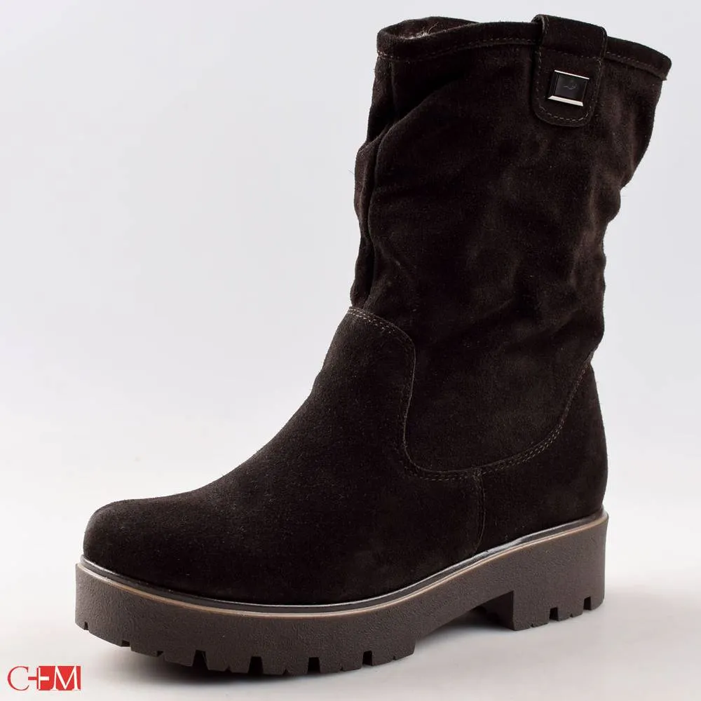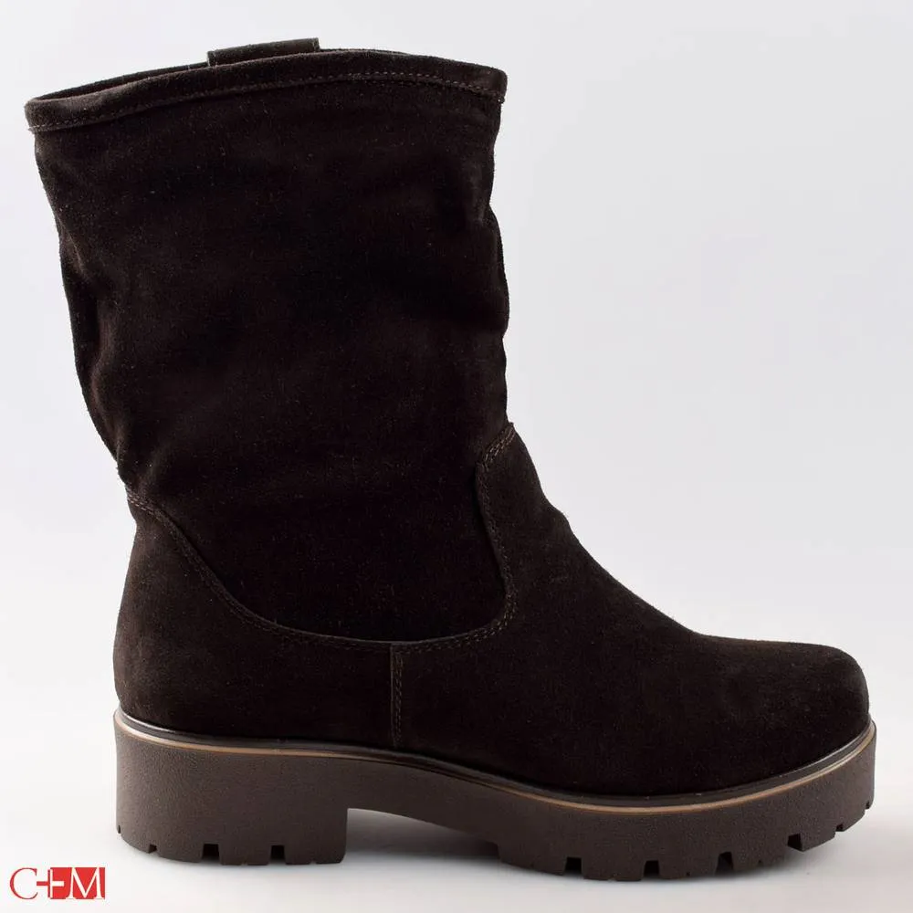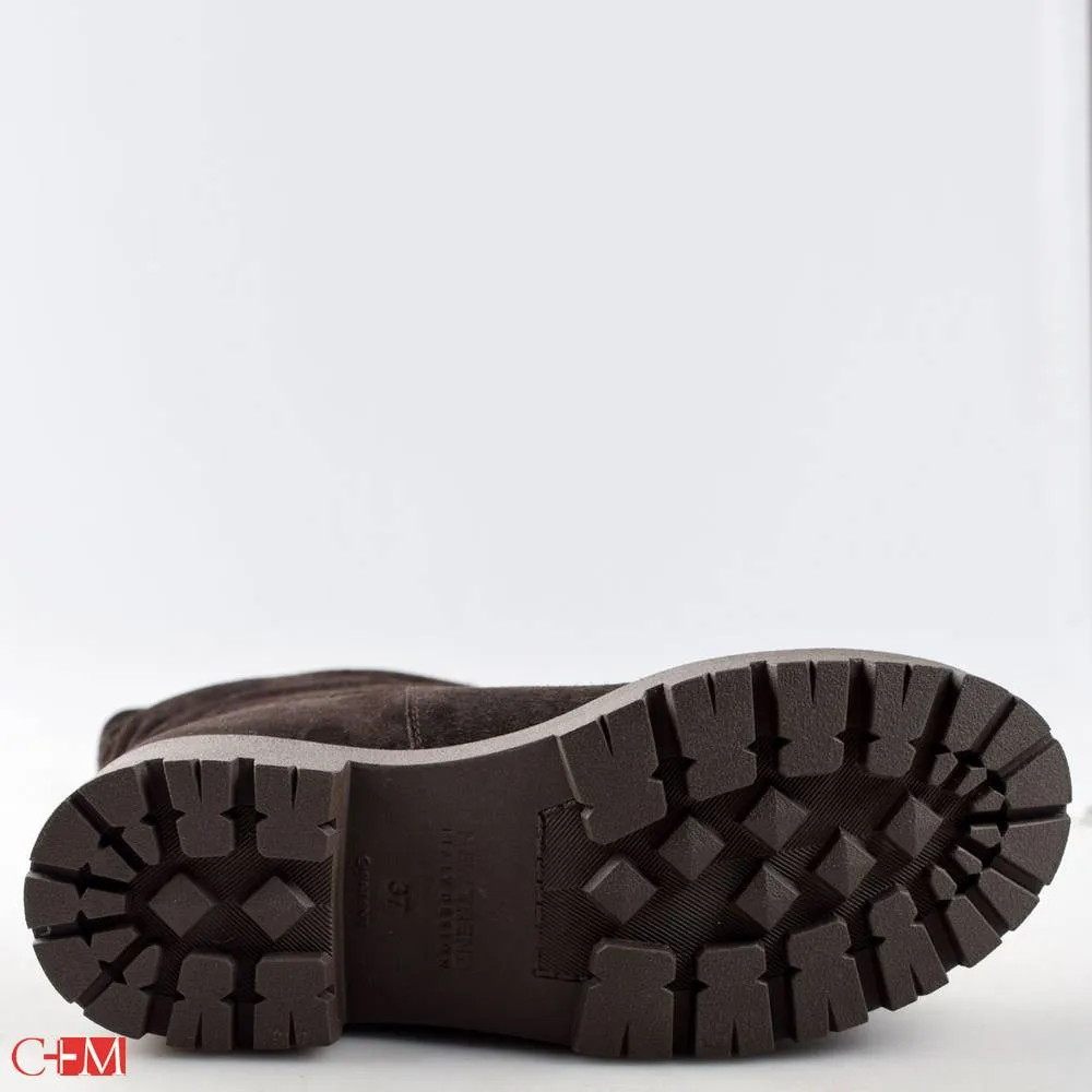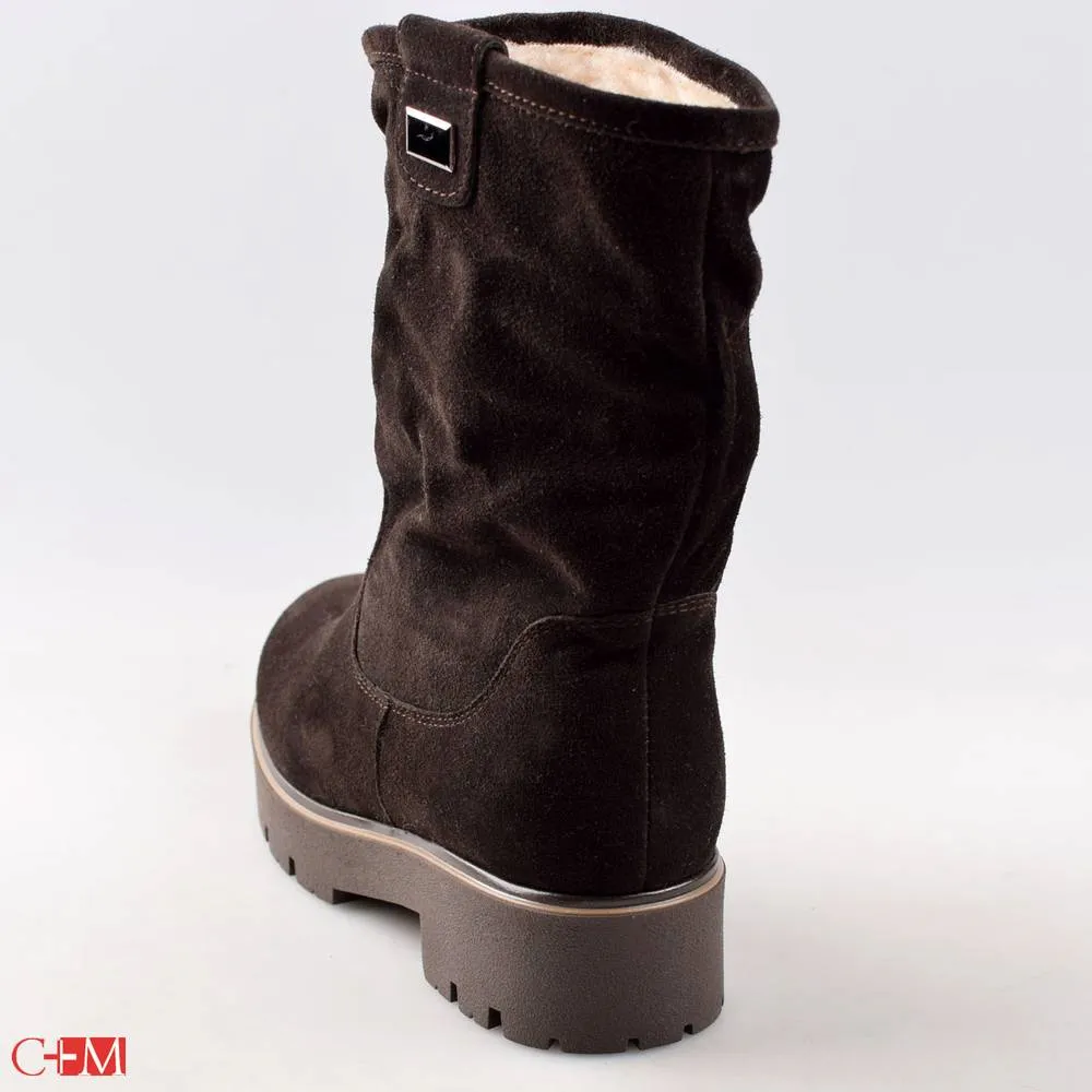 Верх выполнен из замши, что придаёт обуви элегантный и утончённый вид, а также делает её прочной и долговечной. Подкладка из шерсти гарантирует тепло и комфорт в течение всего дня.