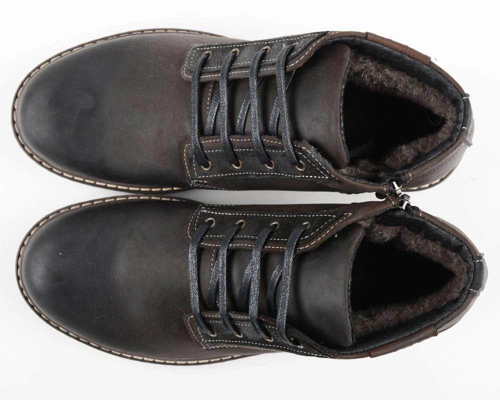 Верх модели выполнен из натурального нубука — прочного и износостойкого материала с приятной текстурой. Подкладка из шерсти сохраняет тепло даже в холодное время года, создавая максимальный комфорт. Классическая шнуровка обеспечивает удобную посадку, а подошва из полимерного материала делает ботинки лёгкими, устойчивыми и амортизирующими при ходьбе.