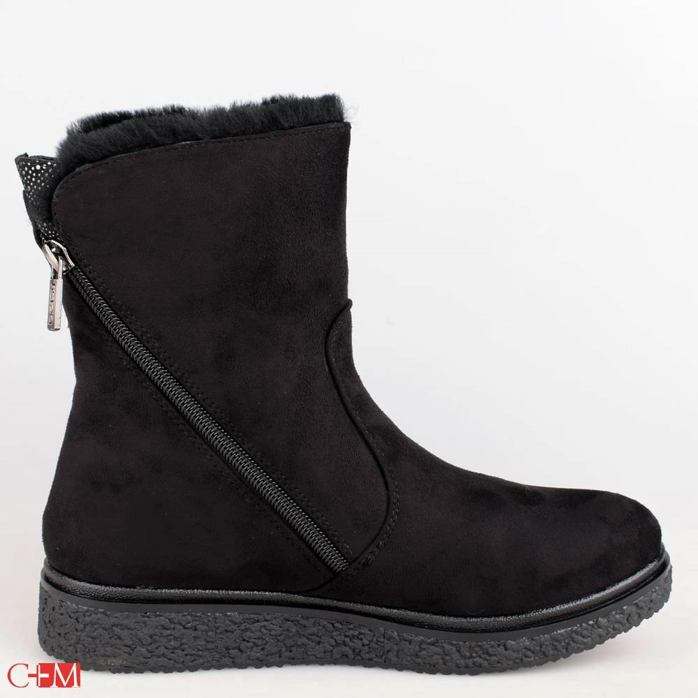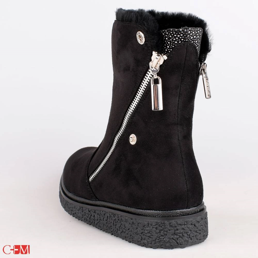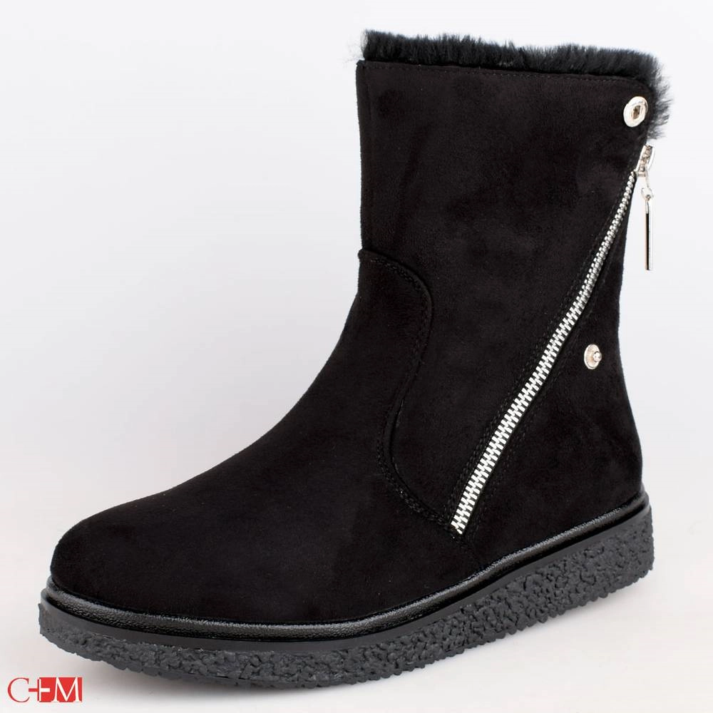 Верх выполнен из искусственной замши, что придаёт обуви элегантный вид и долговечность. Подкладка из искусственного меха сохраняет тепло, обеспечивая комфорт в холодную погоду. Прочная износостойкая подошва гарантирует хорошее сцепление с поверхностью и устойчивость, что делает ботинки удобными для повседневной активности.