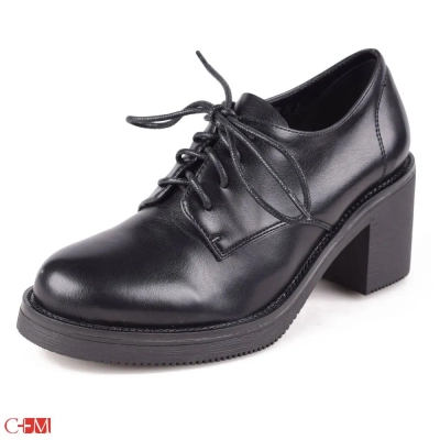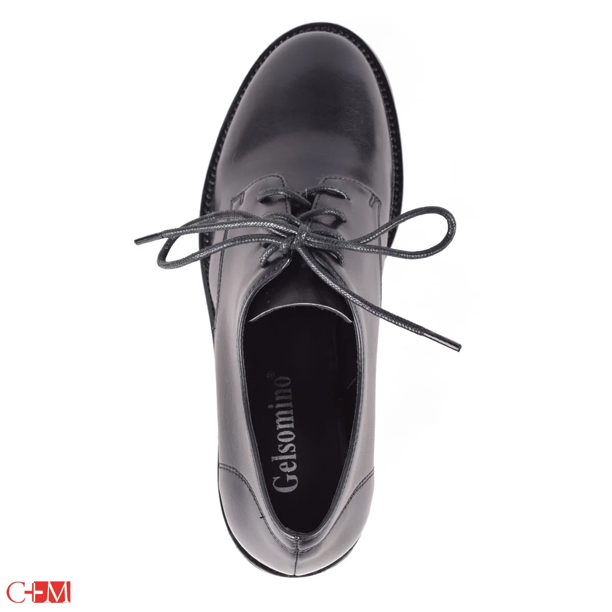 Верх выполнен из искусственной кожи, что делает туфли не только красивыми, но и практичными. Материал легко чистится и долго сохраняет привлекательный вид. Низкий устойчивый каблук и шнурки обеспечивают удобство и стабильность при ходьбе.