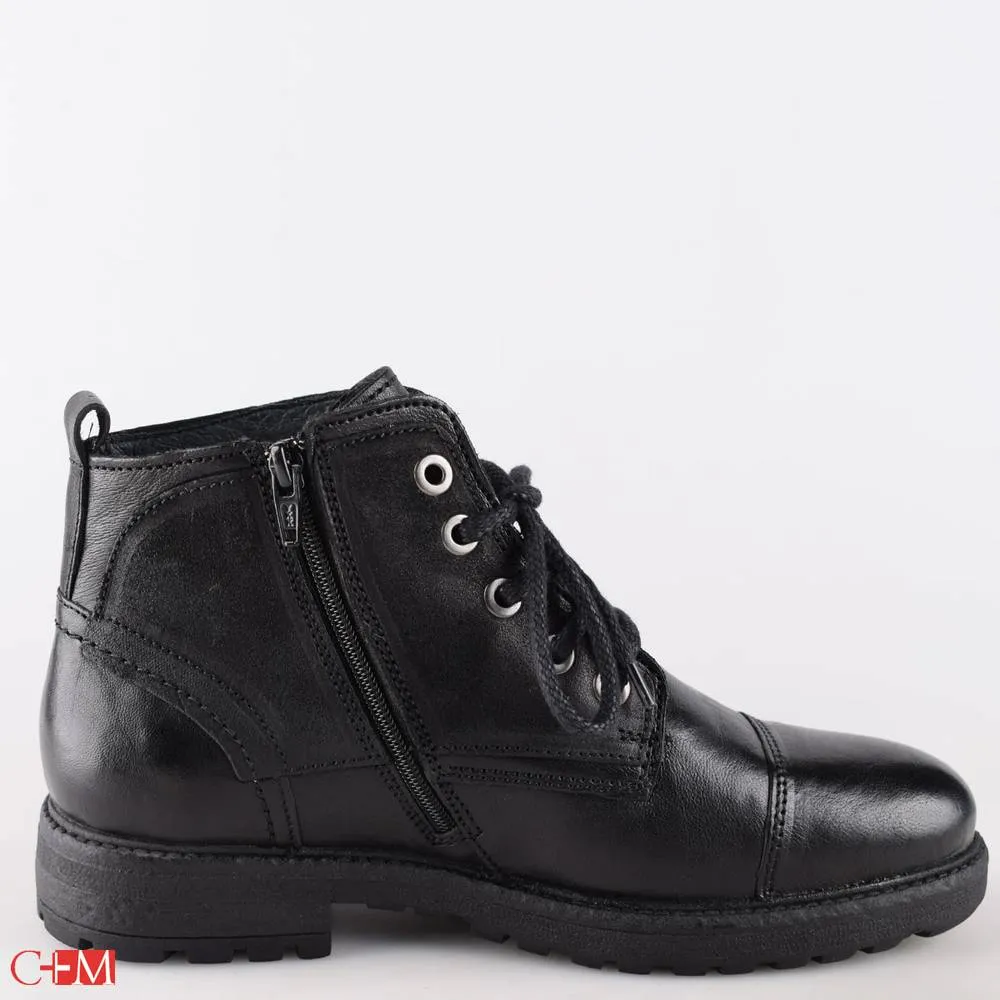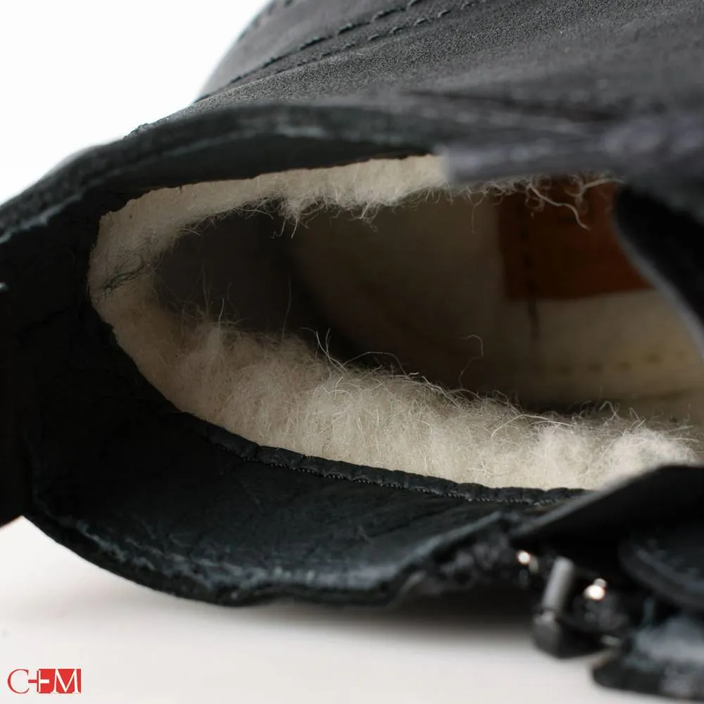 Верх ботинок выполнен из натуральной кожи и спилка, что обеспечивает прочность, износостойкость и привлекательный внешний вид. Подкладка из шерсти поддерживает комфортную температуру и добавляет уюта в холодные дни.