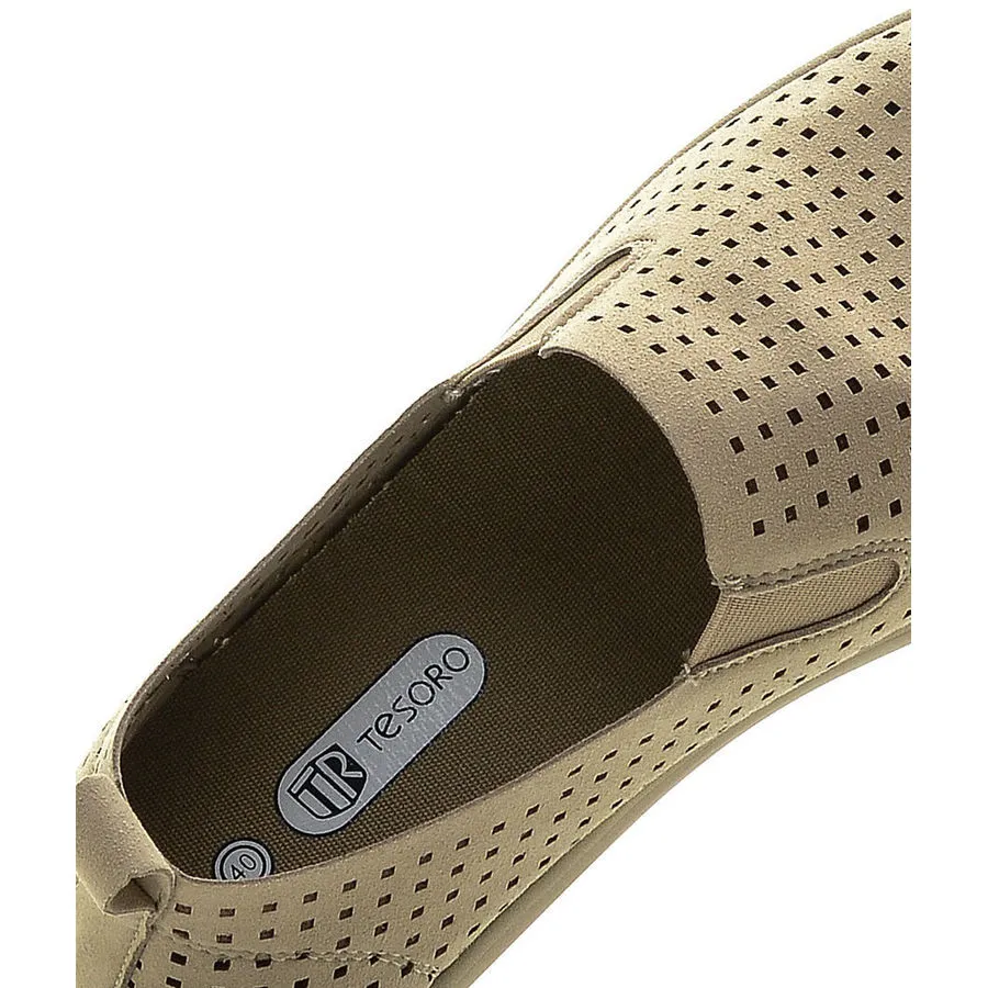 Слипоны Tesoro — идеальный выбор для тех, кто ценит легкость, комфорт и универсальность. Благодаря продуманной конструкции и комфортной посадке, обувь отлично сидит на ноге и не доставляет дискомфорта даже при длительной носке. Верх из искусственного нубука с перфорацией обеспечивает хорошую вентиляцию, что особенно актуально в теплое время года. Легкая подошва из полимерного материала делает шаги мягкими и уверенными. Современный дизайн позволяет легко сочетать слипоны с повседневной одеждой, создавая стильный и удобный образ.