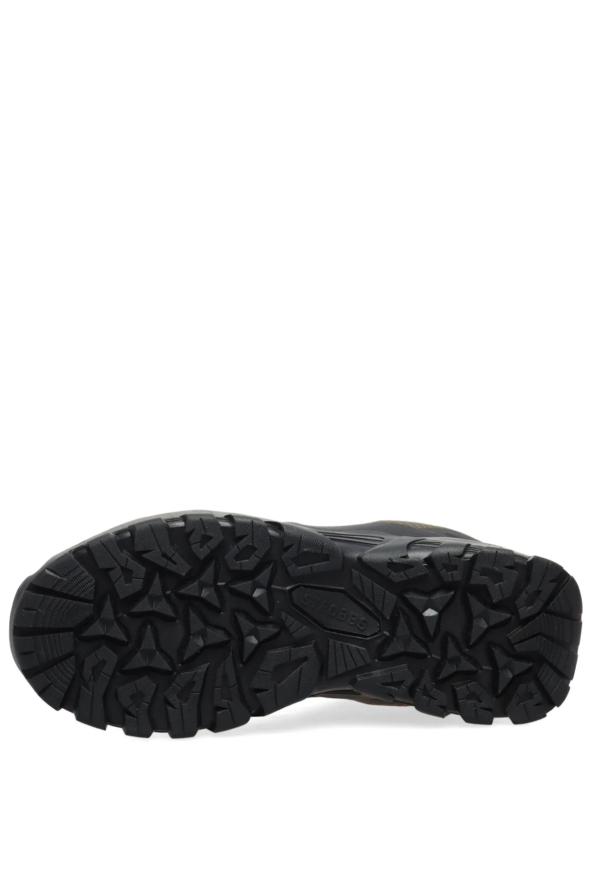 Фиксация на ноге обеспечивается классической шнуровкой, а язычок соединен с верхом с обеих сторон, что предотвращает попадание камней и снега в обувь и удерживает язычок по центру. Резиновый рант из PU вокруг обуви обеспечивает максимальную защиту и долговечность.
