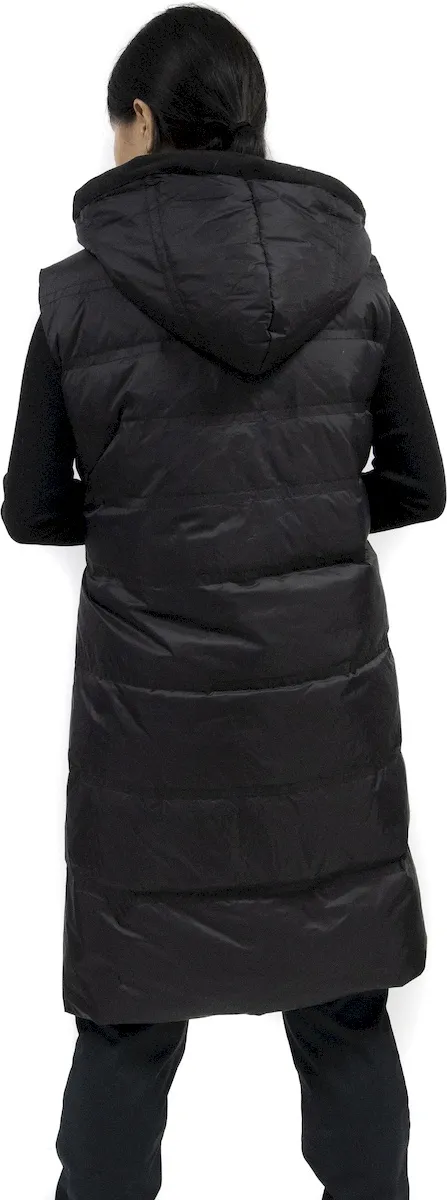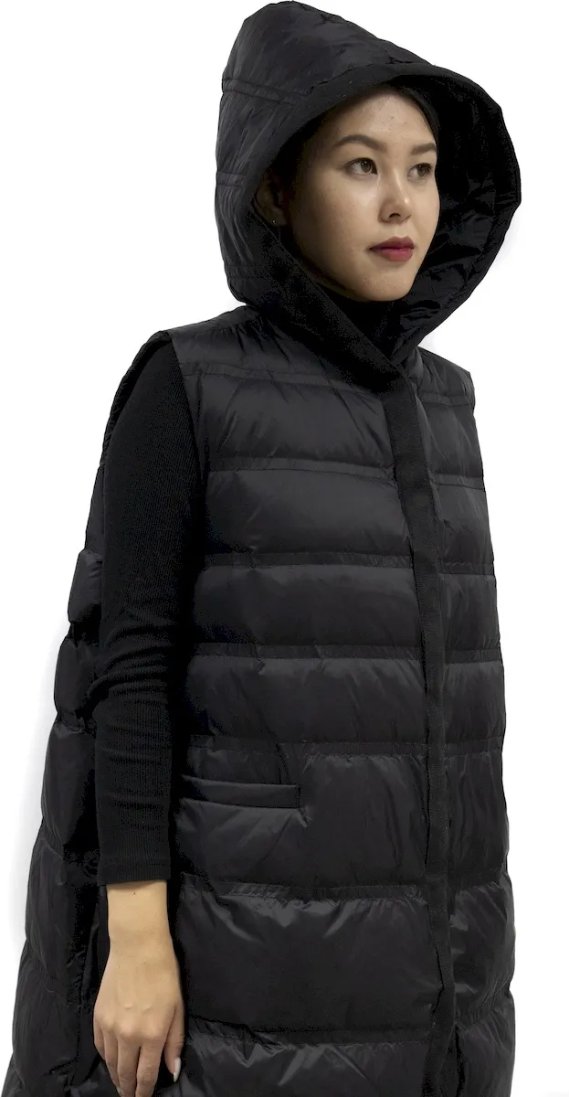 Жилет застегивается на заклепки по всей длине, что придает ему современный и стильный вид, а также позволяет легко и быстро его застегнуть или расстегнуть. Удлиненный крой добавляет изысканности и обеспечивает дополнительную защиту от холода, не ограничивая свободу движений.