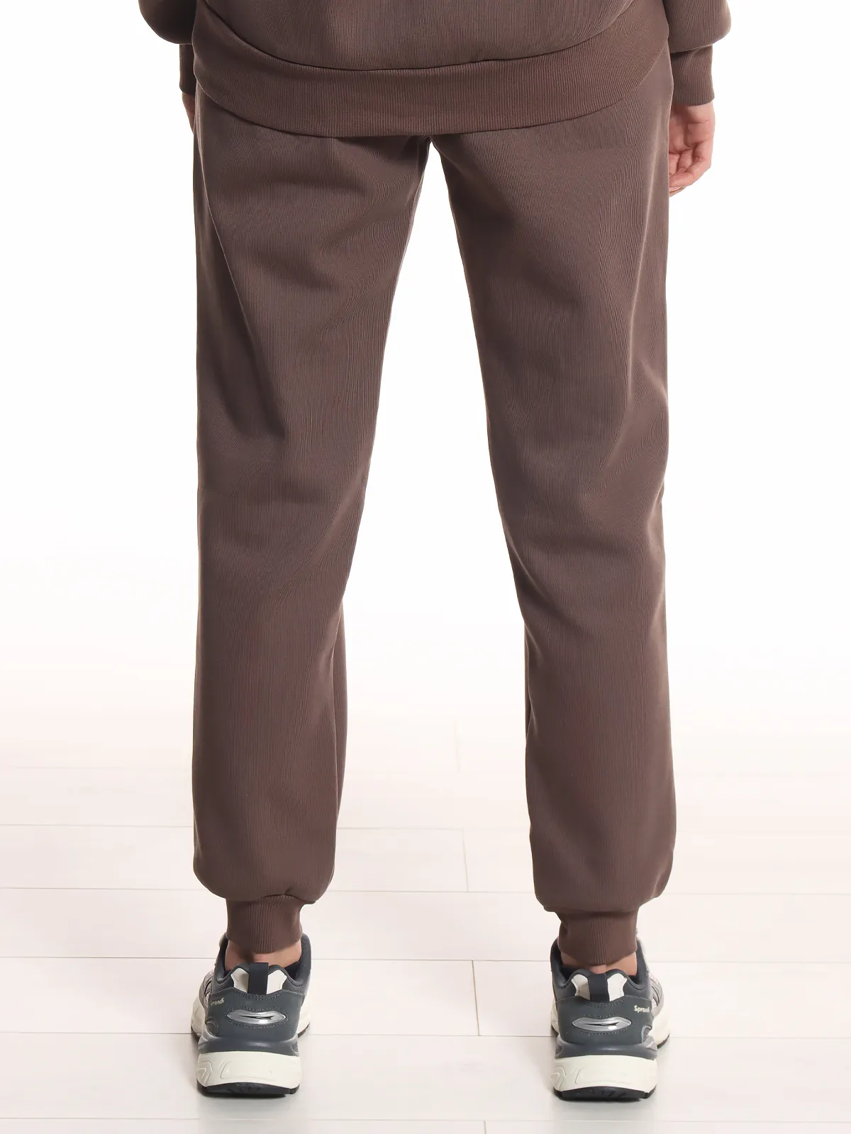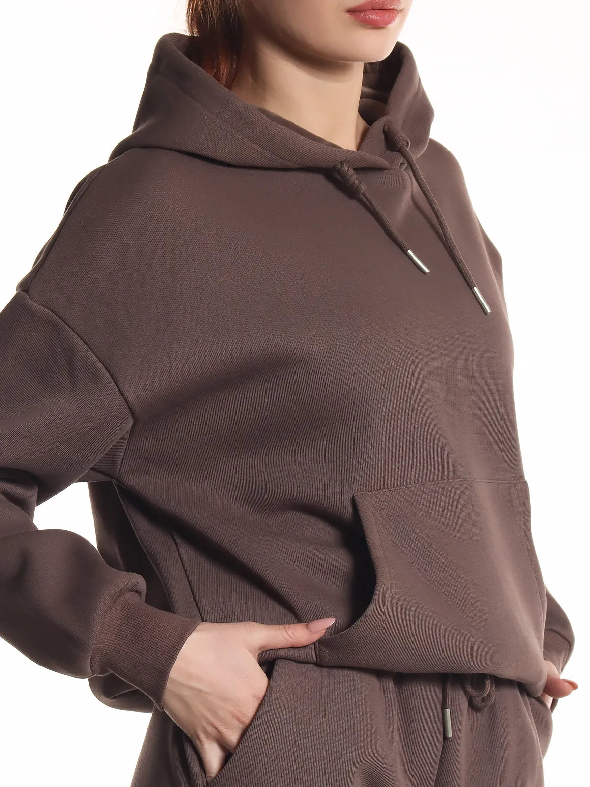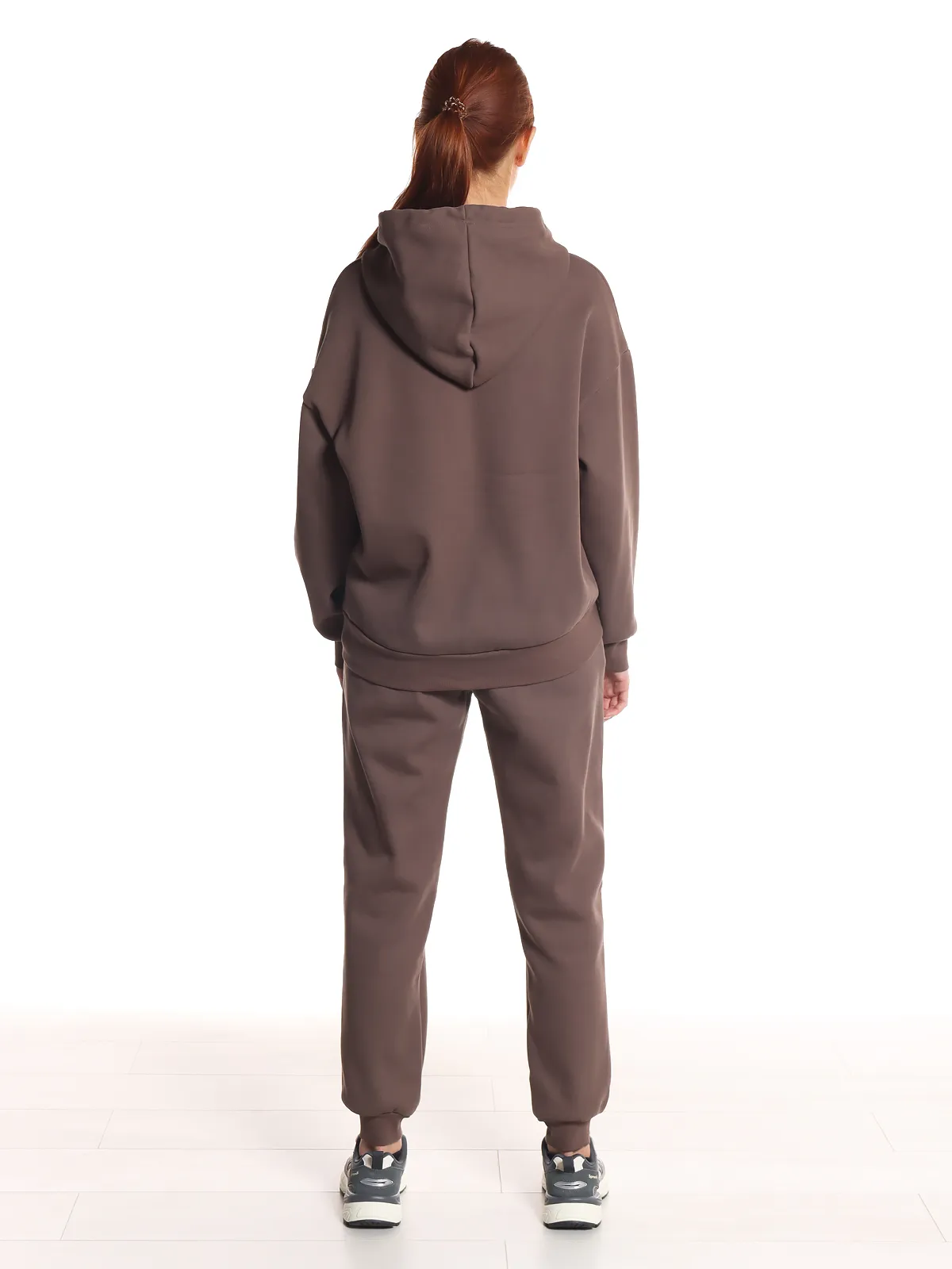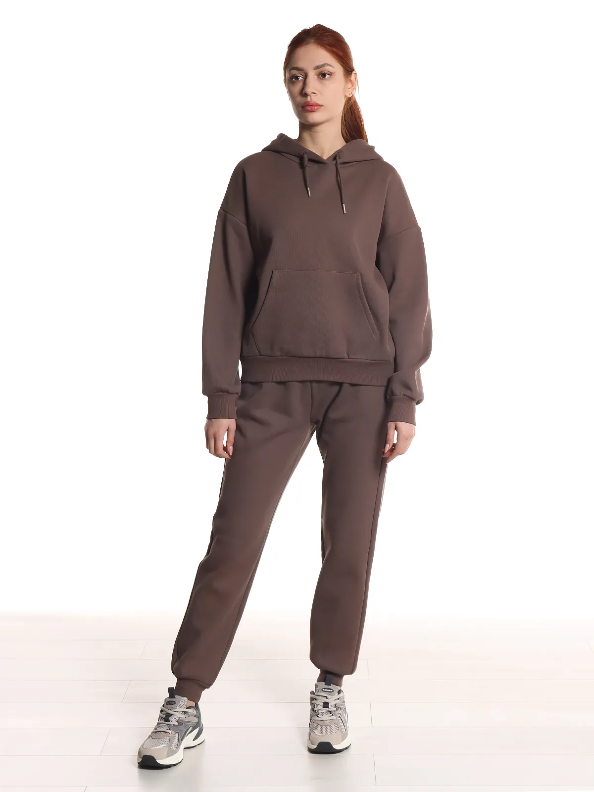 Худи оснащено капюшоном и удобным карманом-кенгуру, что делает его функциональным и практичным. Брюки имеют несколько карманов и эластичный пояс, обеспечивающий удобную посадку. На штанах и кофте предусмотрены манжеты, которые добавляют комфорта и защищают от холода.