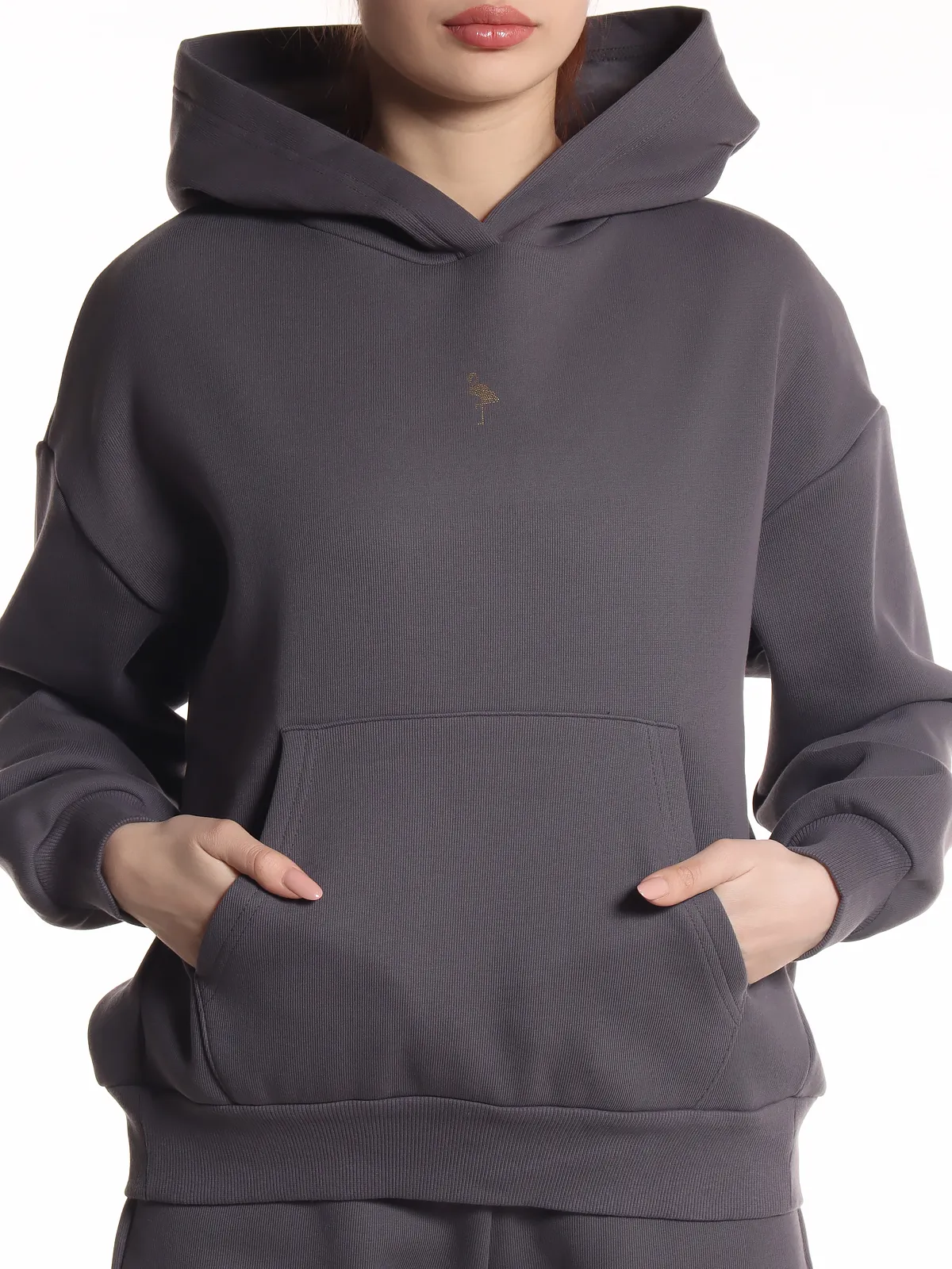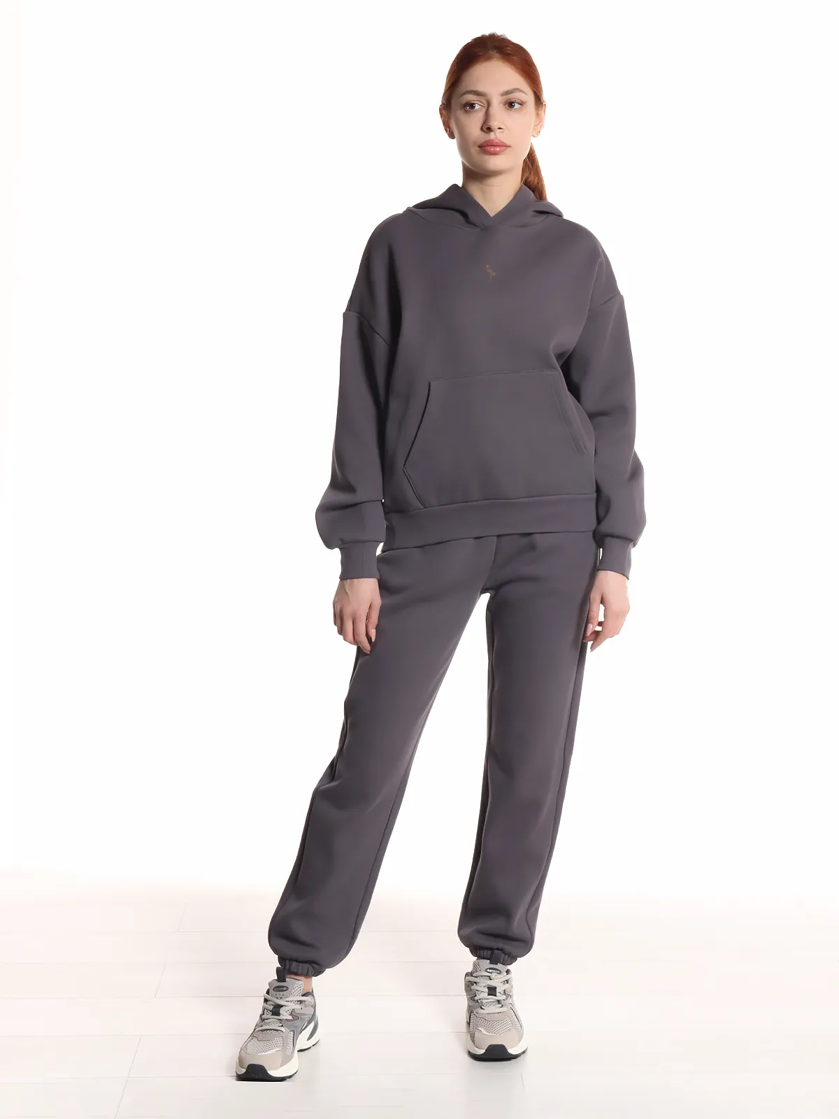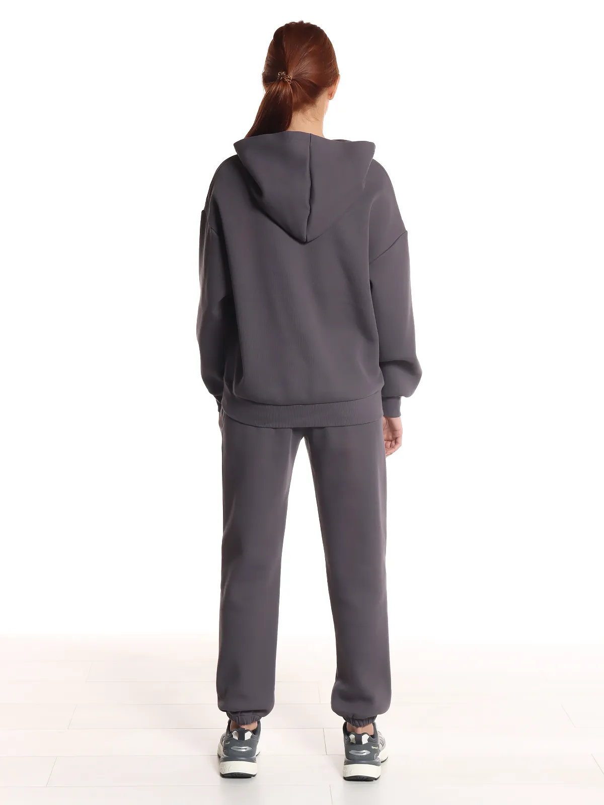 Худи оснащено капюшоном и удобным карманом-кенгуру, что делает его функциональным и практичным. Брюки имеют несколько карманов и эластичный пояс, обеспечивающий удобную посадку. На штанах и кофте предусмотрены манжеты, которые добавляют комфорта и защищают от холода.