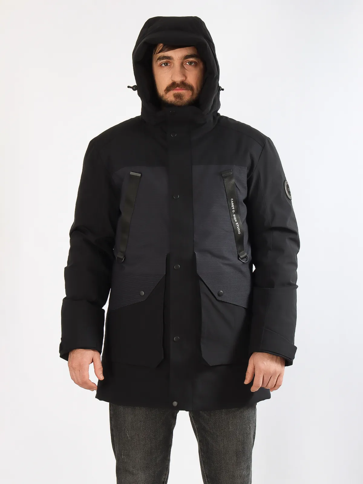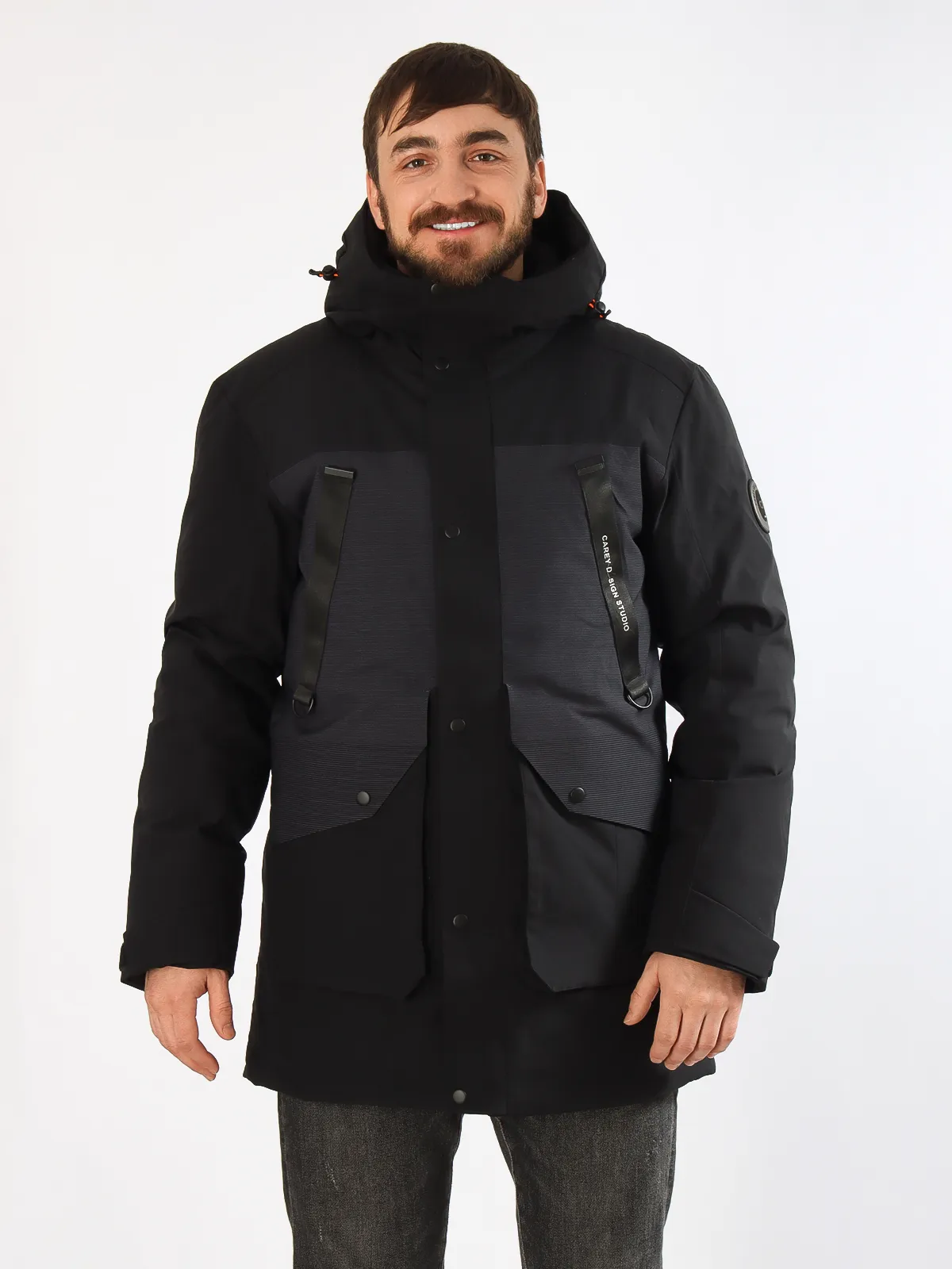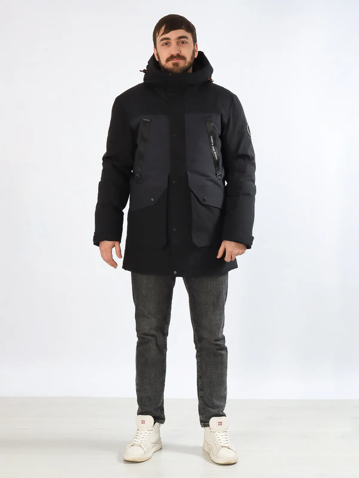 Куртка имеет удлиненный крой для дополнительной защиты от холода и высокий ветрозащитный воротник для удобства в холодную погоду.