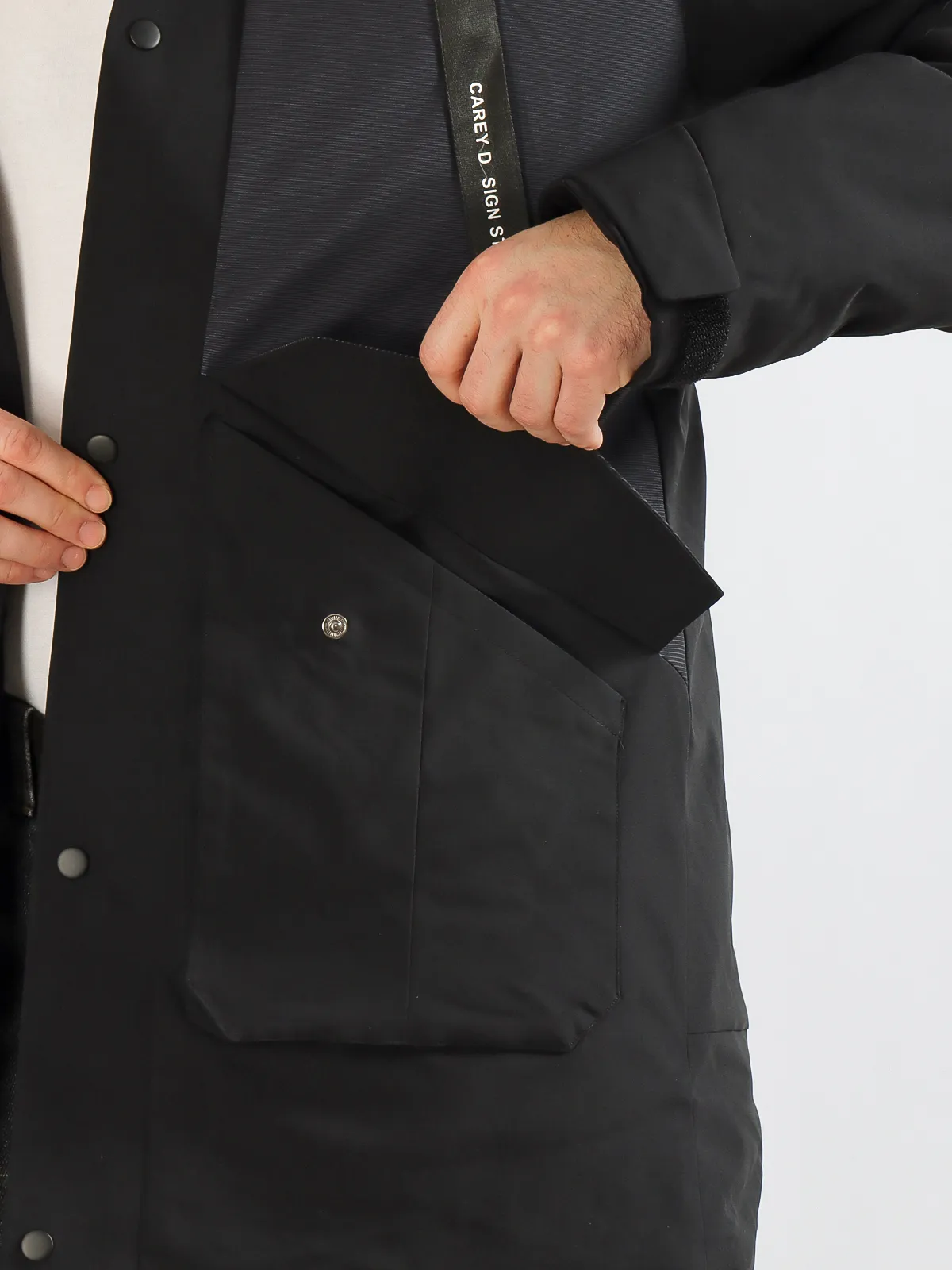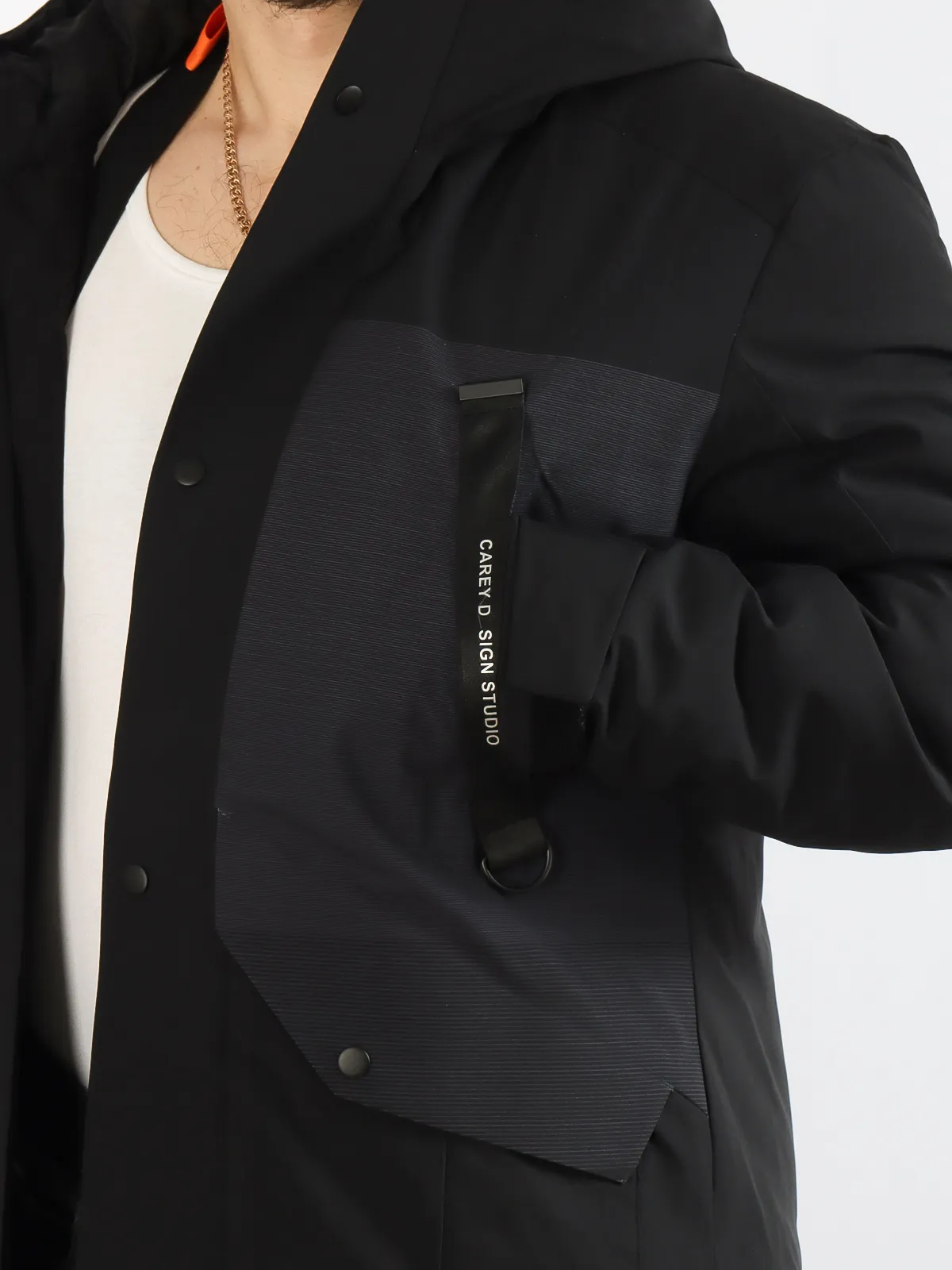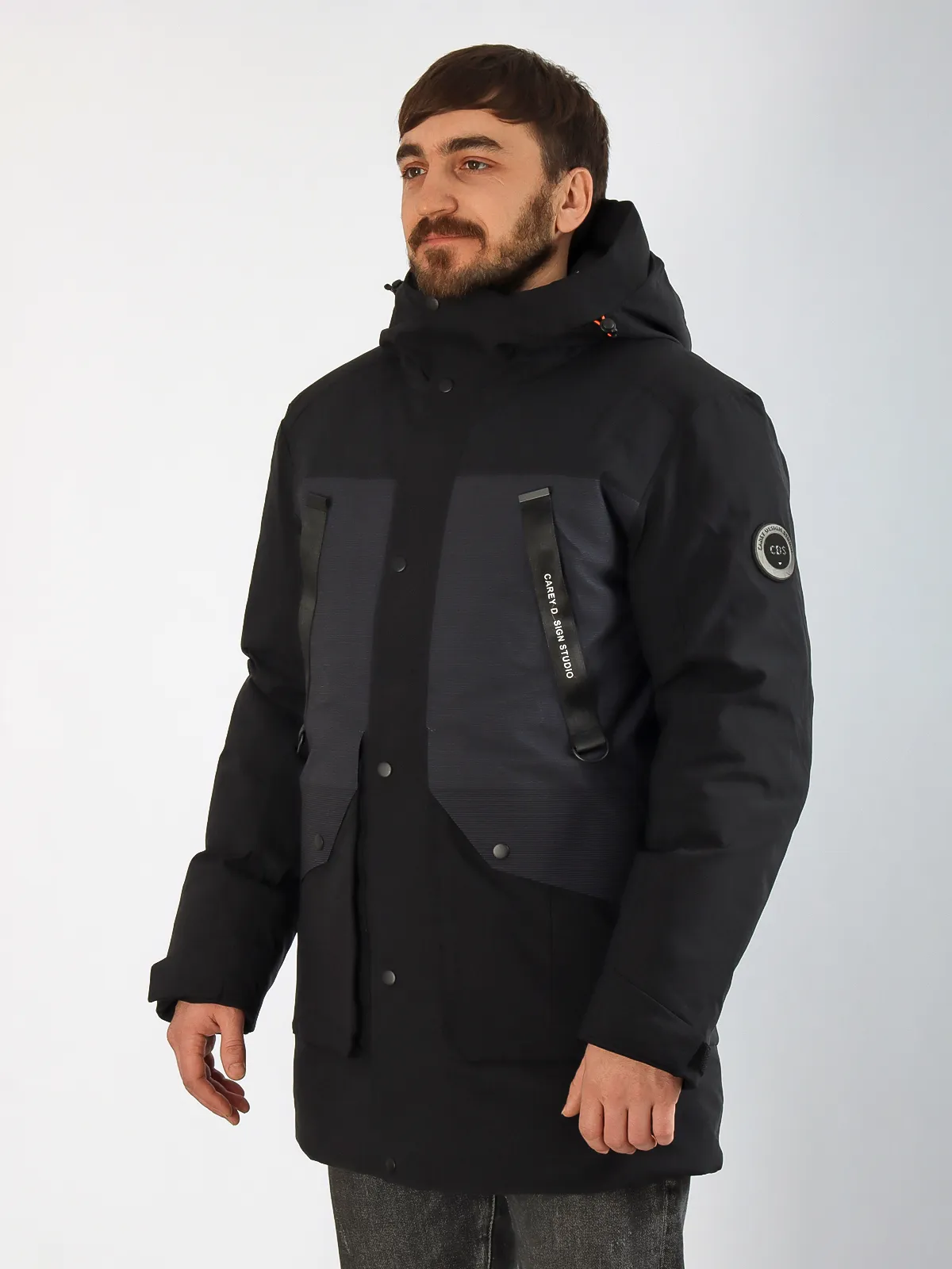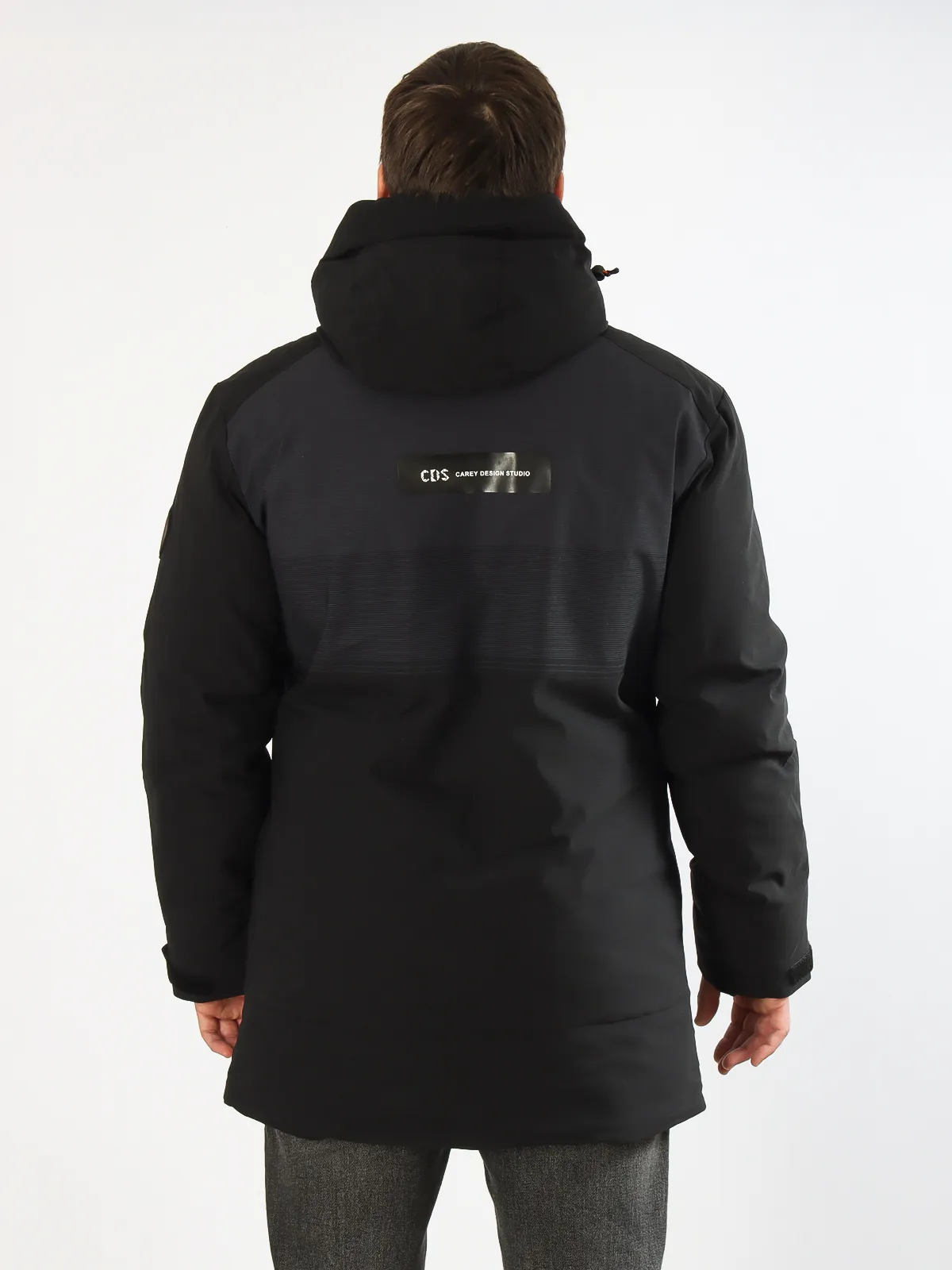 Куртка имеет удлиненный крой для дополнительной защиты от холода и высокий ветрозащитный воротник для удобства в холодную погоду.