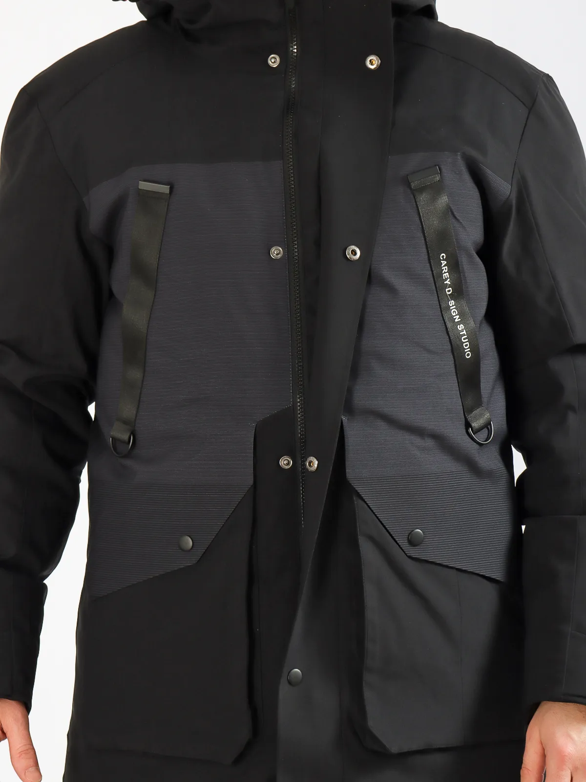 Несъемный регулируемый капюшон защищает от непогоды, а лямки позволяют снять куртку в помещении, не снимая её полностью, чтобы избежать перегрева.