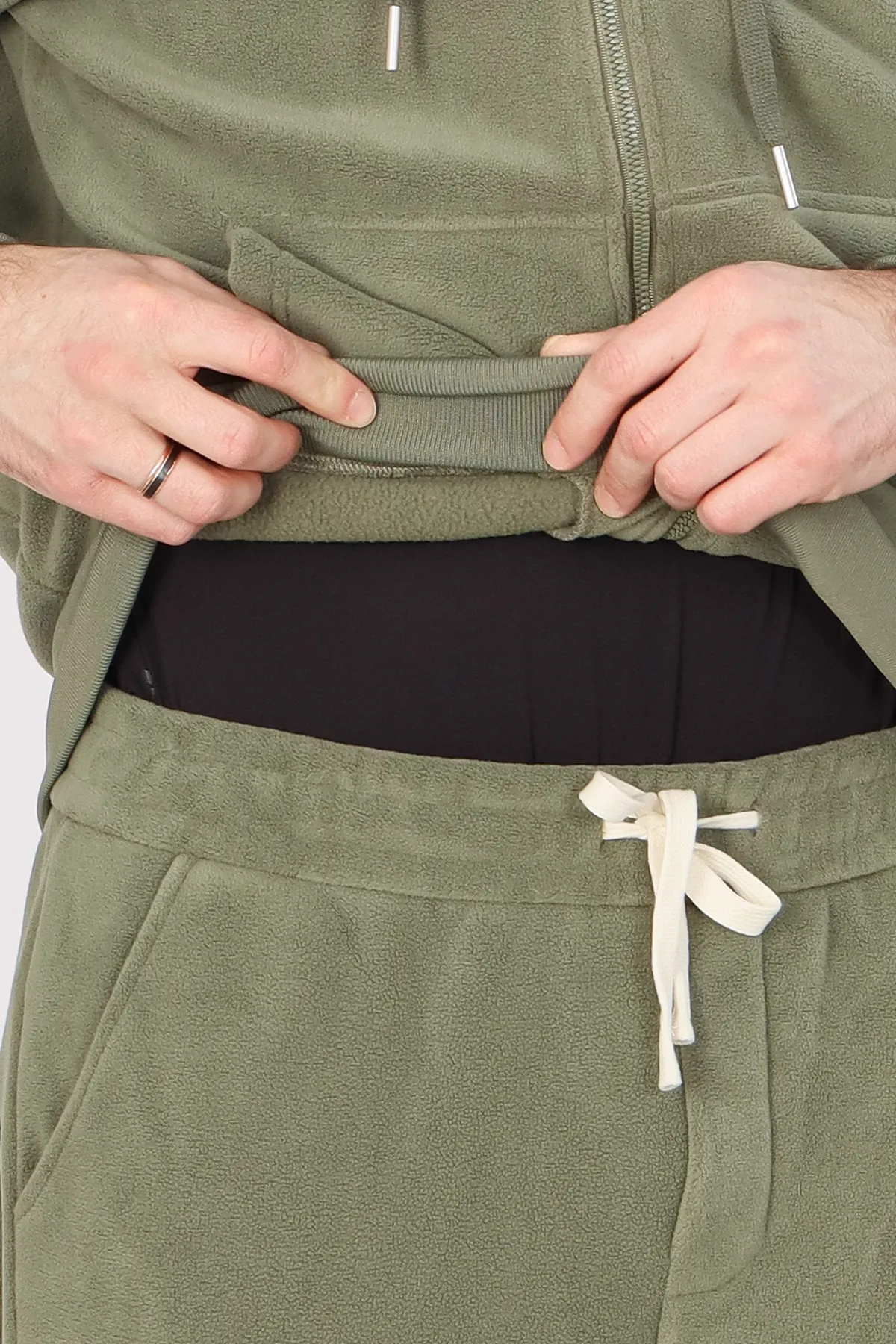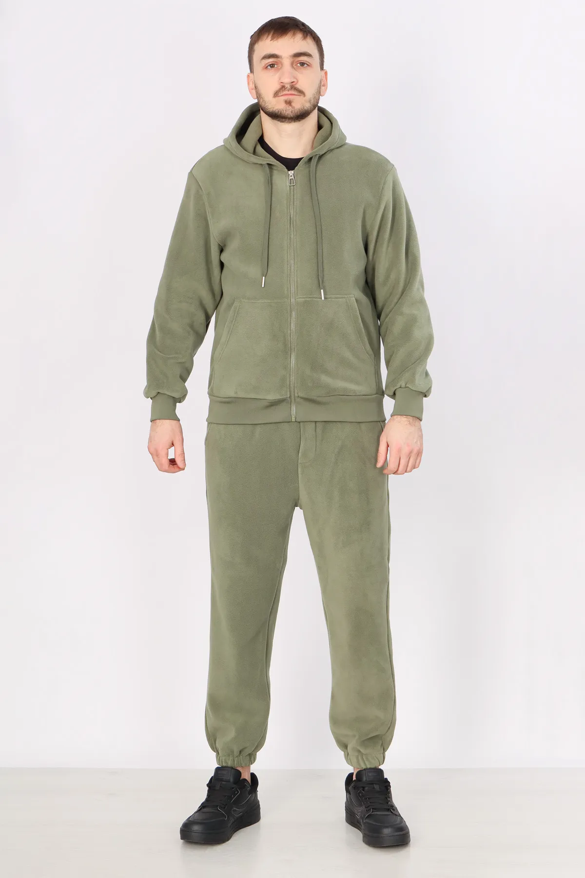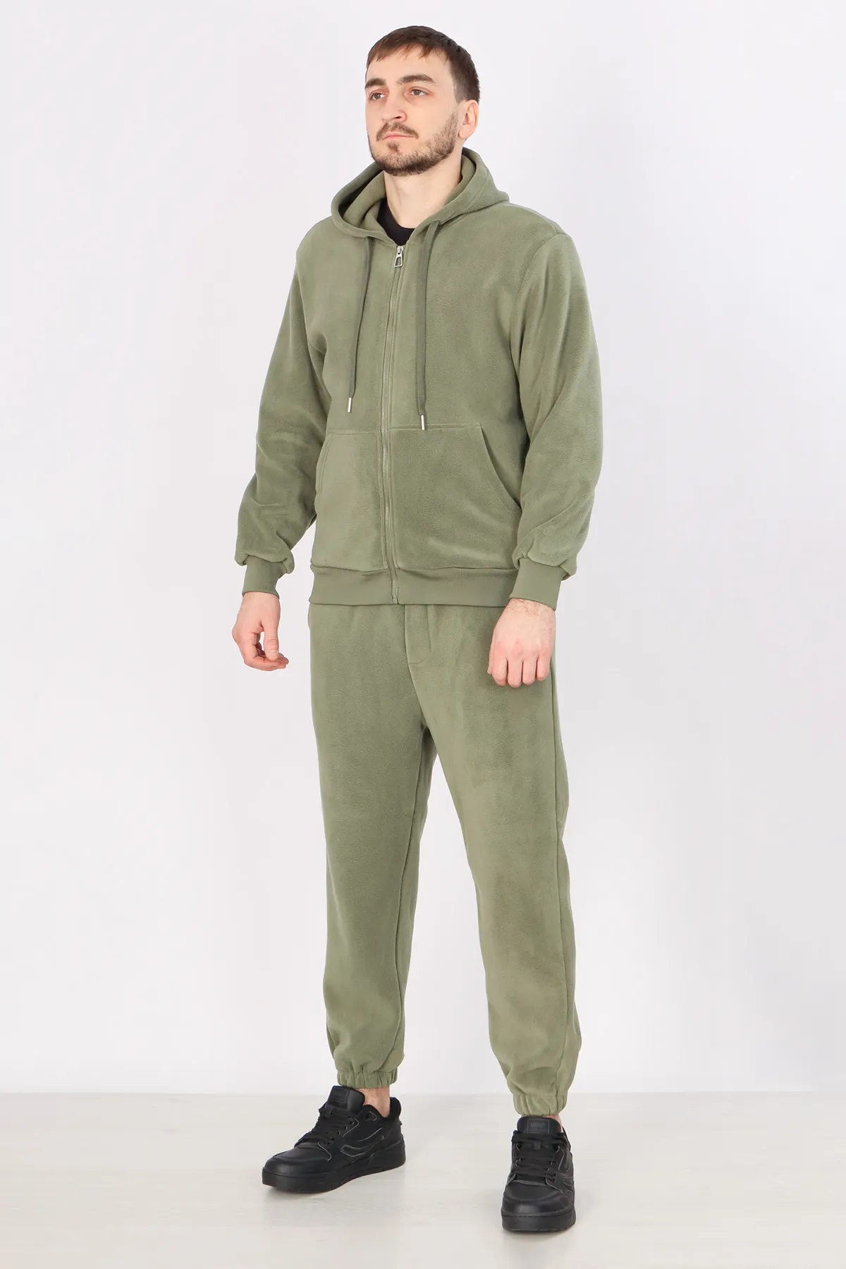 Комплект включает толстовку на молнии и брюки на манжетах. Толстовка выполнена из мягкого и теплого флиса, оснащена несъемным капюшоном и удобными карманами. Брюки имеют манжеты и регулируемую шнуровку, что обеспечивает идеальную посадку. На брюках также предусмотрены боковые и задний карманы для дополнительного удобства.