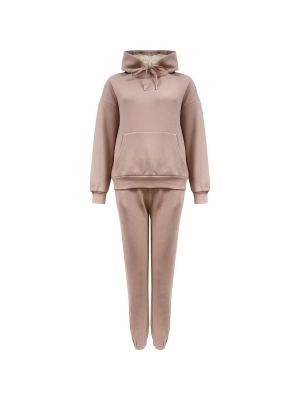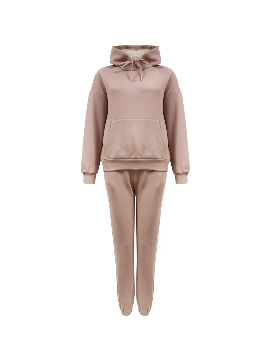 Спортивный женский костюм с начёсом, такой костюм отлично сидит на любом типе фигуры, он удобен и практичен! Брюки-джоггеры, низ худи и рукавов оформлены манжетами на резинке. Утеплитель - флис. Костюм из 100% хлопка.