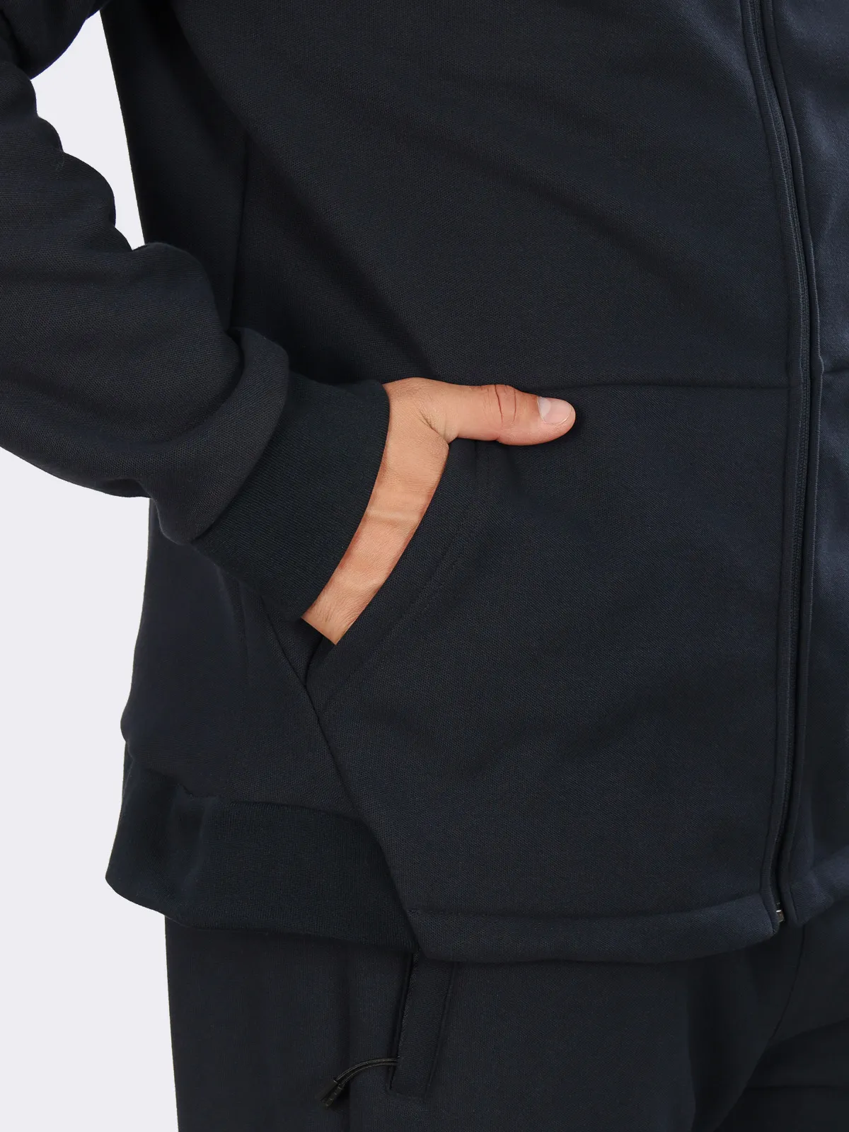Комплект включает толстовку на молнии с капюшоном и брюки прямого кроя. Толстовка оснащена удобными карманами, а брюки – карманами на молнии, что делает их практичными для хранения мелочей.