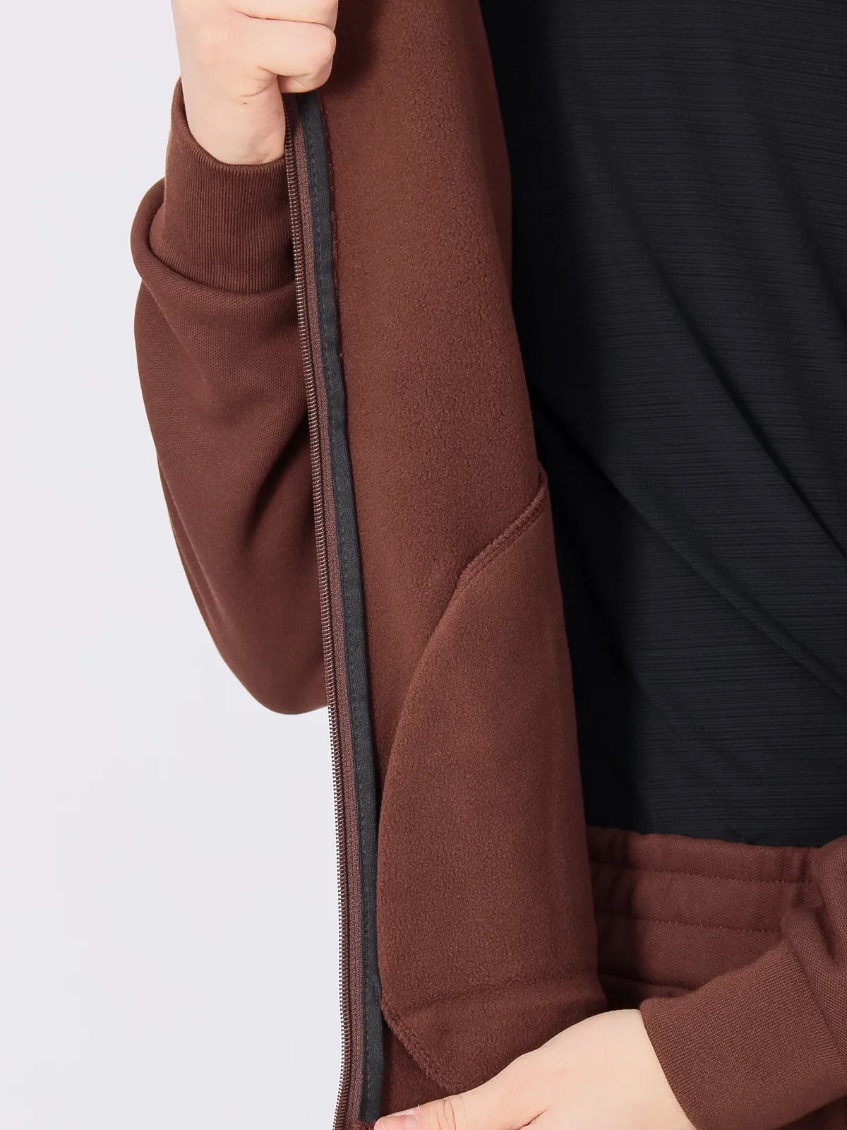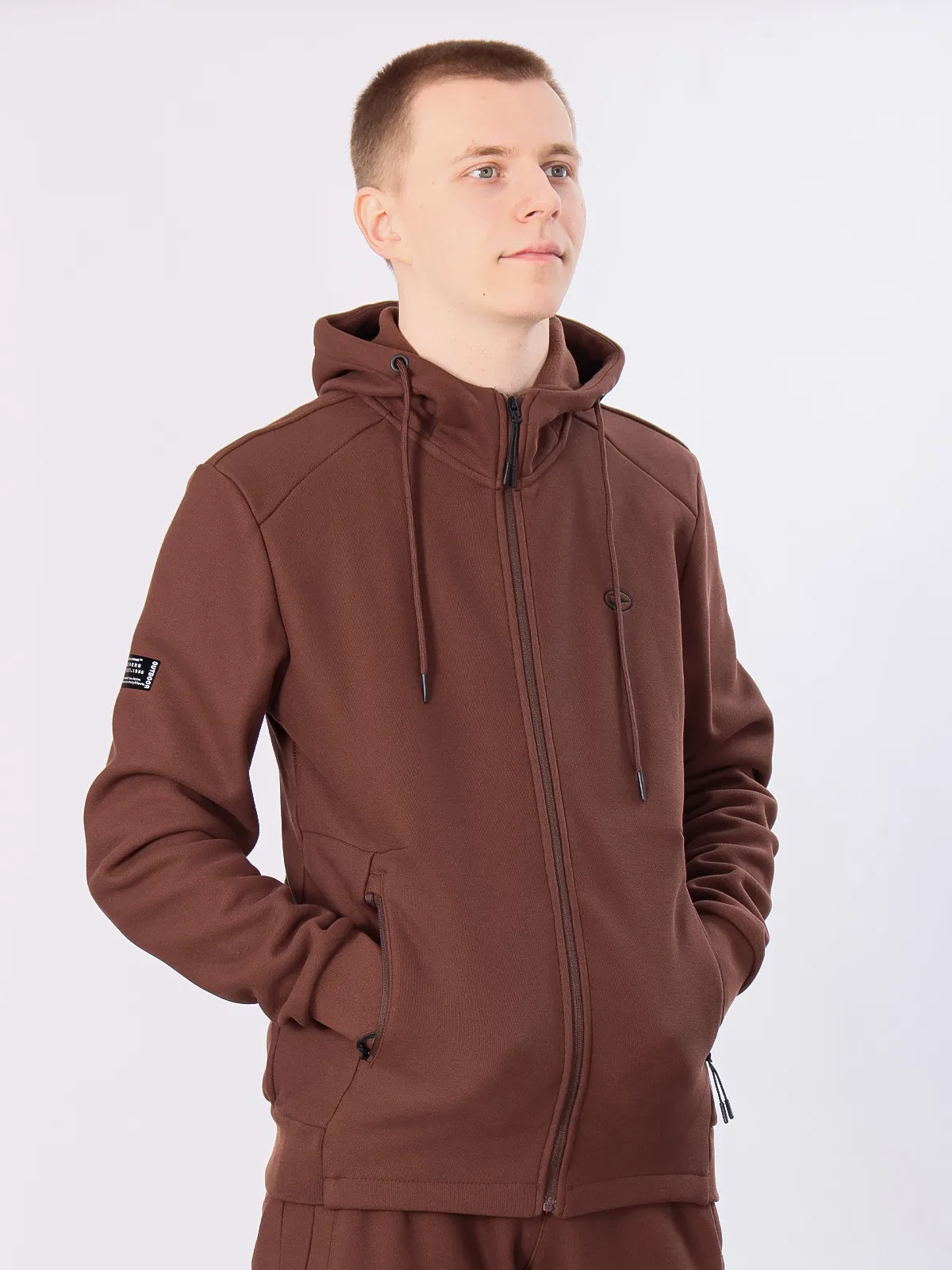 Худи на молнии с капюшоном оснащено карманами на молнии, что обеспечивает удобство и безопасность для хранения мелочей. Манжеты на худи и брюках выполнены из мягкого материала, что добавляет комфорта и сохраняет тепло.