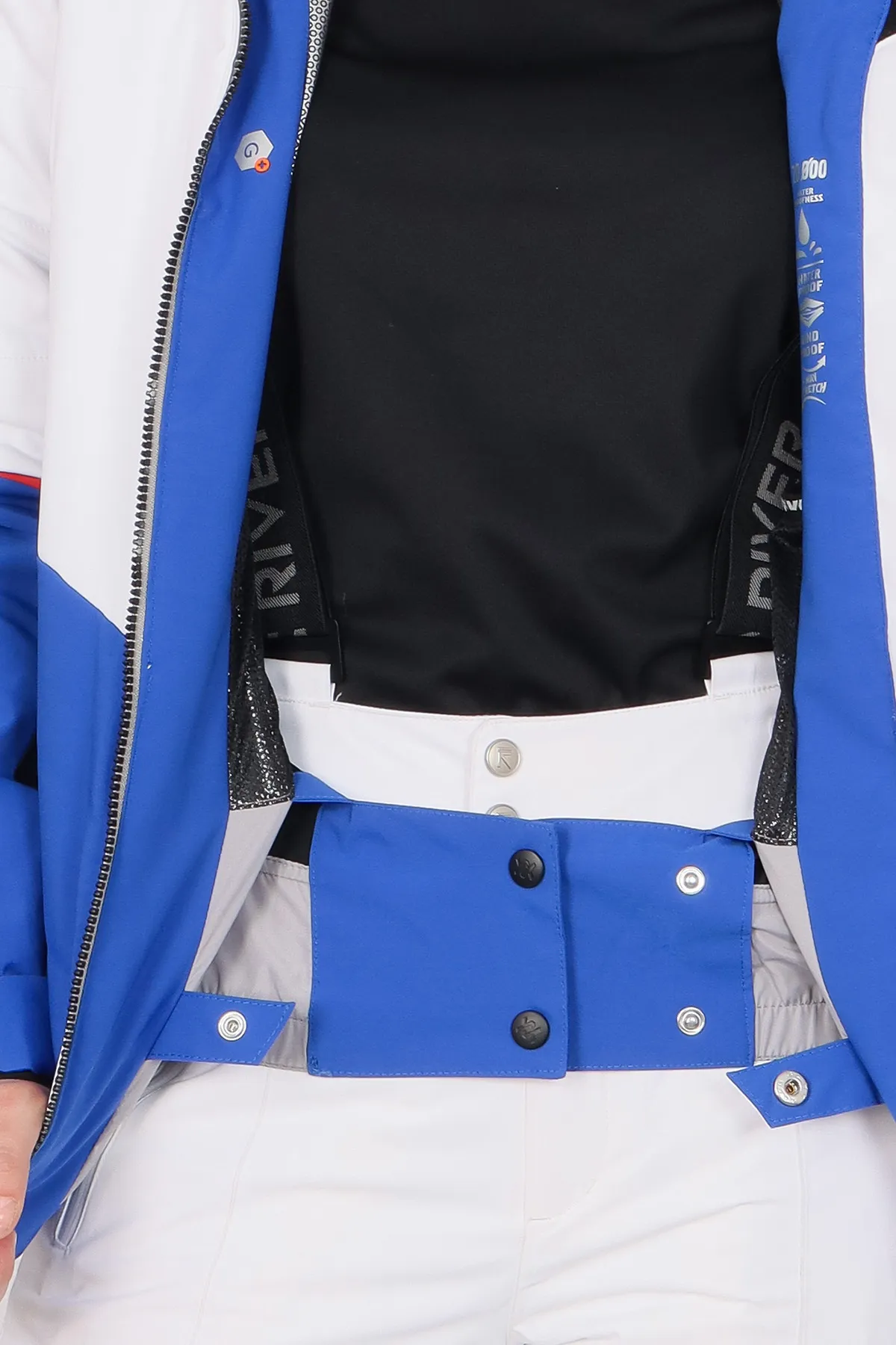 Боковые и внутренние карманы для хранения мелочей, а застежка молния облегчает надевание и снятие куртки. Снегозащитная юбка предотвращает попадание снега под куртку.
