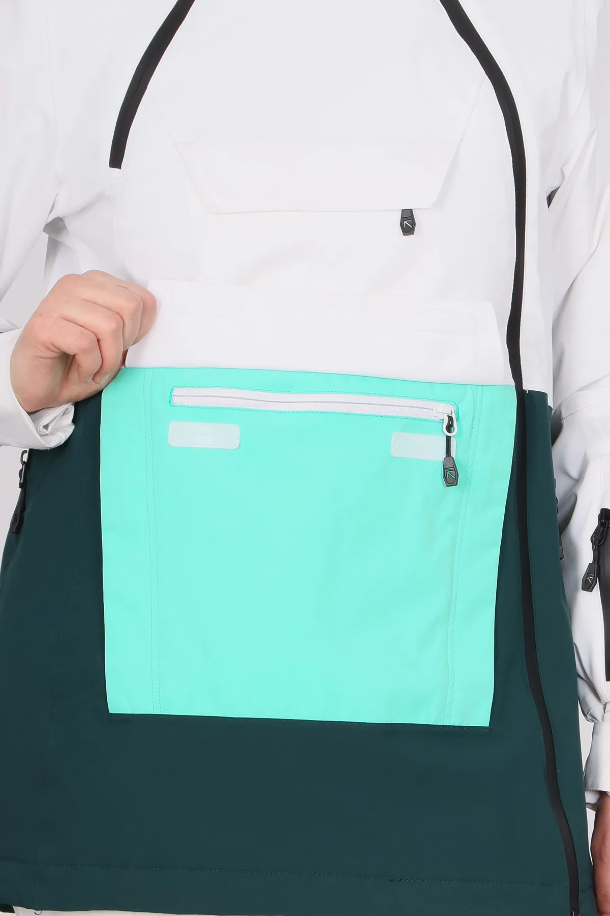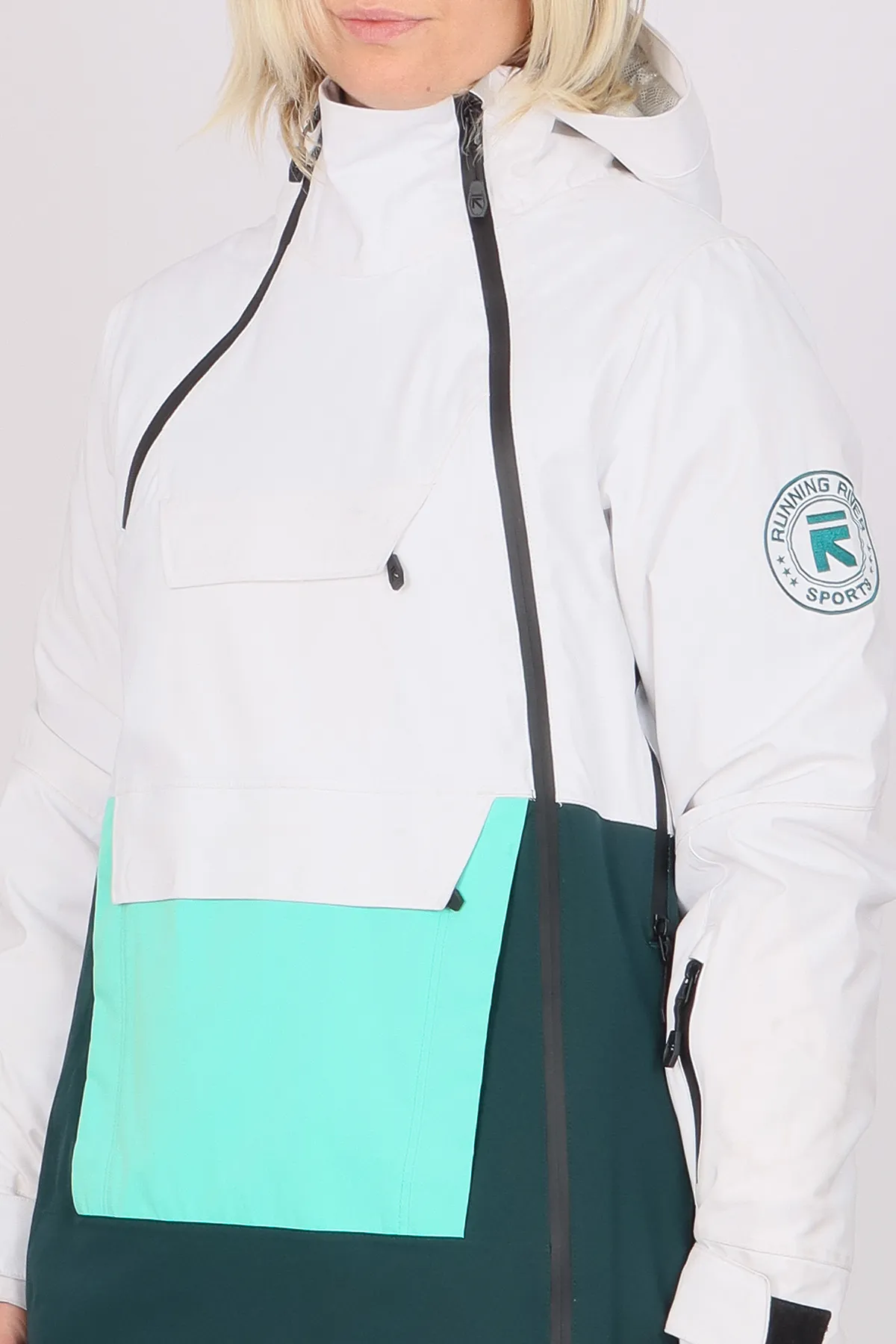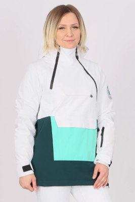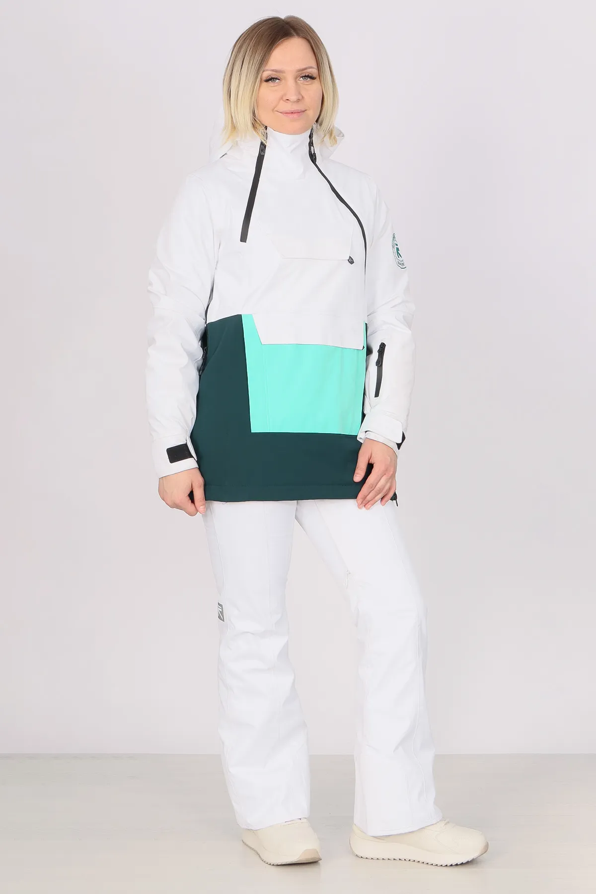 Сноубордический женский анорак фирмы RUNNING RIVER. Ткань обработана водоотталкивающей пропиткой снаружи и антибактериальной внутри. Водонепроницаемая мембрана обеспечивает превосходную защиту при мокром снеге или ледяном дожде и оперативно отводит влагу от тела наружу, сохраняя тепло и комфорт.
