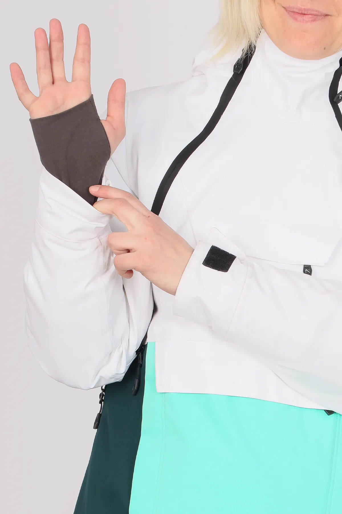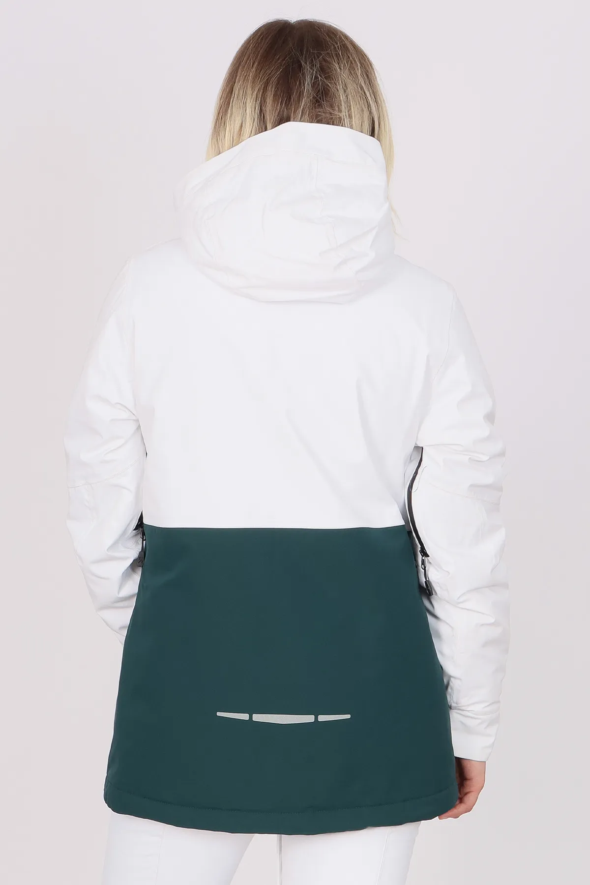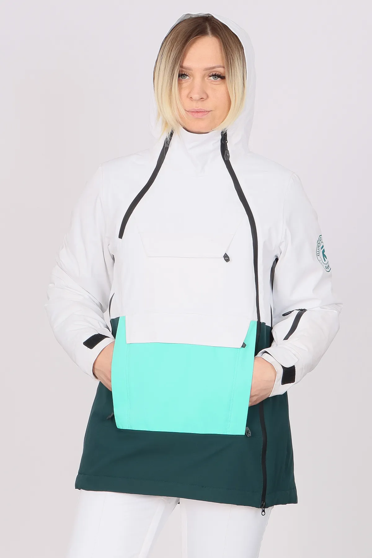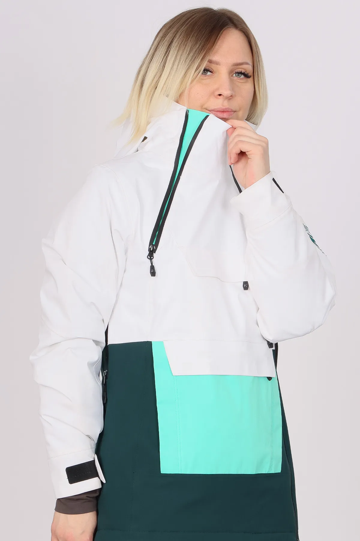 Сноубордический женский анорак фирмы RUNNING RIVER. Ткань обработана водоотталкивающей пропиткой снаружи и антибактериальной внутри. Водонепроницаемая мембрана обеспечивает превосходную защиту при мокром снеге или ледяном дожде и оперативно отводит влагу от тела наружу, сохраняя тепло и комфорт.