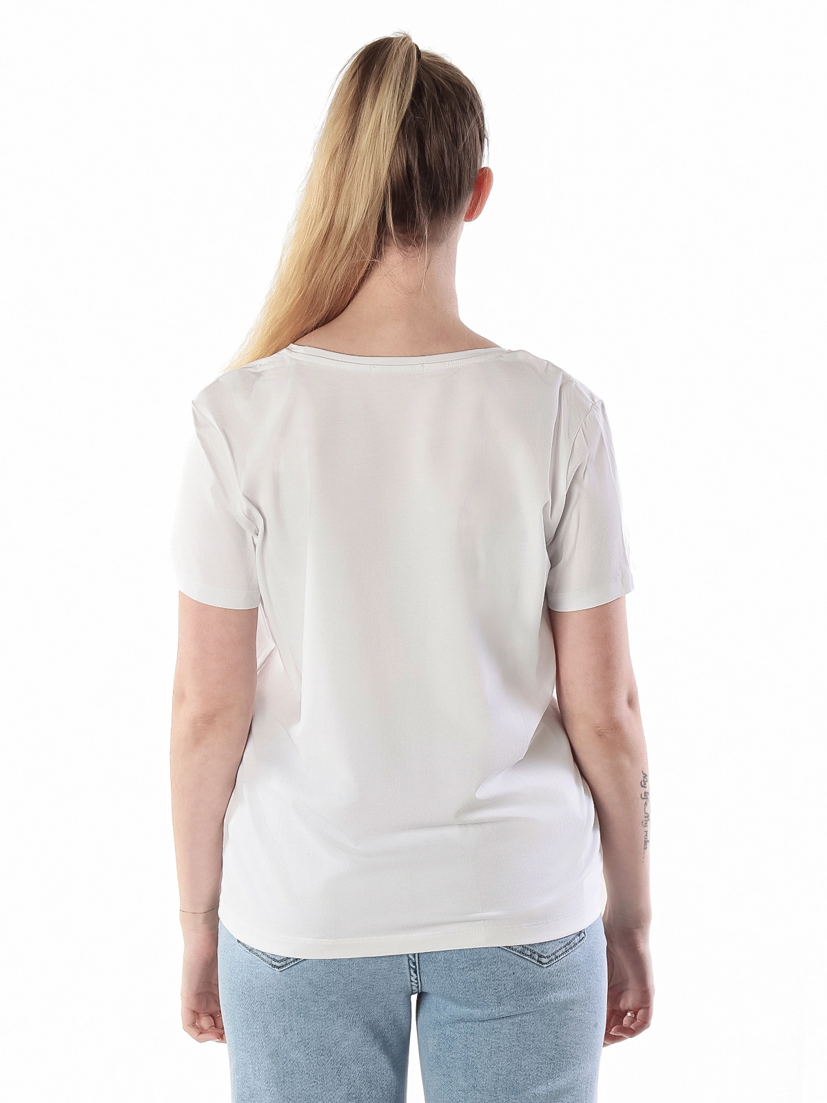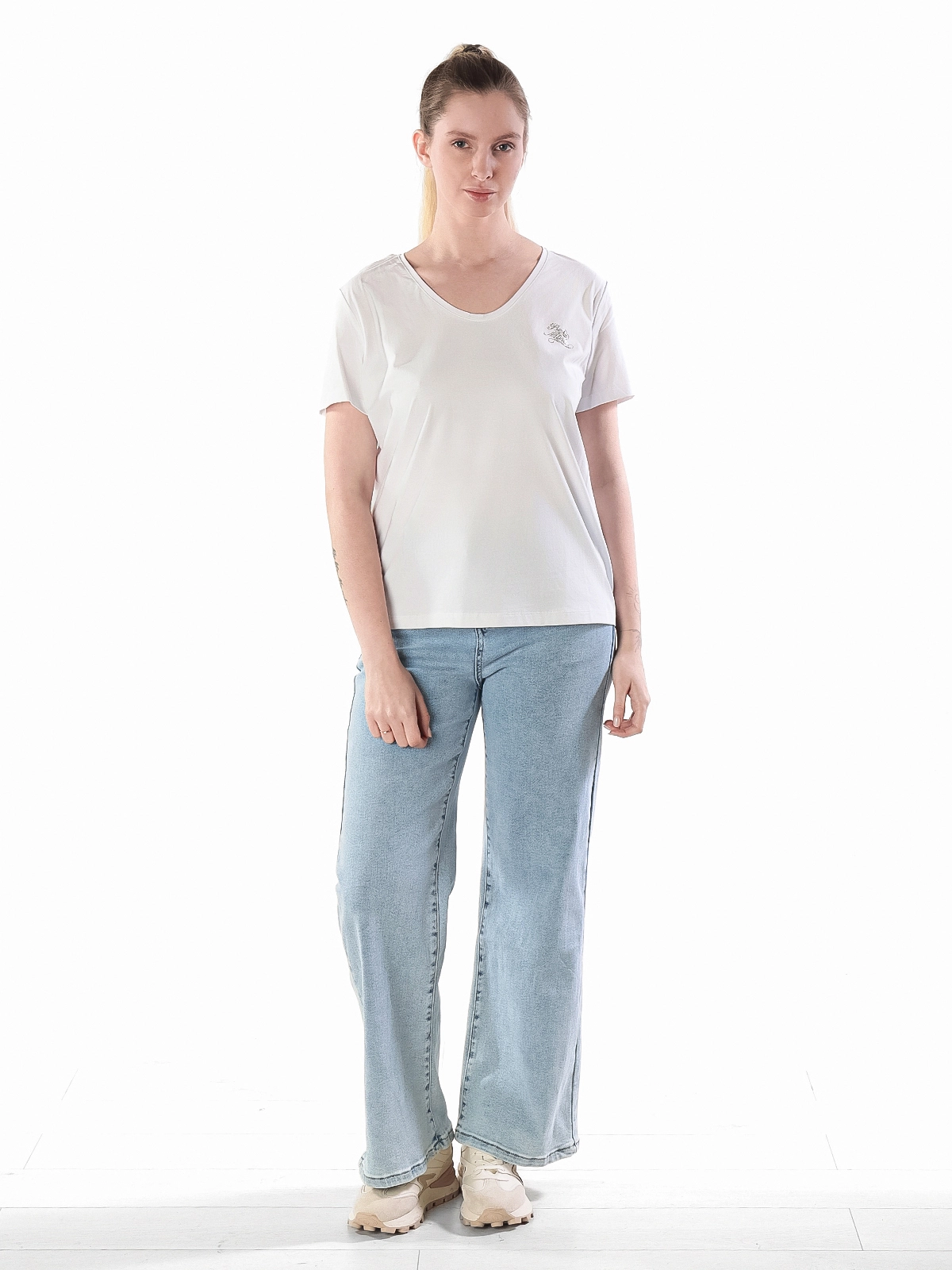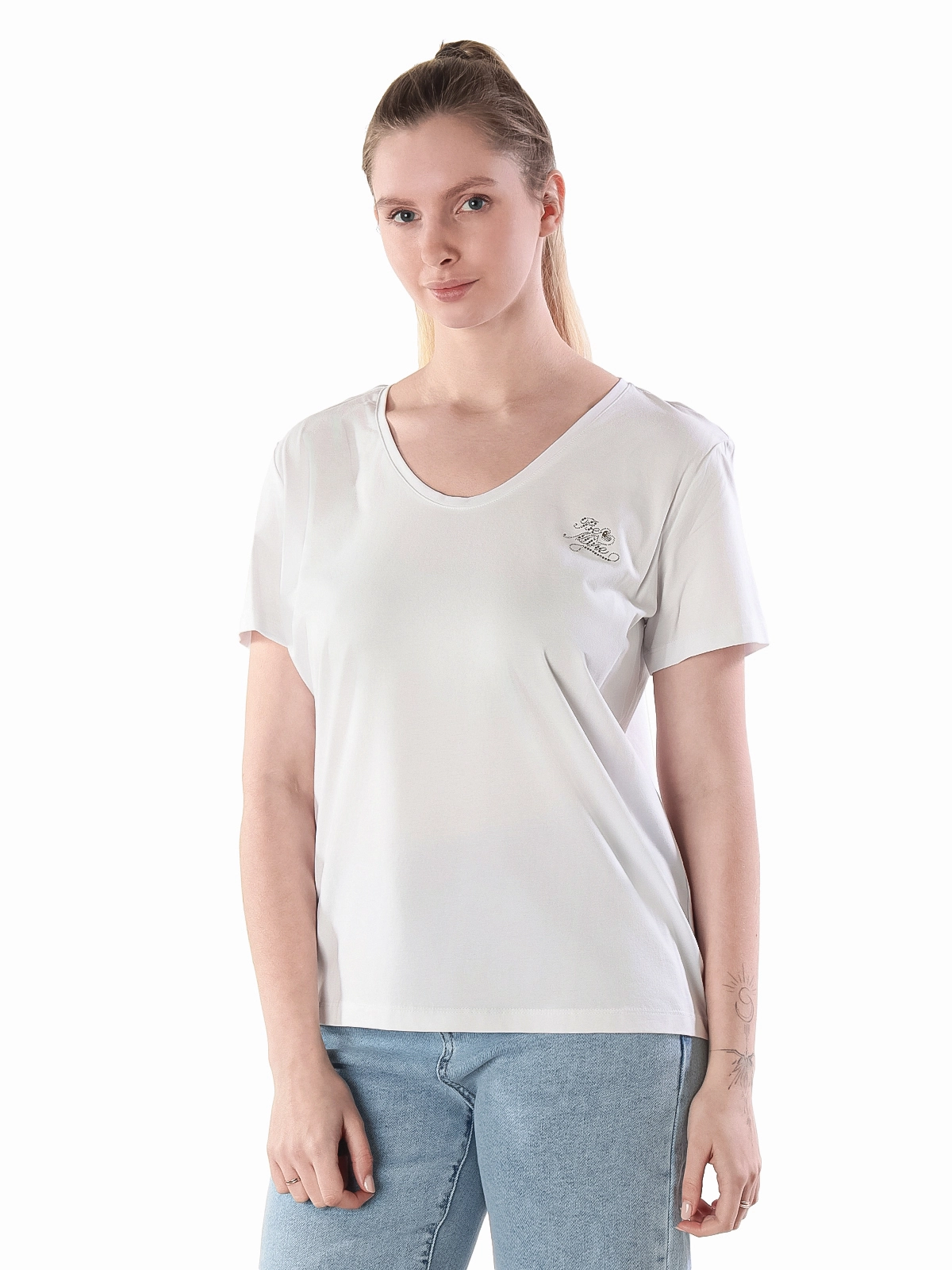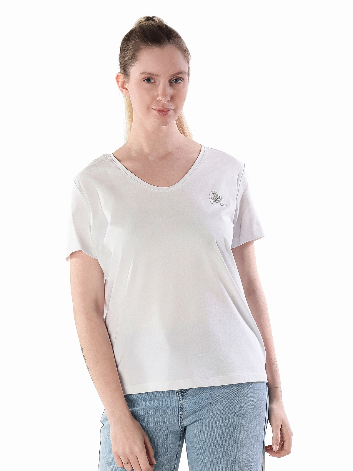 - Универсальность: благодаря V-образному вырезу и лаконичному дизайну, эту футболку легко сочетать с различными элементами гардероба, создавая образы для разных случаев.