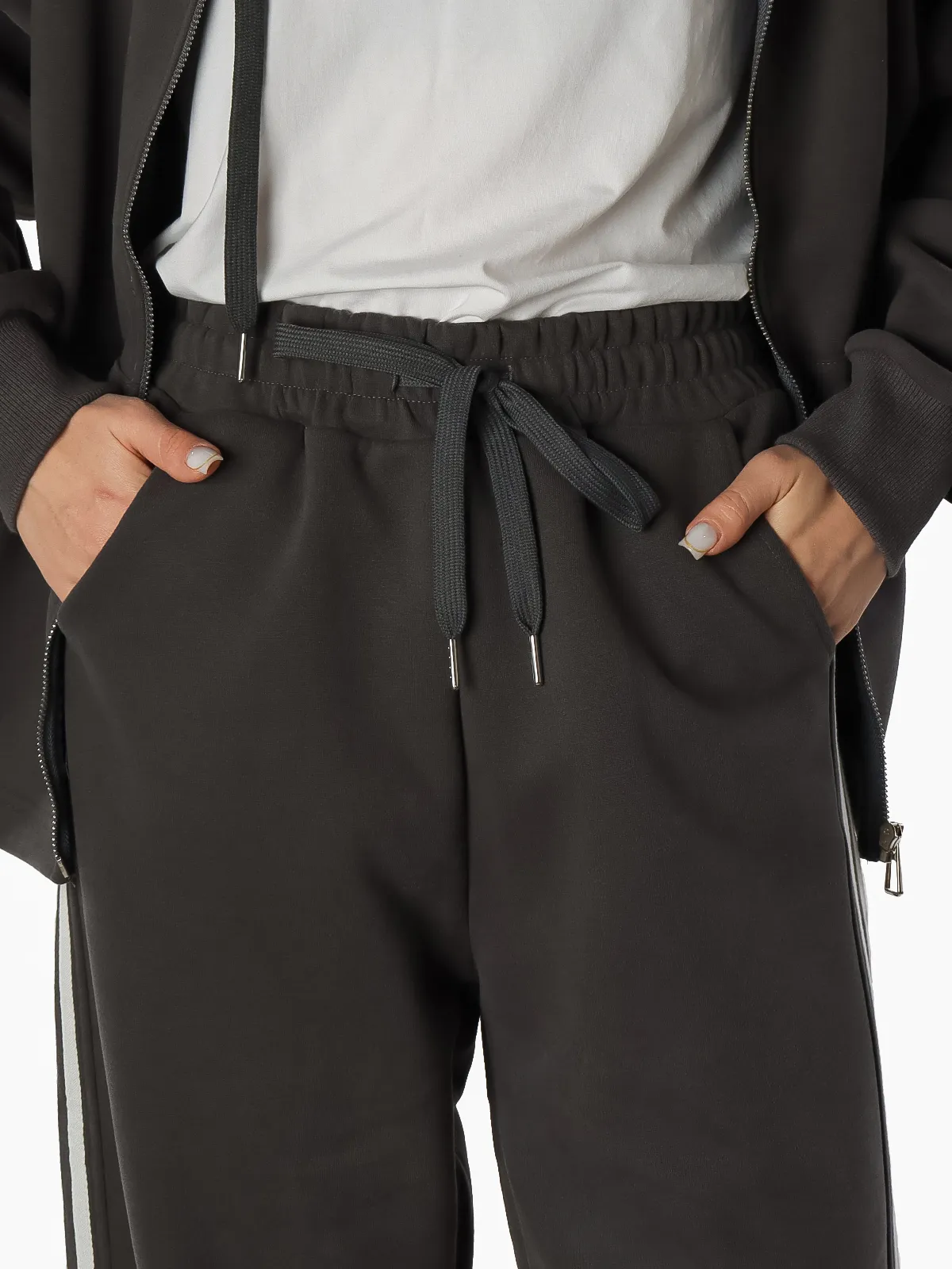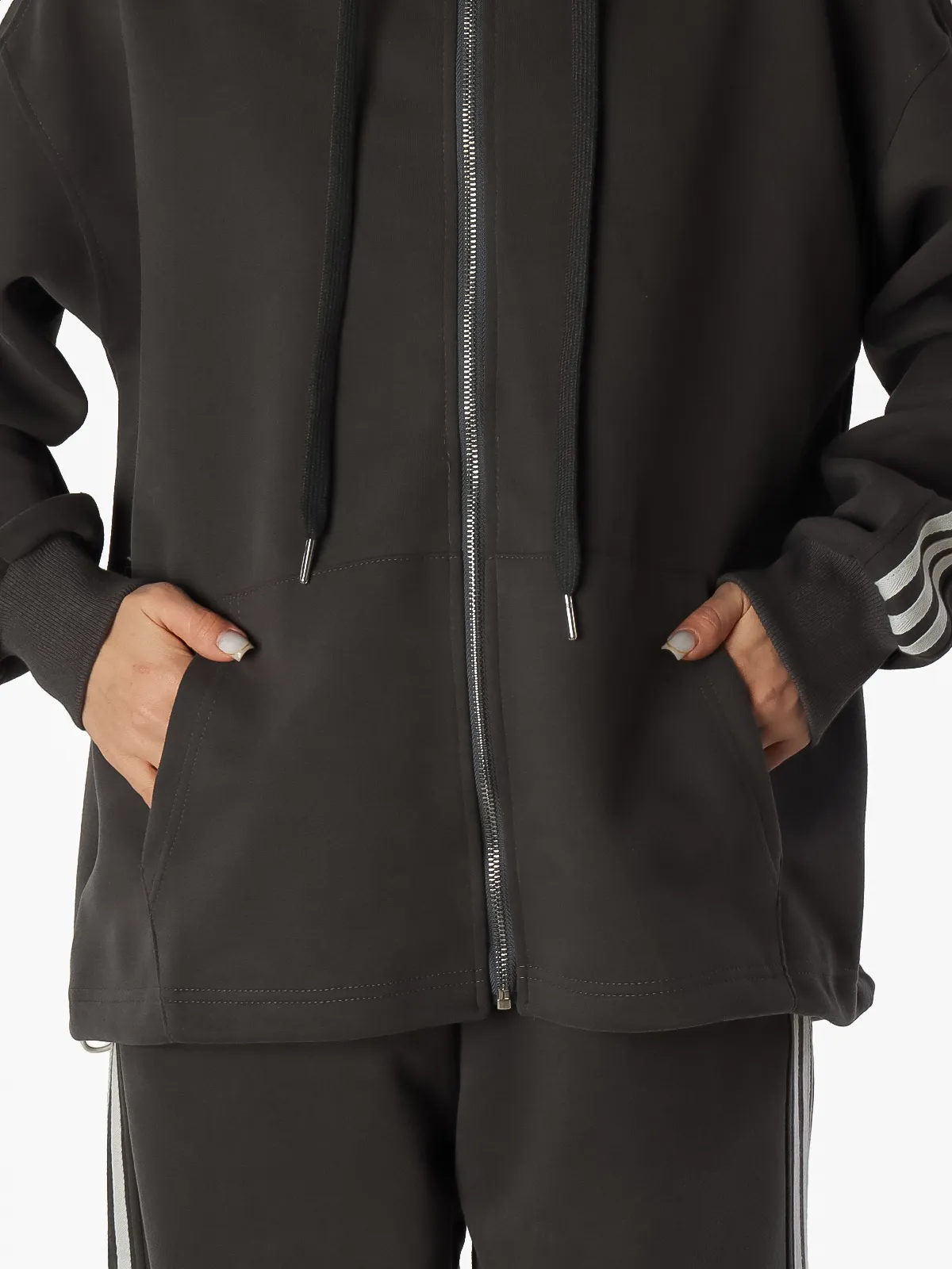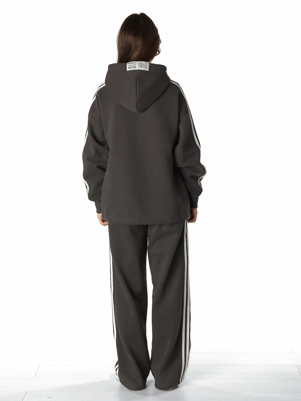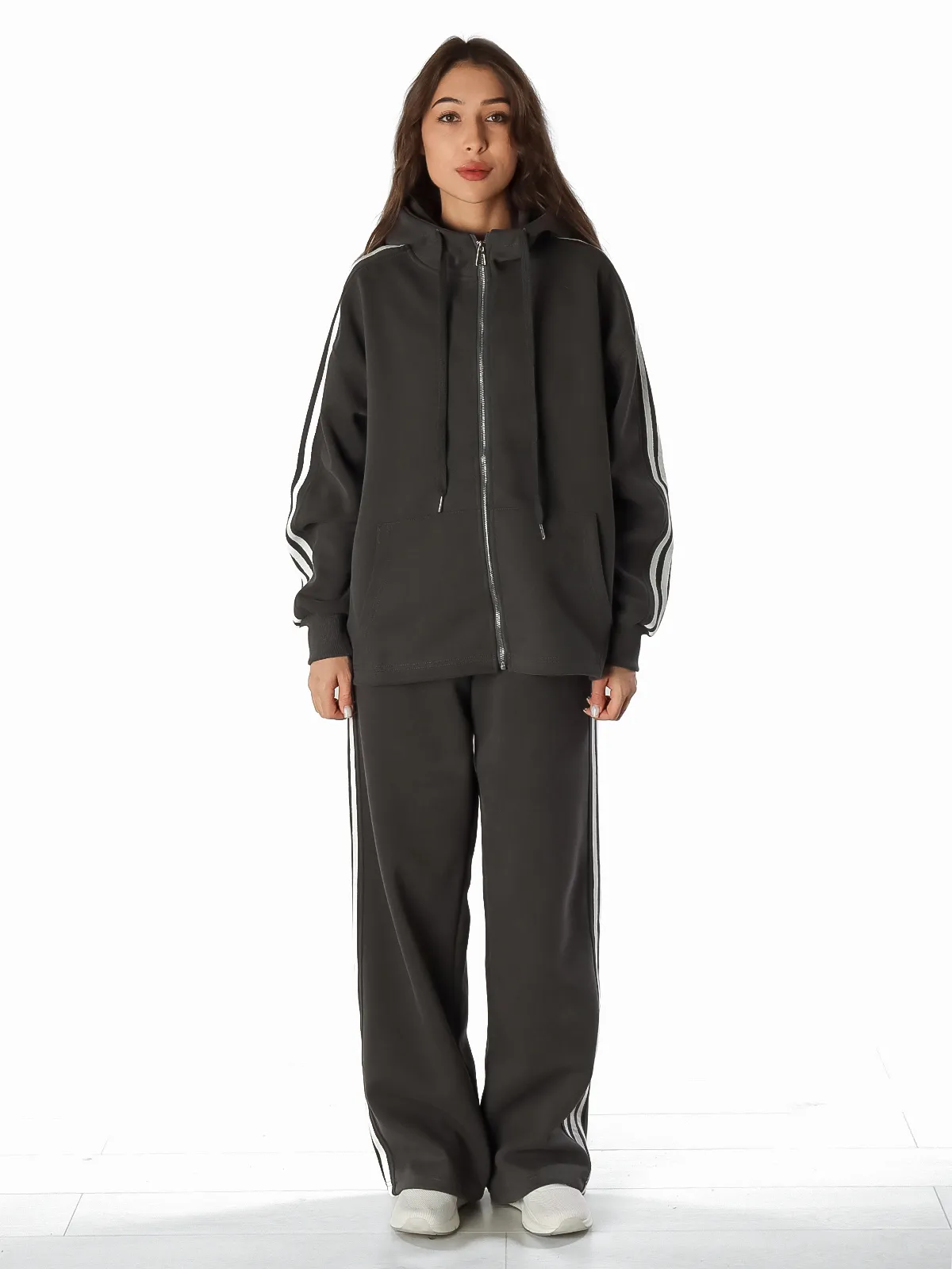 Толстовка на молнии с капюшоном оснащена удобными боковыми карманами и мягкими манжетами, что делает ее практичной и уютной. Широкие брюки также имеют боковые карманы, а пояс на эластичной резинке регулируется шнурком для идеальной посадки.