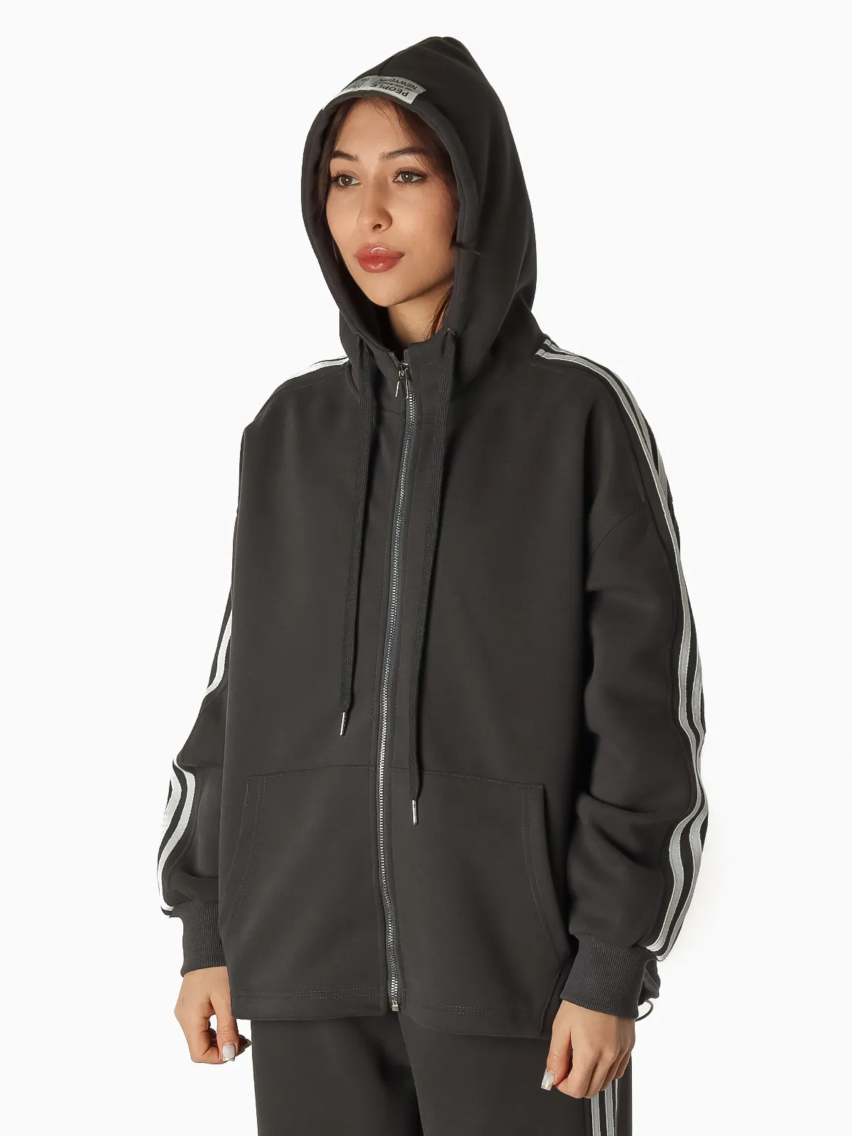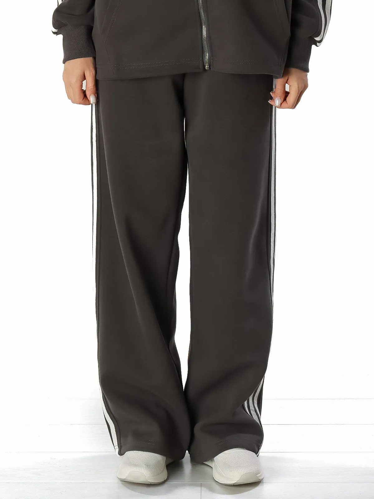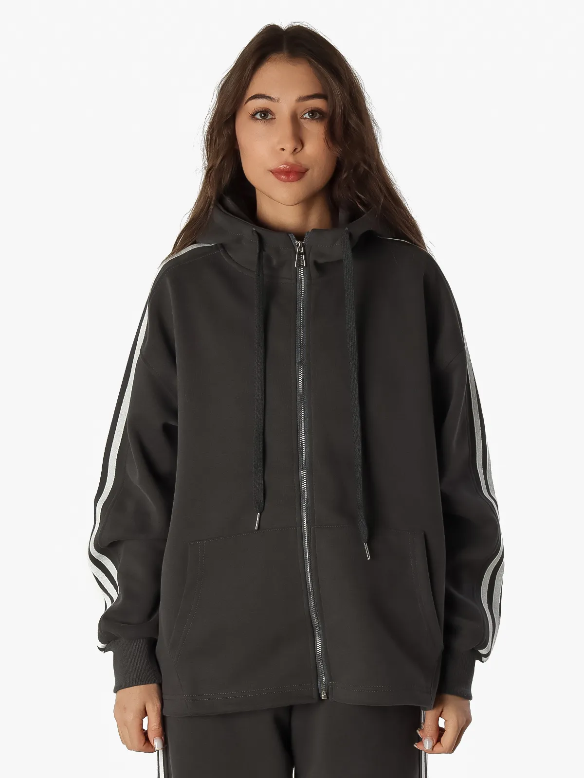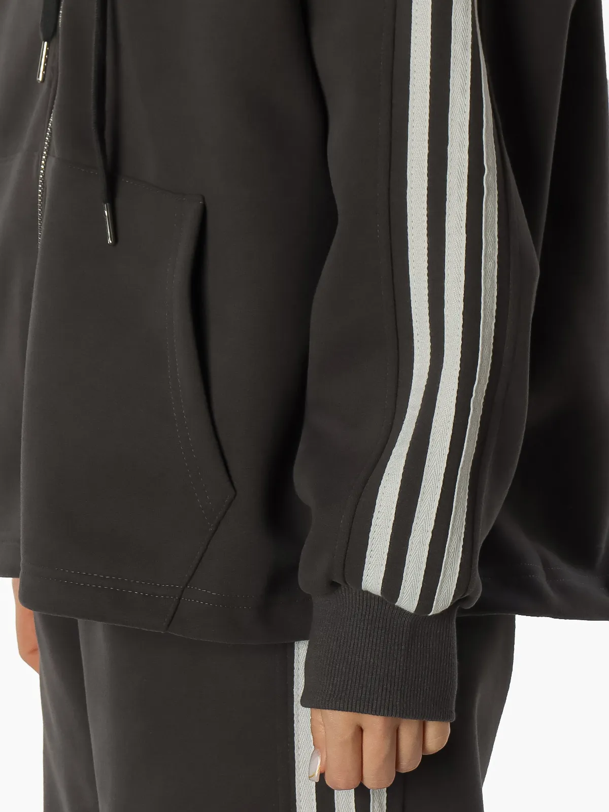 Толстовка на молнии с капюшоном оснащена удобными боковыми карманами и мягкими манжетами, что делает ее практичной и уютной. Широкие брюки также имеют боковые карманы, а пояс на эластичной резинке регулируется шнурком для идеальной посадки.