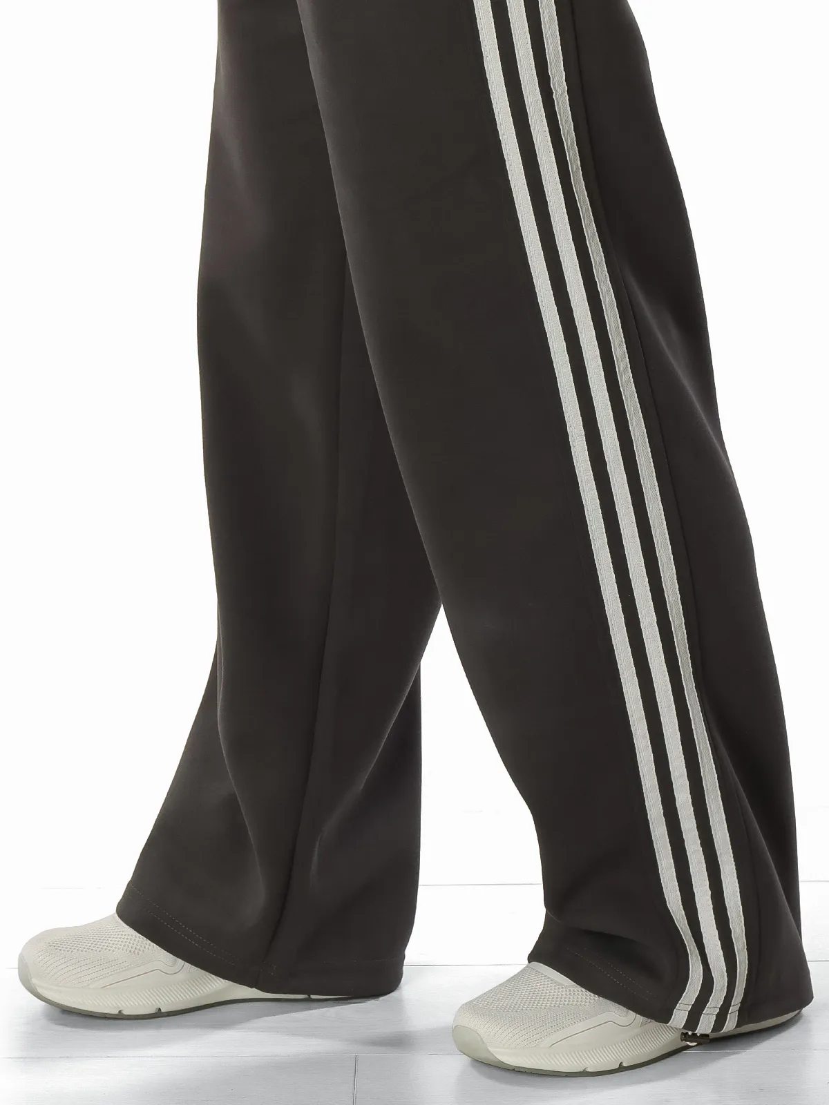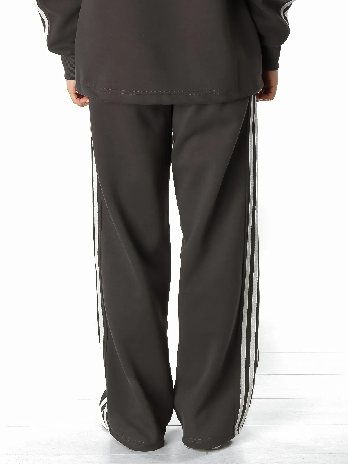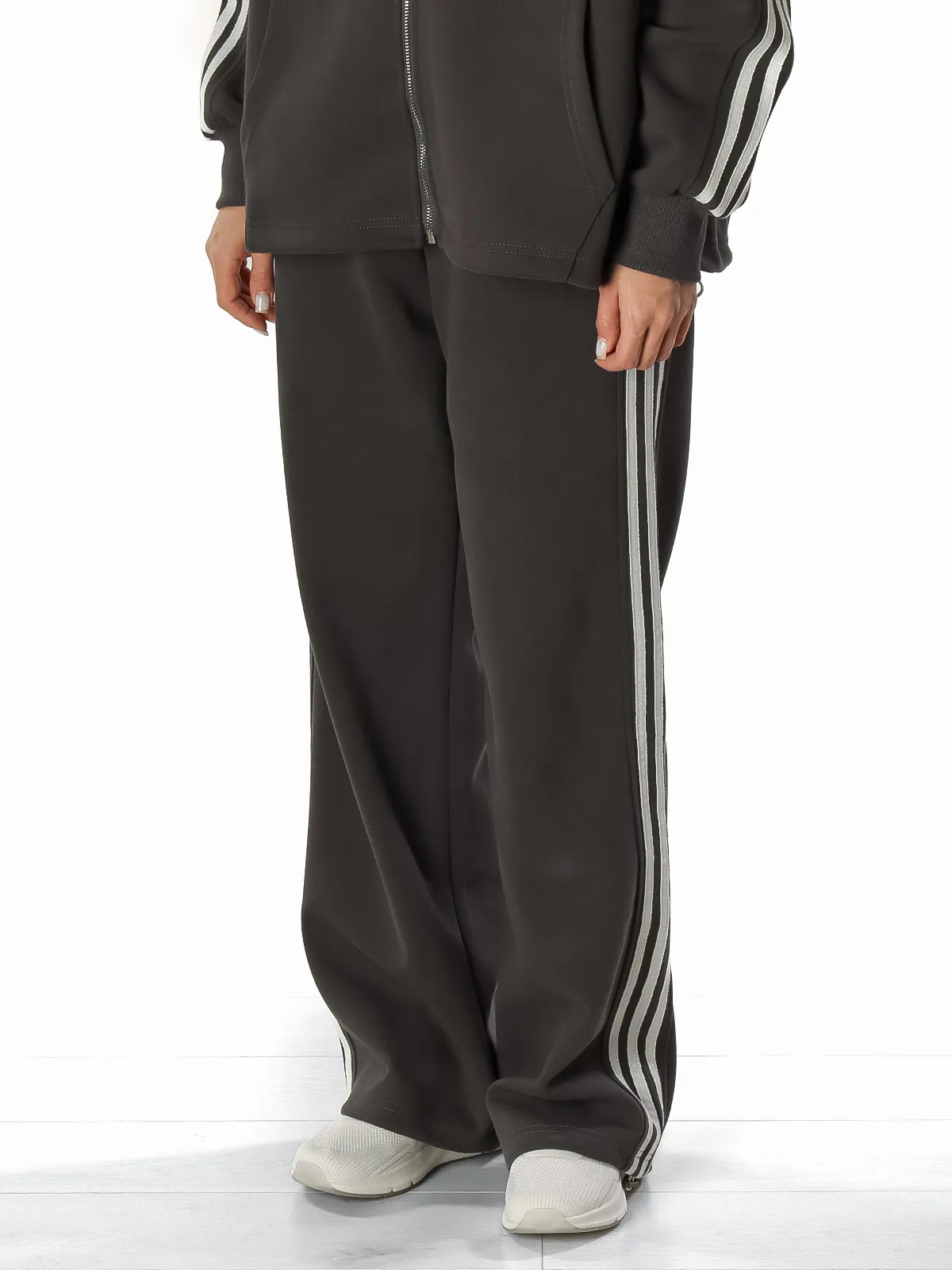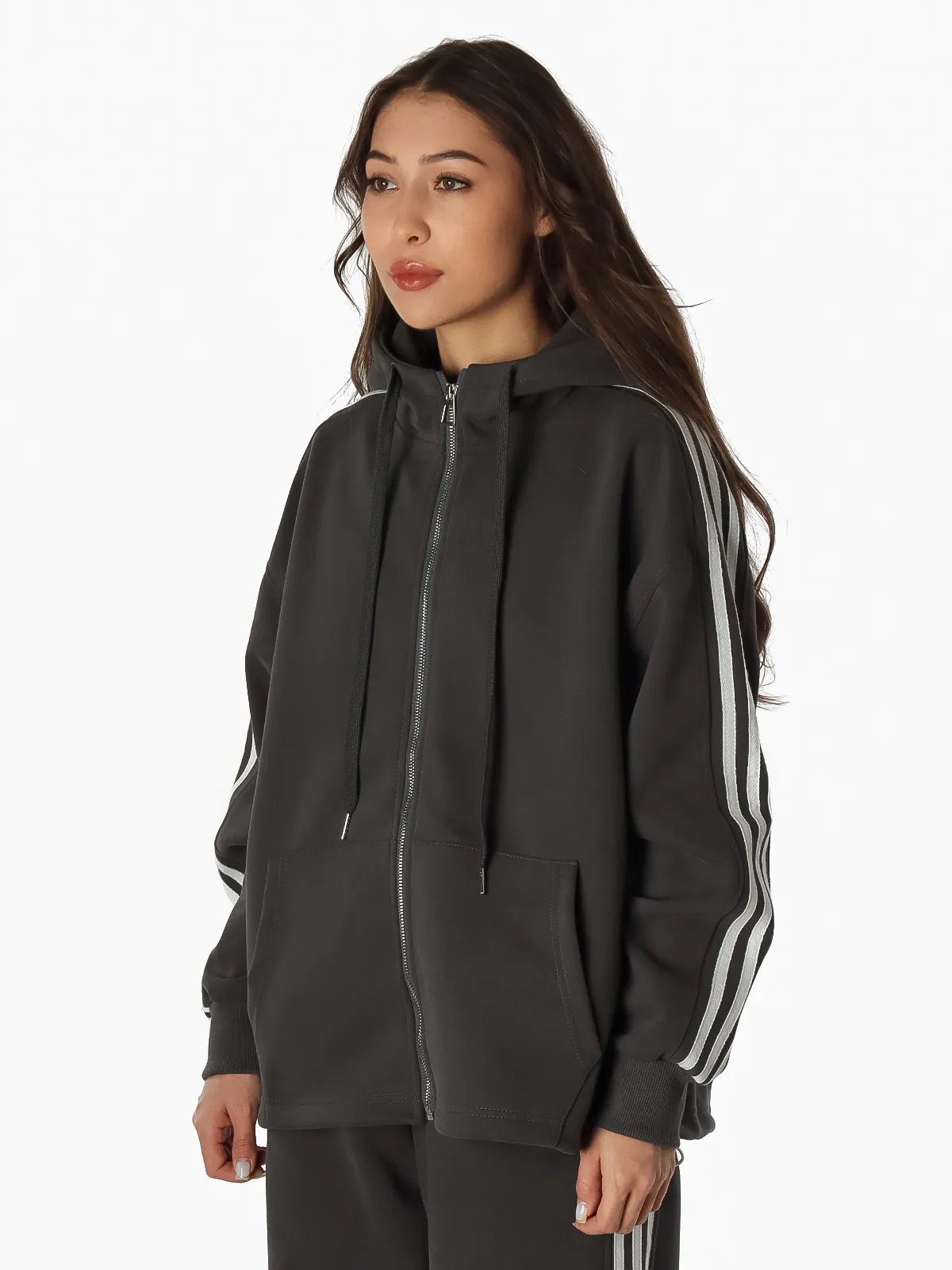 Толстовка на молнии с капюшоном оснащена удобными боковыми карманами и мягкими манжетами, что делает ее практичной и уютной. Широкие брюки также имеют боковые карманы, а пояс на эластичной резинке регулируется шнурком для идеальной посадки.