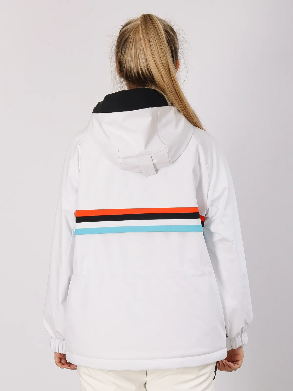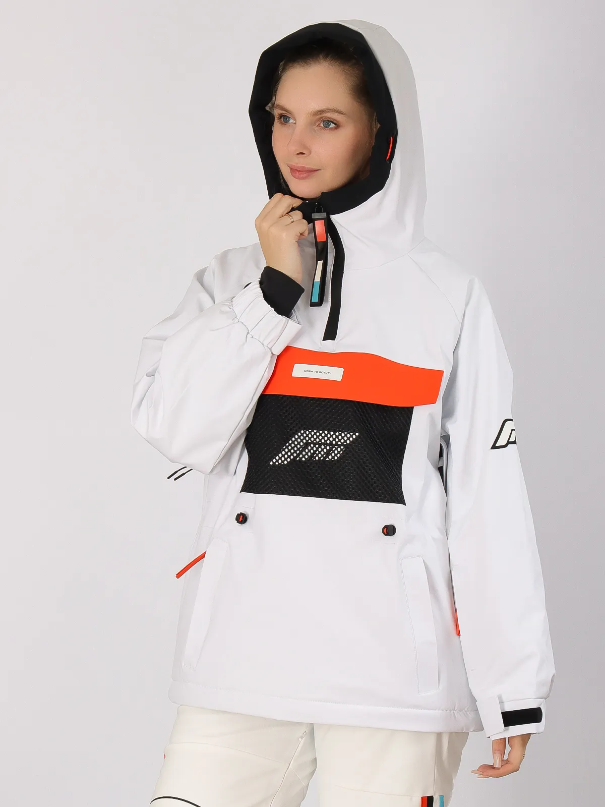 Для дополнительной защиты от снега предусмотрены снегозащитная юбка, влагозащитные молнии и проклеенные швы, исключающие проникновение влаги внутрь. Куртка оснащена регулируемым капюшоном и манжетами, что позволяет адаптировать ее под любую погоду.