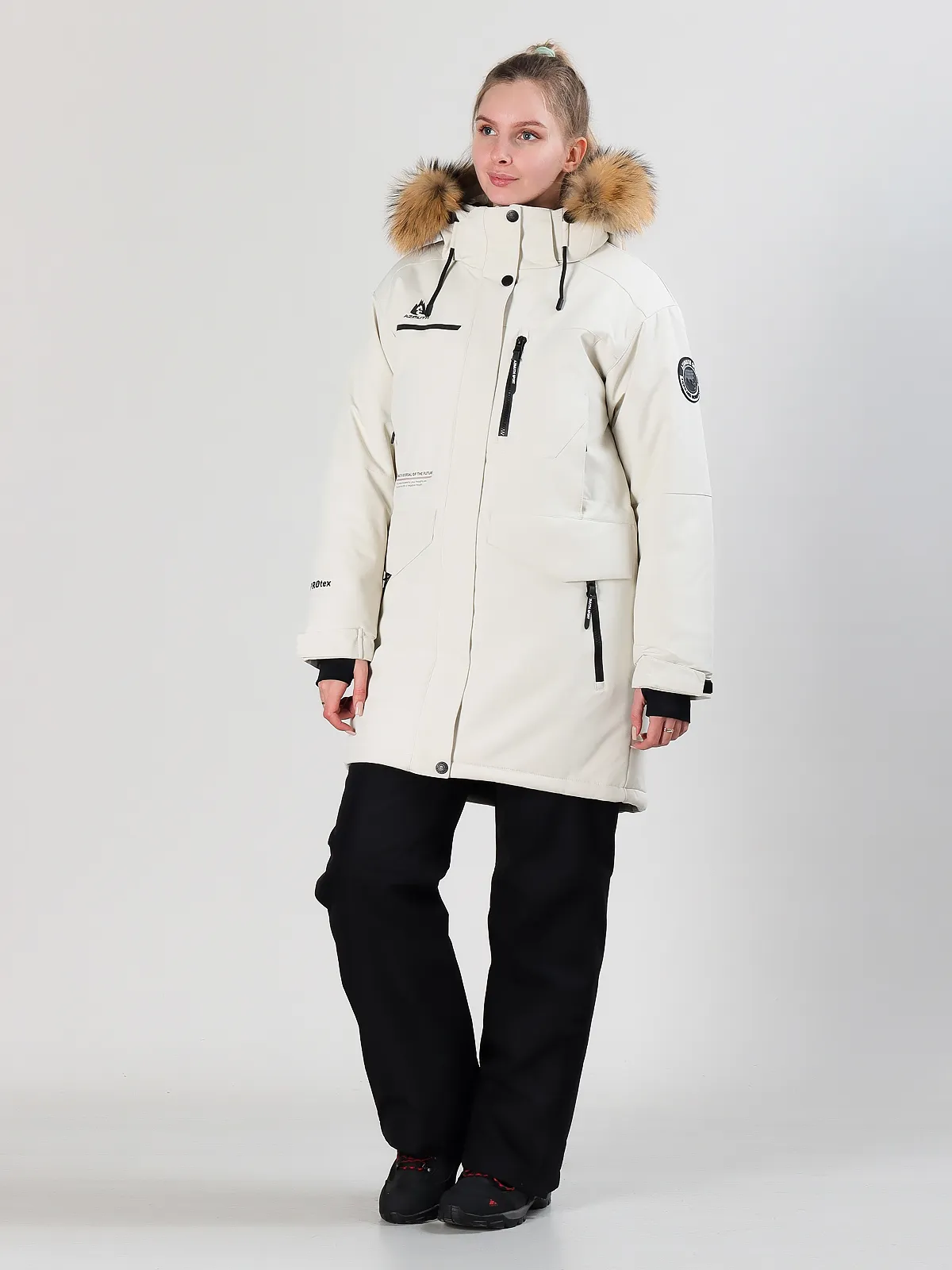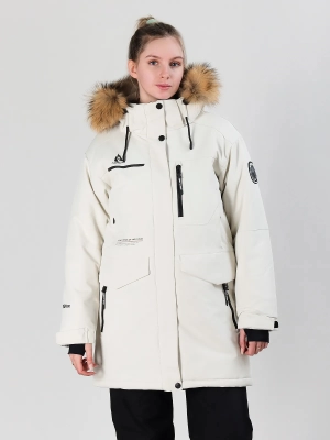 Для дополнительной защиты от холода предусмотрена ветрозащитная планка, а удлиненный крой закрывает бедра, создавая максимальный комфорт в непогоду. Капюшон с меховой опушкой (съемной) обеспечивает дополнительное утепление и стильный вид.