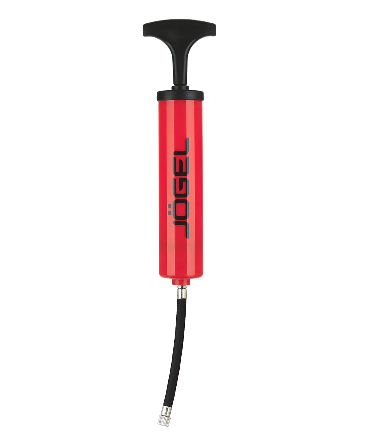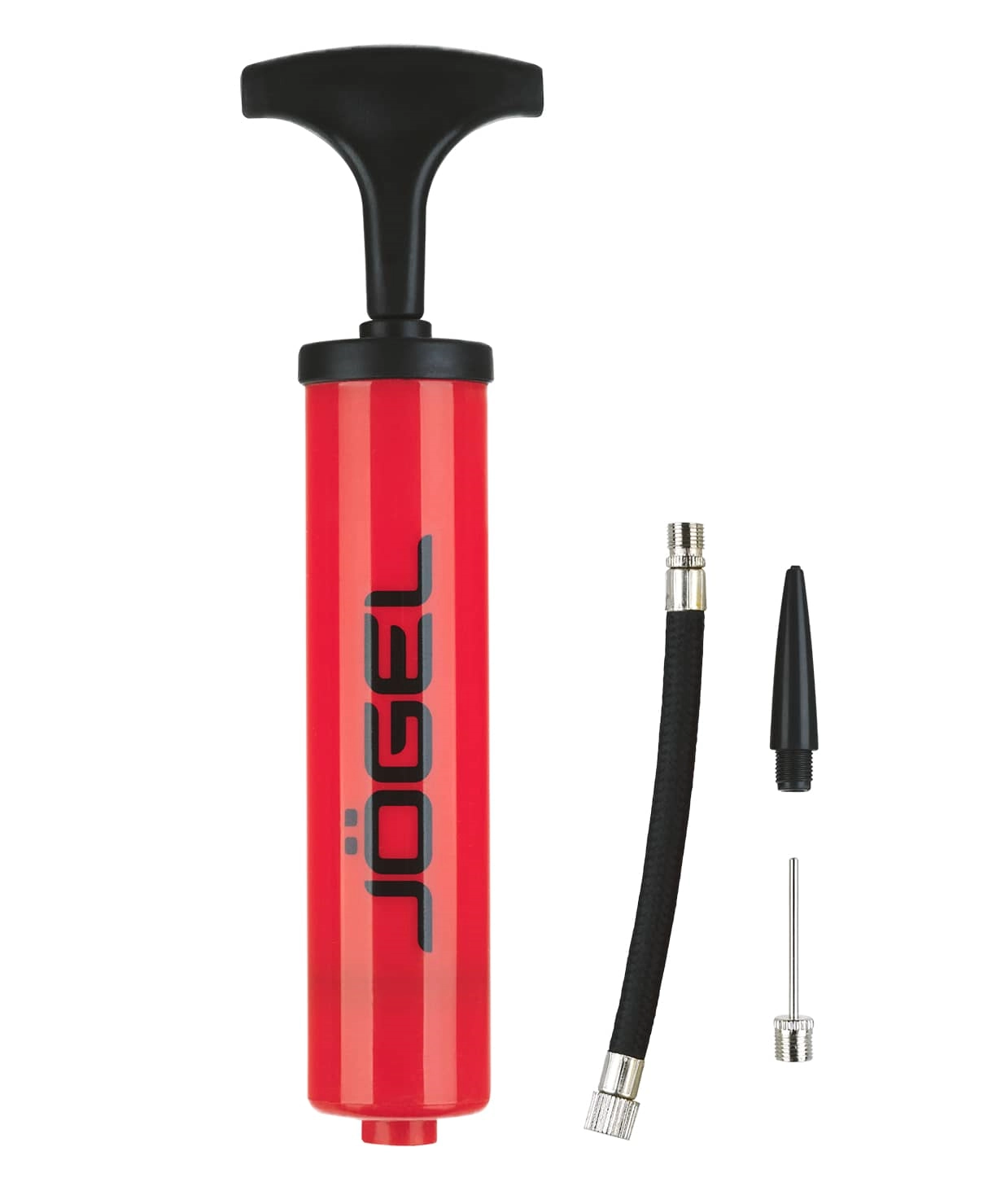Универсальный ручной насос красного цвета с Т-образной ручкой от бренда Jögel. Эффективен при накачке мячей любых типов. Благодаря небольшим габаритам и удобной упаковке, его легко брать собой в поездку. В комплект входит гибкий съемный шланг под автомобильный ниппель Schrader, стандартная игла с диаметром резьбы 7 мм и насадка для фитбола. Данная модель не подходит для накачивания велопокрышек.