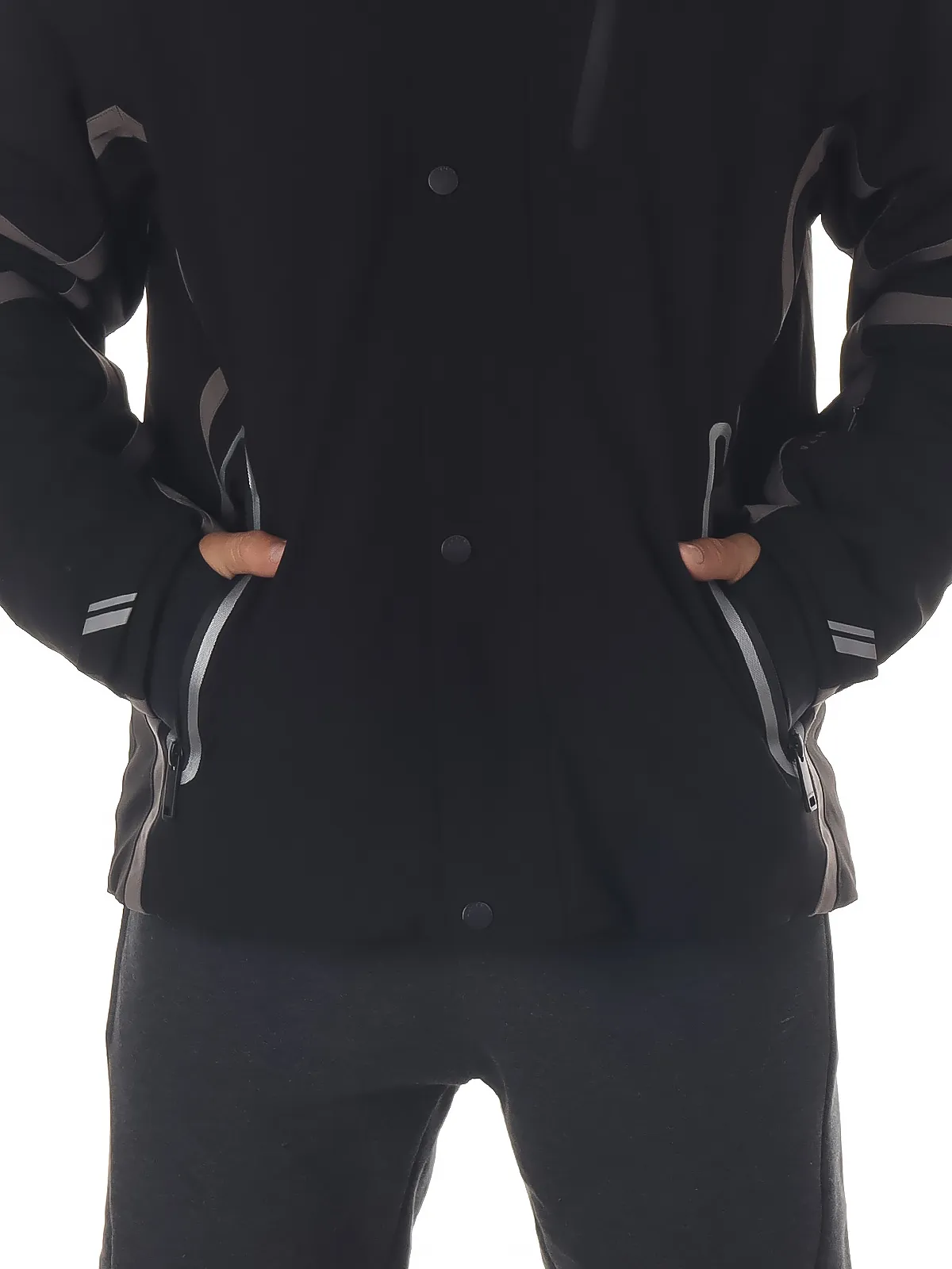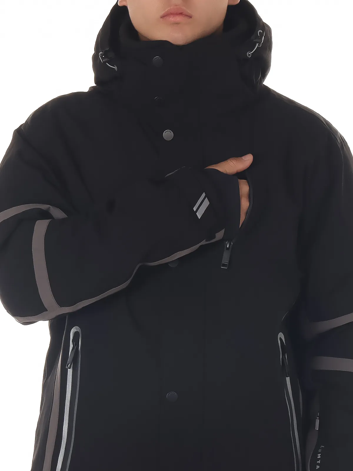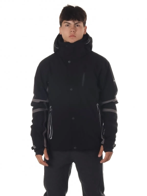 Модель оснащена практичными боковыми и нагрудным карманами на молнии, карманом для ski pass, а также манжетами через палец и на липучке для надежной фиксации и защиты от холода. Ветрозащитная планка предотвращает продувание, обеспечивая дополнительный комфорт.