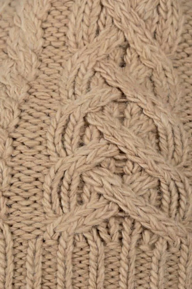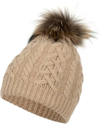 - Декор: шапка украшена стильными вязаными косами и элегантным помпоном из натурального меха, добавляя женственности и утонченности в образ.