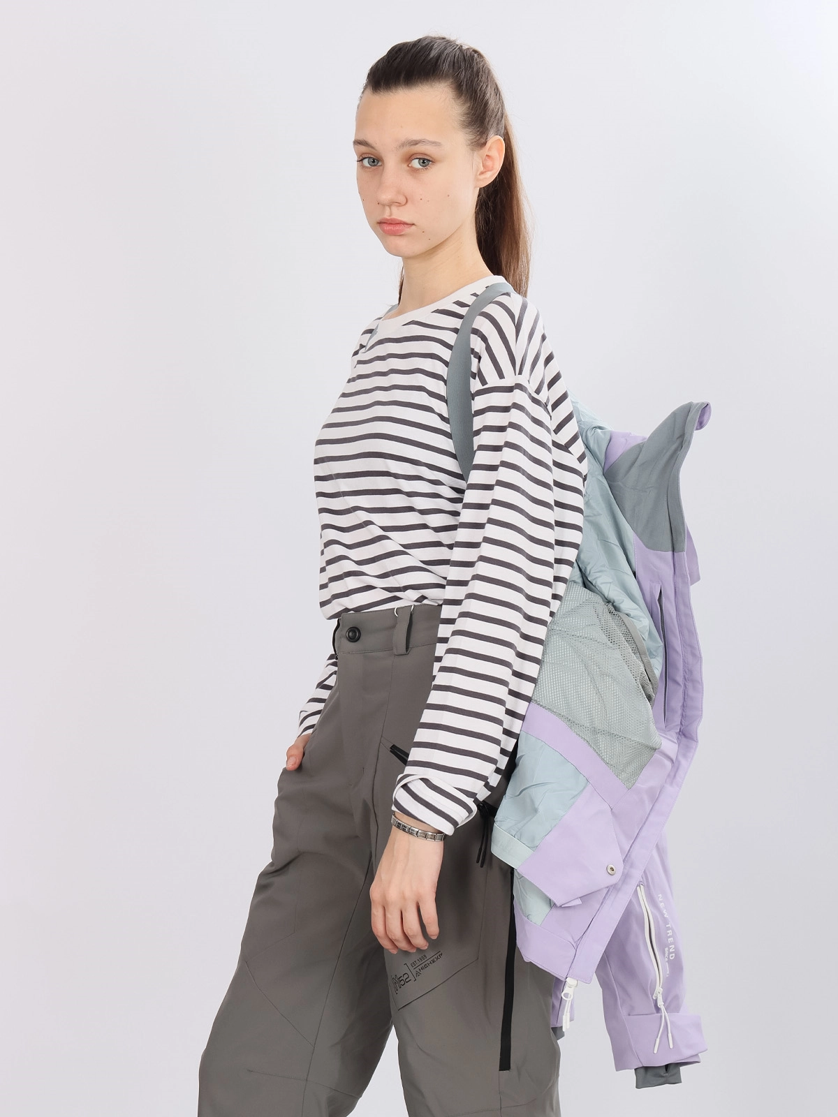 Кулиса по нижнему краю помогает подогнать куртку по фигуре, а лямки обеспечивают дополнительный комфорт при носке.