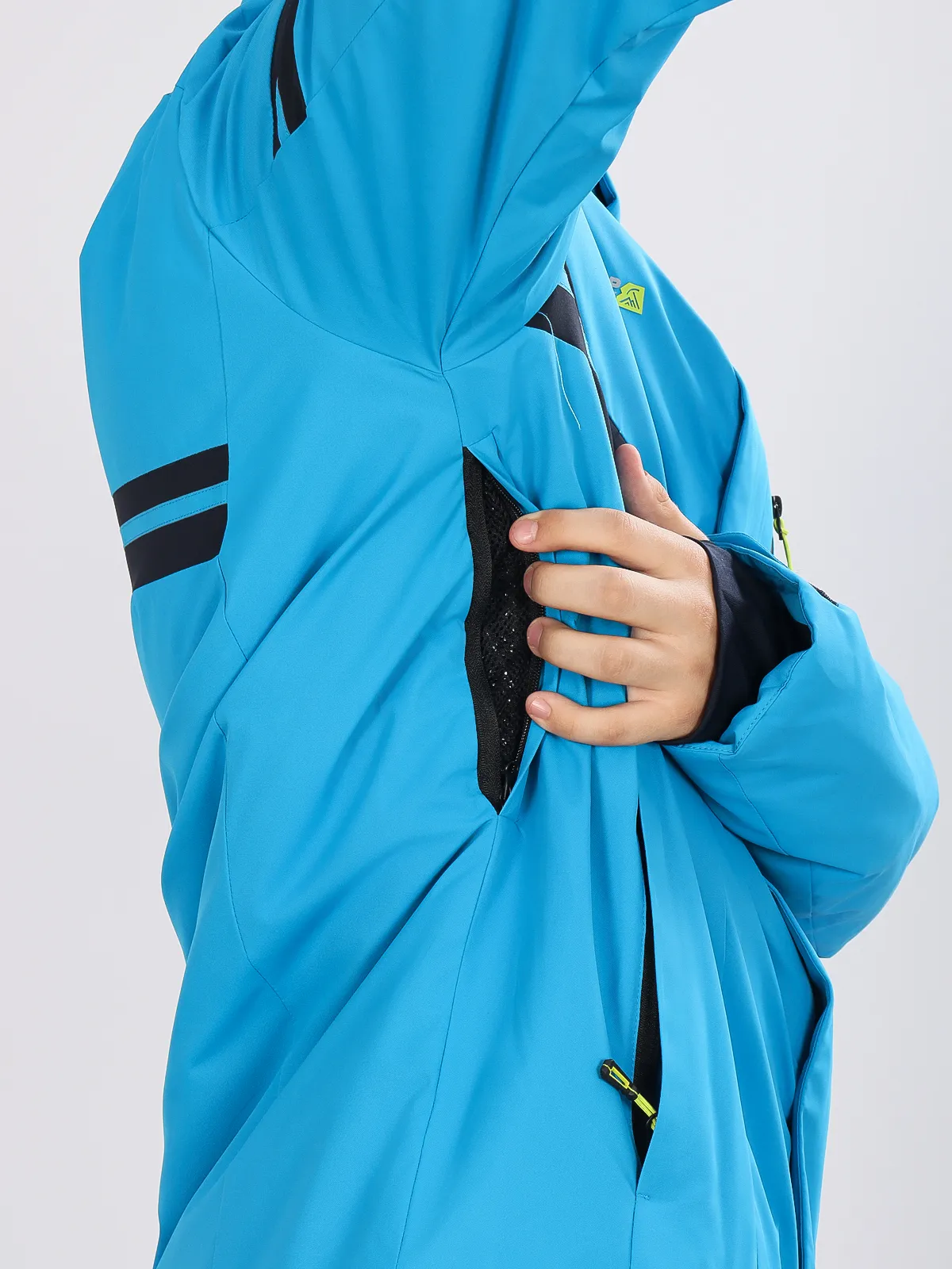 Манжеты на липучках с отверстием для пальцев и снежная юбка защищают от попадания снега. Прорези подмышками с молниями регулируют температуру, добавляя комфорт при движении.