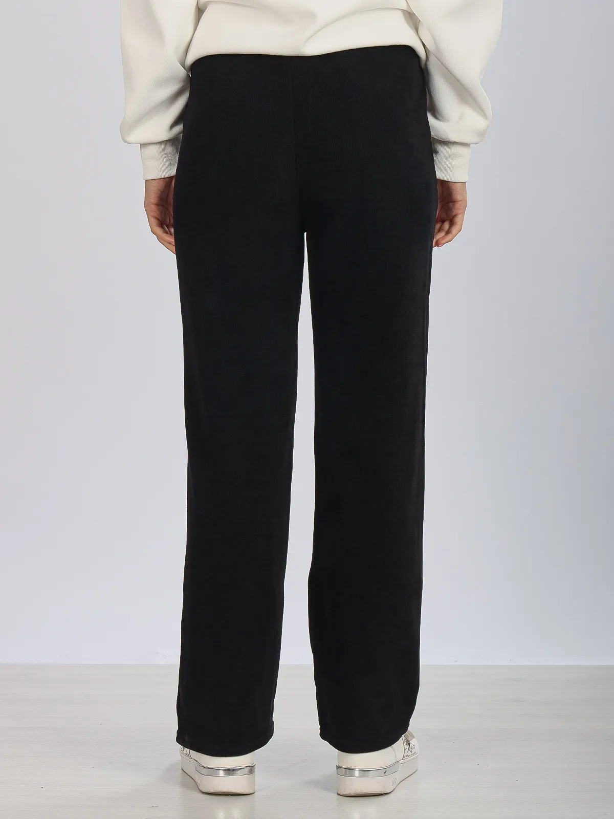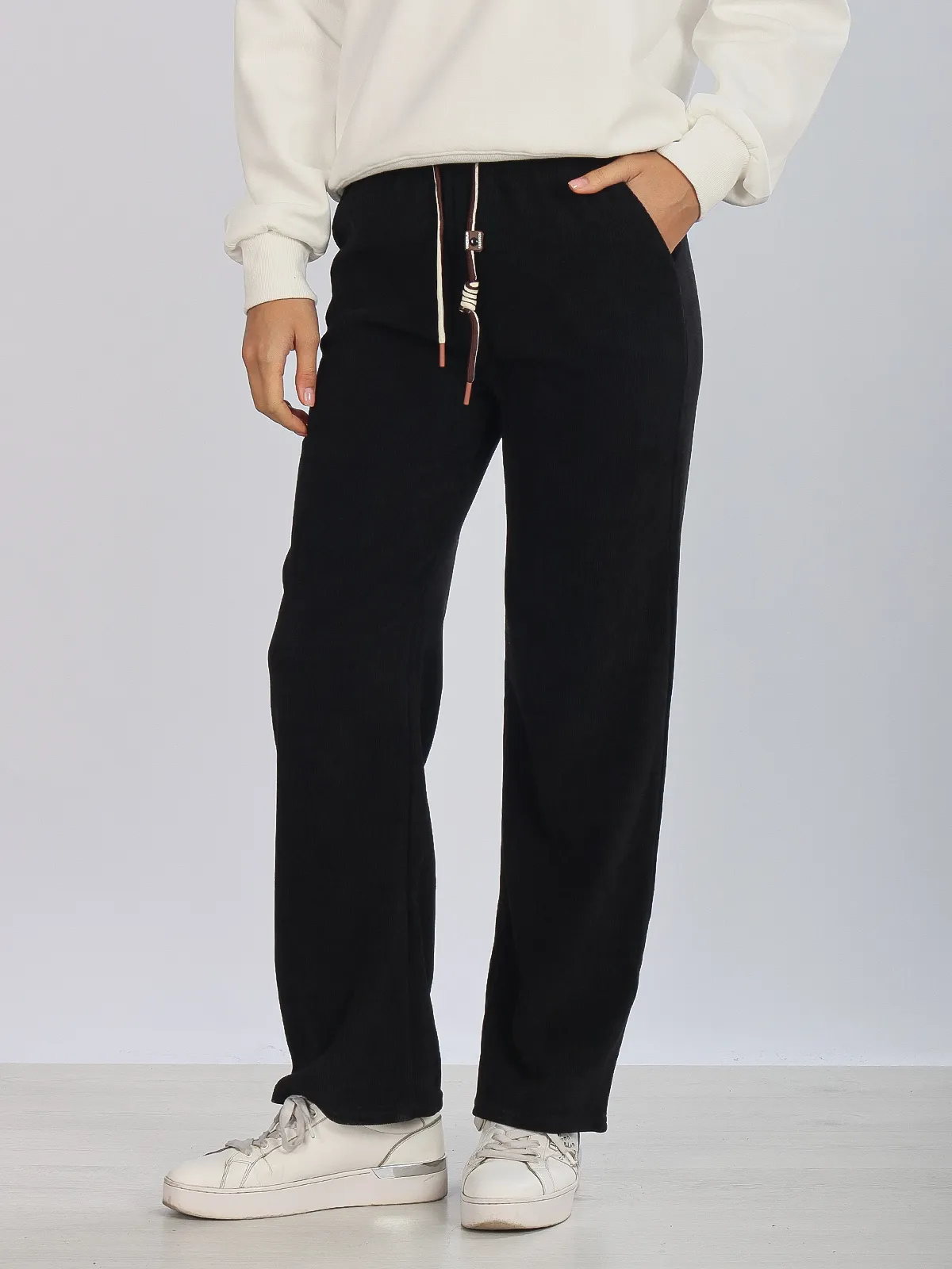Модель выполнена из высококачественного вельвета, который сочетает в себе мягкость и прочность. Прямой крой и боковые карманы добавляют практичности, а пояс на резинке с регулируемым шнурком позволяет настроить посадку брюков по фигуре.