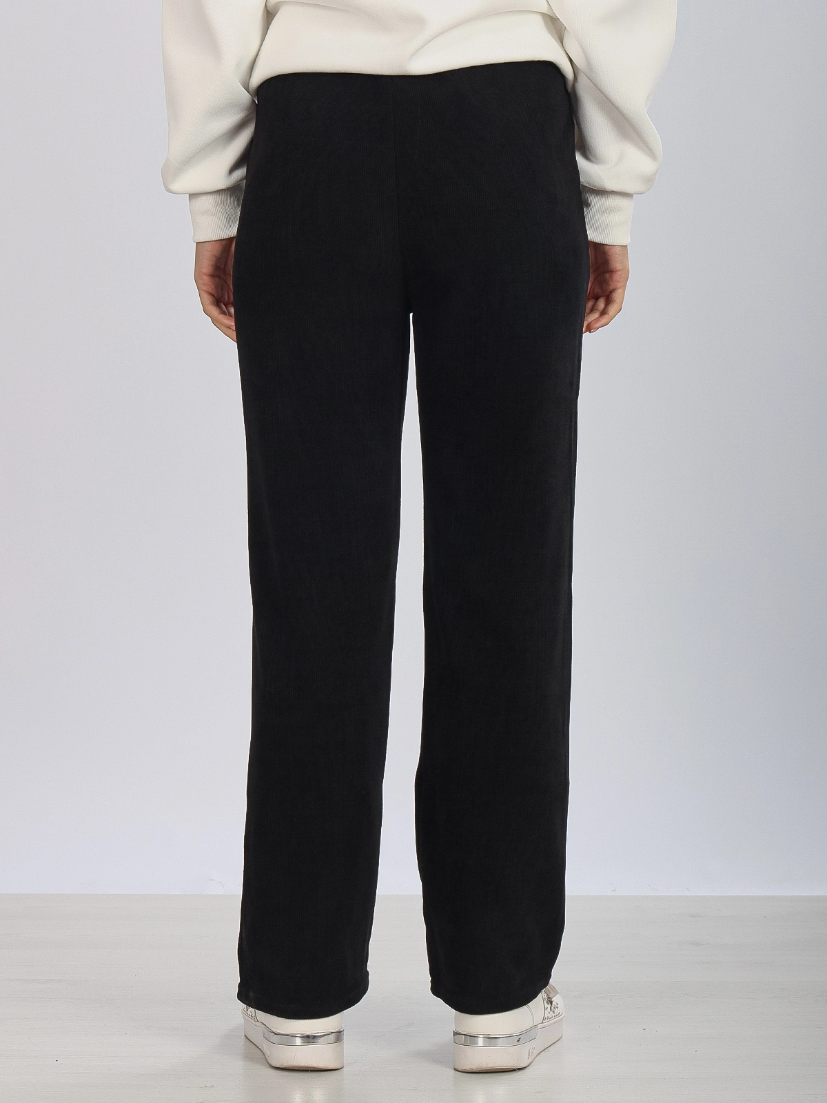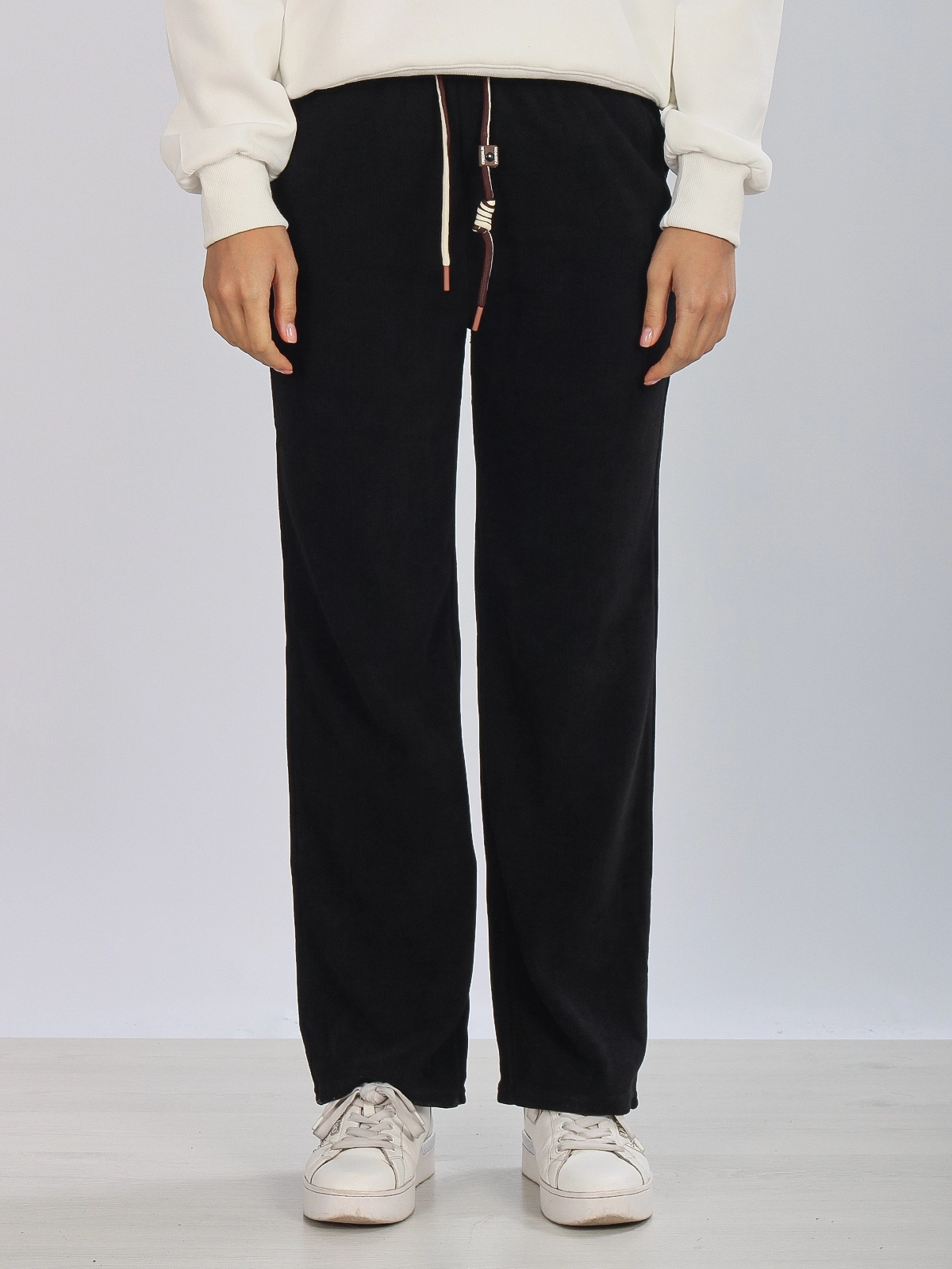 Модель выполнена из высококачественного вельвета, который сочетает в себе мягкость и прочность. Прямой крой и боковые карманы добавляют практичности, а пояс на резинке с регулируемым шнурком позволяет настроить посадку брюков по фигуре.
