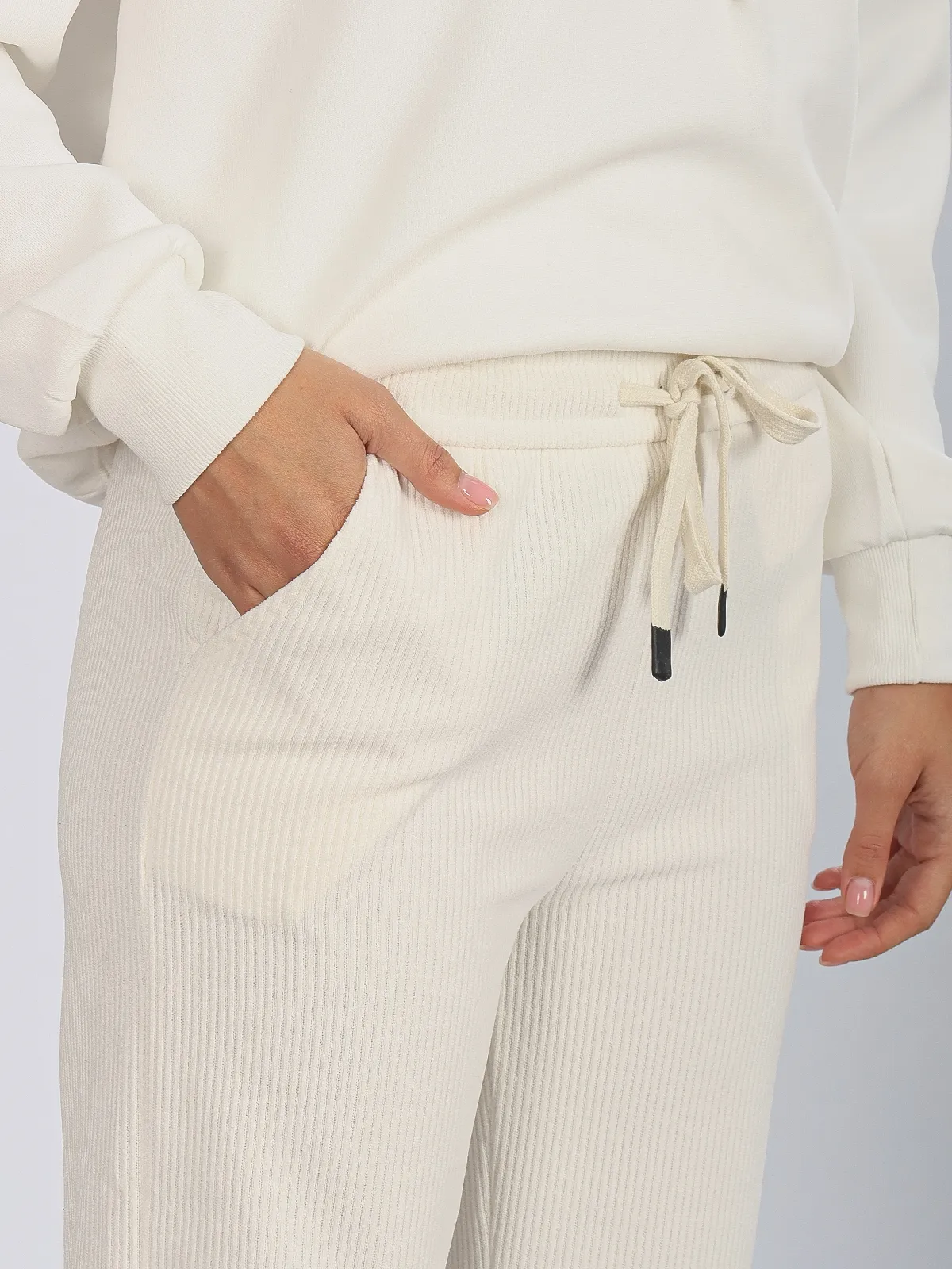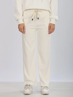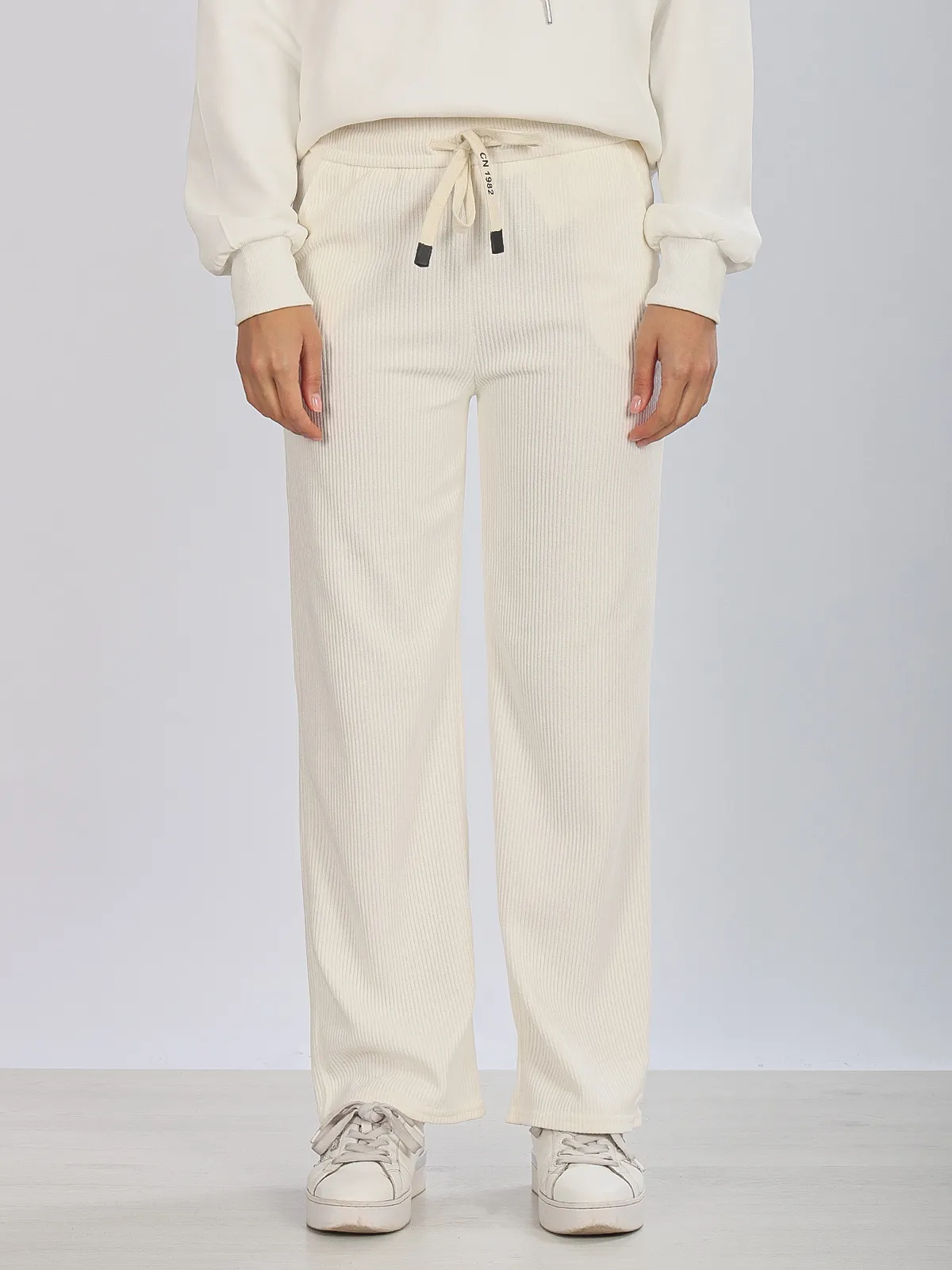 Модель выполнена из высококачественного вельвета, который сочетает в себе мягкость и прочность. Прямой крой и боковые карманы добавляют практичности, а пояс на резинке с регулируемым шнурком позволяет настроить посадку брюков по фигуре.