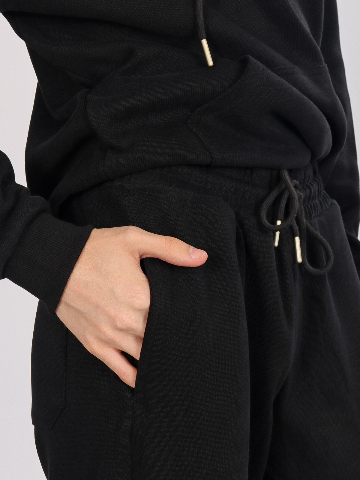 Худи выполнено с удобным капюшоном и вместительным карманом-кенгуру, который добавляет практичности. Брюки со свободным кроем и боковыми карманами обеспечивают свободу движений и удобство в повседневной носке.