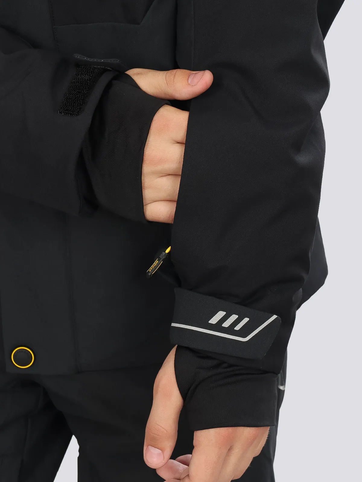 Манжеты на липучках с отверстиями для пальцев защищают от снега. Снежная юбка и кулиса регулировки по нижнему краю предотвращают проникновение холода. Вентиляция с молниями под мышками регулирует температуру.