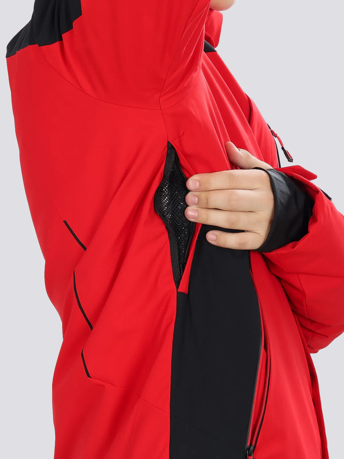 Манжеты на липучках с отверстиями для пальцев и ветрозащитная юбка защищают от снега и ветра. Прорези подмышками с молниями обеспечивают вентиляцию и комфорт при движении.