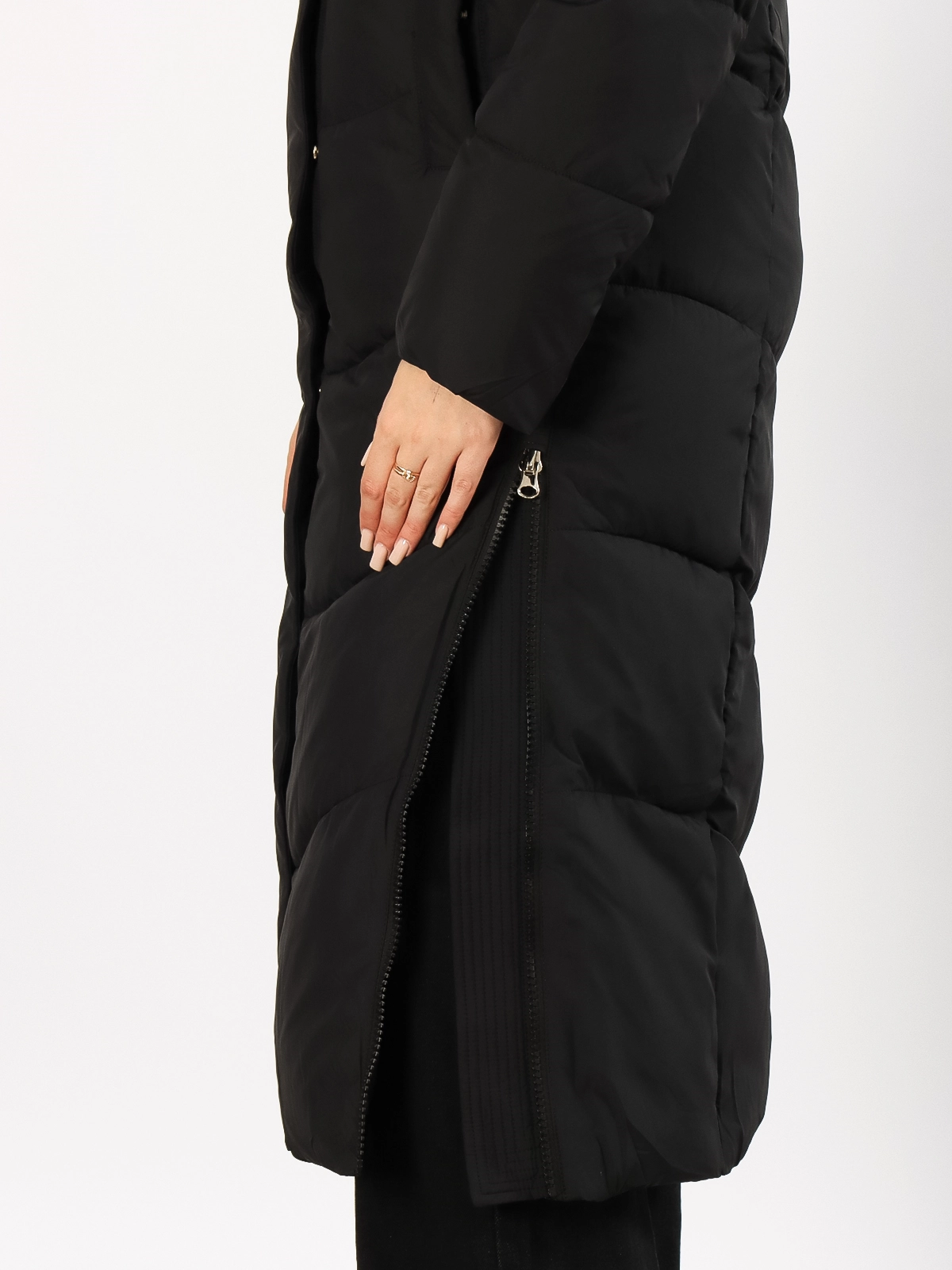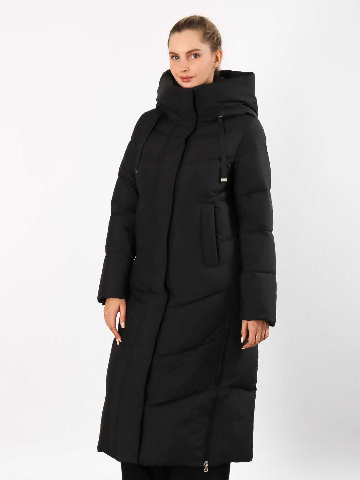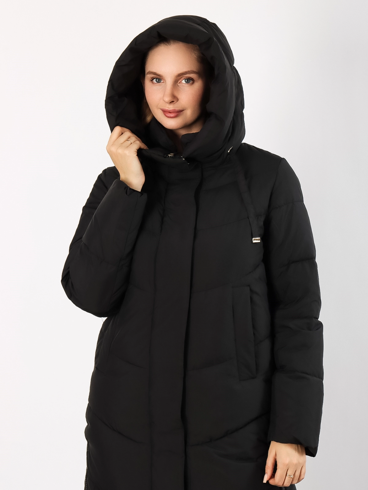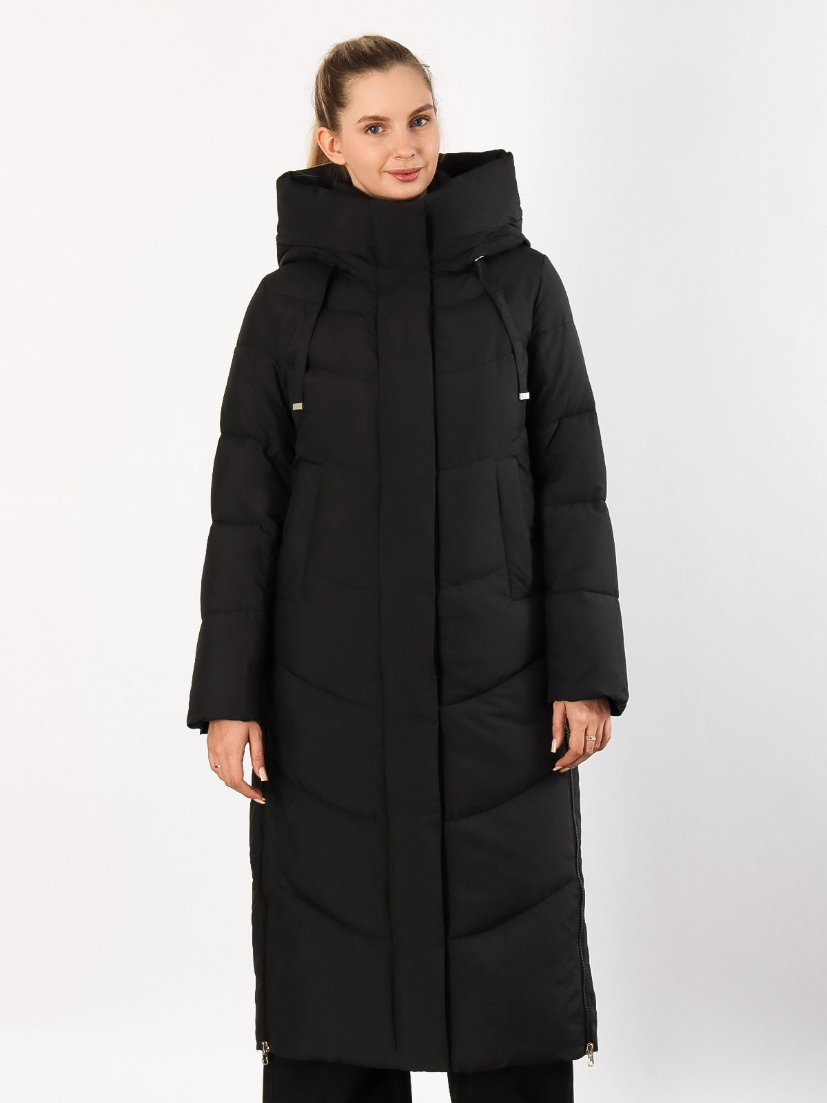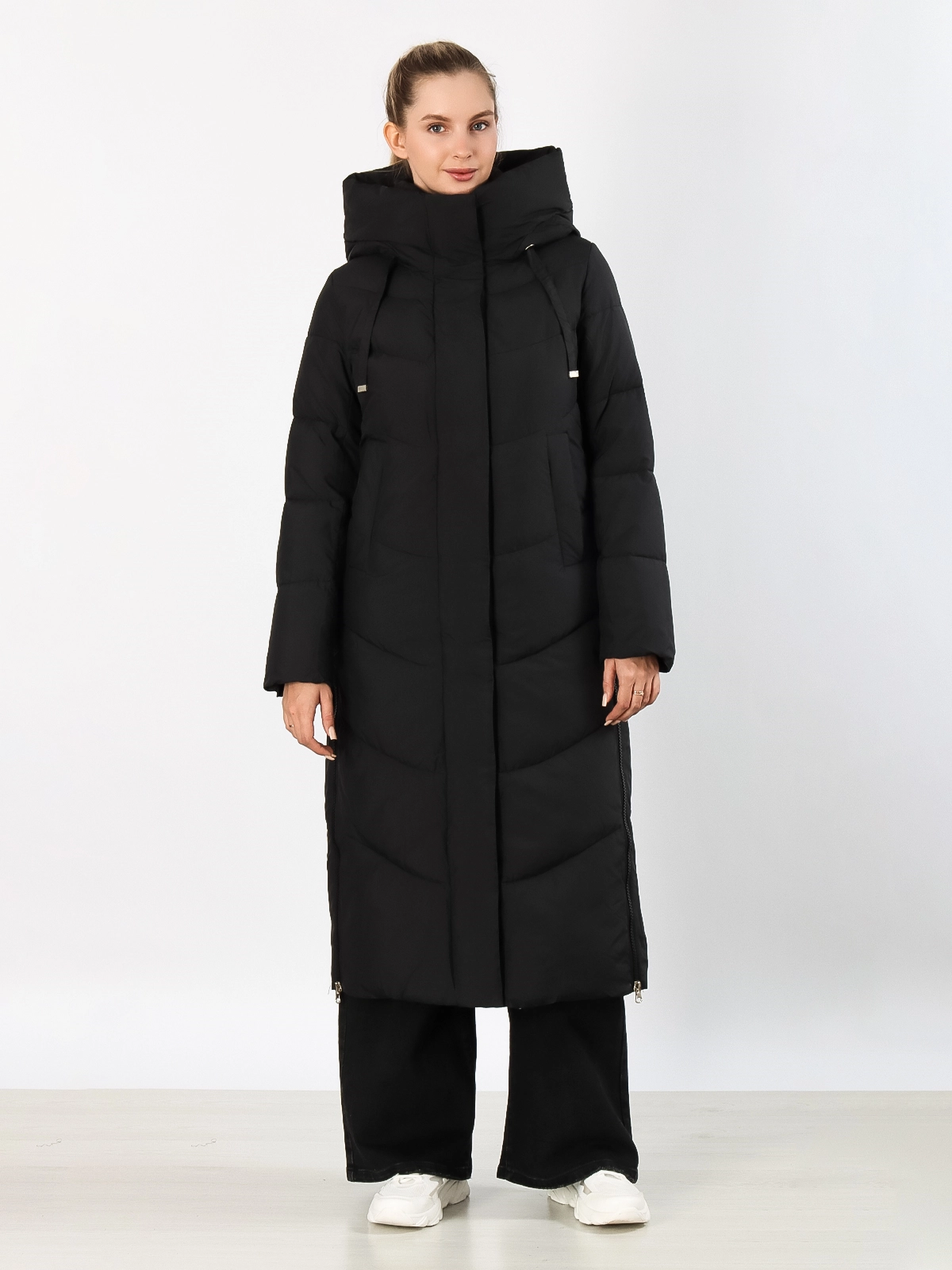 Дизайн: Длинный крой создает элегантный силуэт и надежно защищает от холода. Объемный капюшон сохраняет тепло и защищает от осадков. Разрезы на молниях по бокам добавляют свободу движений.