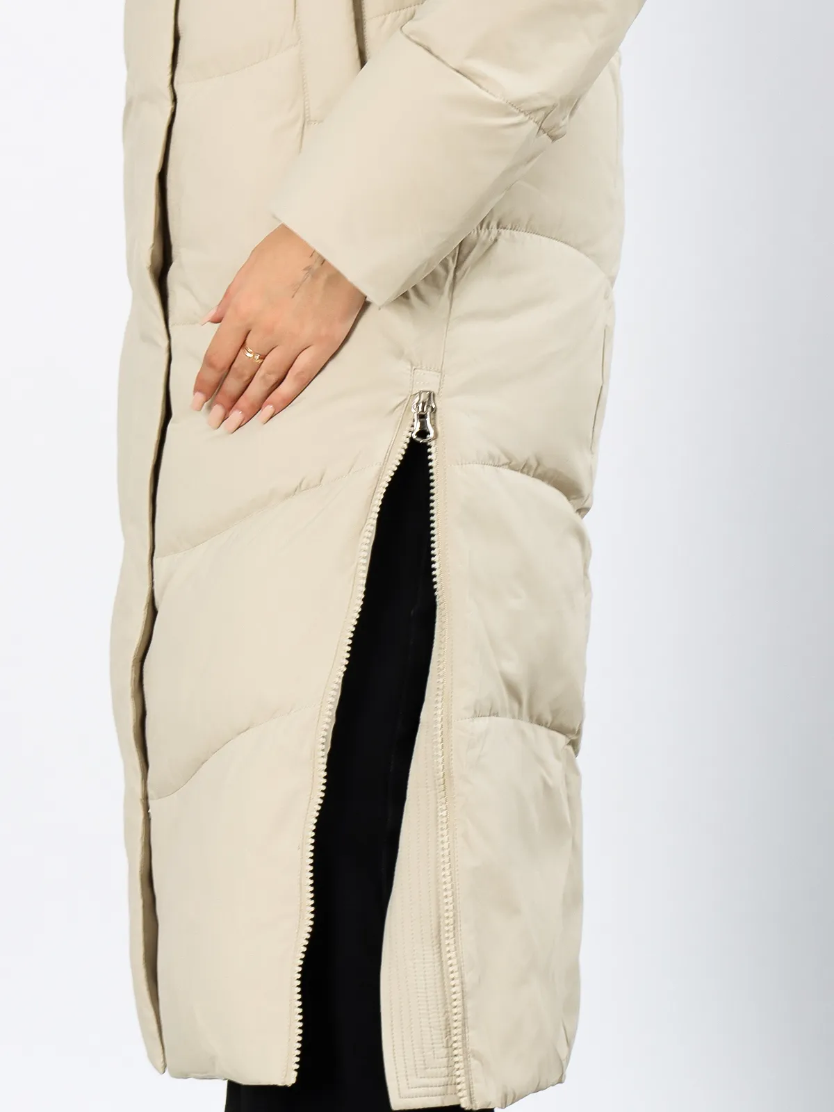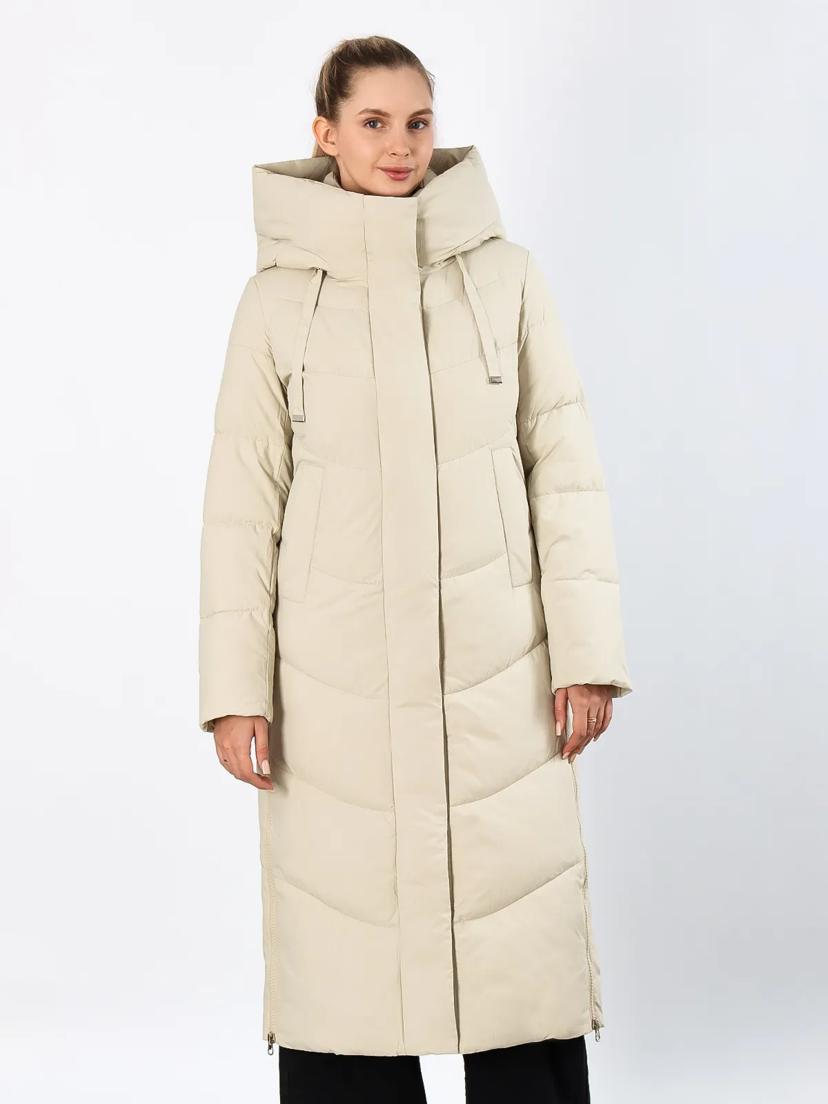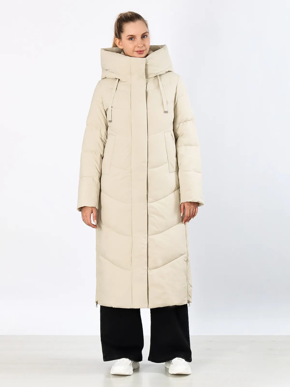 Дизайн: Длинный крой создает элегантный силуэт и надежно защищает от холода. Объемный капюшон сохраняет тепло и защищает от осадков. Разрезы на молниях по бокам добавляют свободу движений.