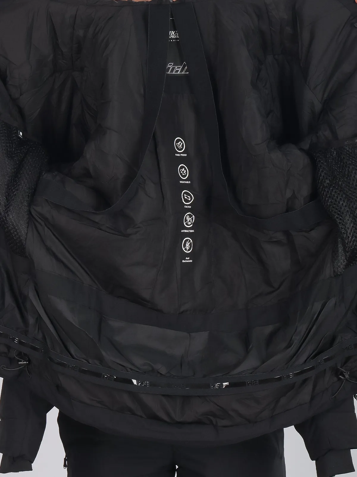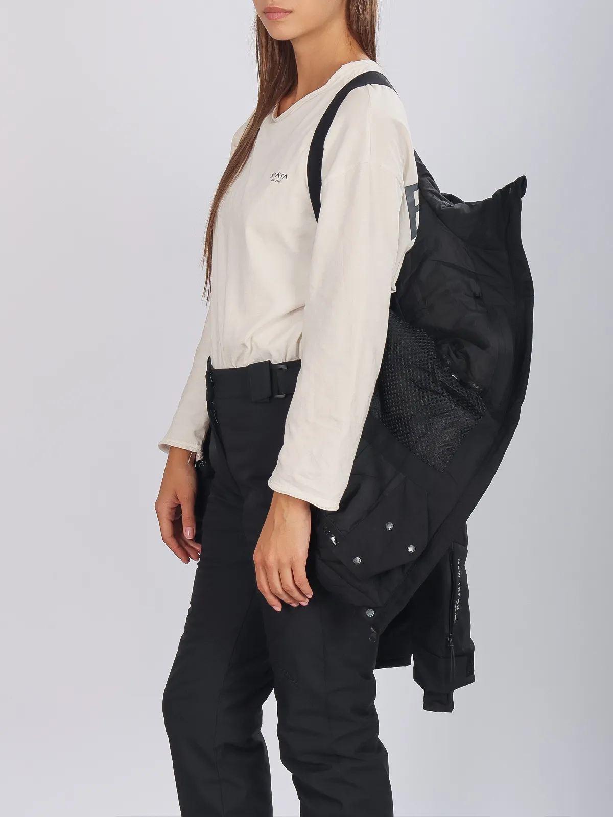 Куртка оснащена несколькими внутренними карманами. Снегозащитная юбка и кулиса по нижнему краю защищают от снега, а лямки обеспечивают дополнительное удобство.