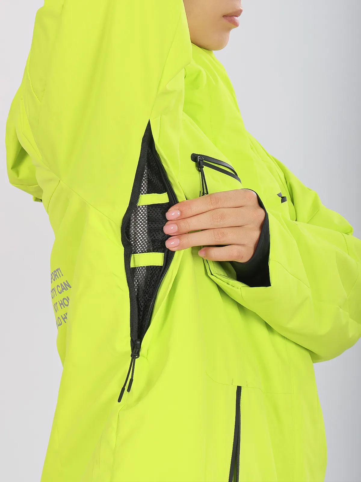 - Вентиляционные прорези под мышками на молниях для регулировки температуры.