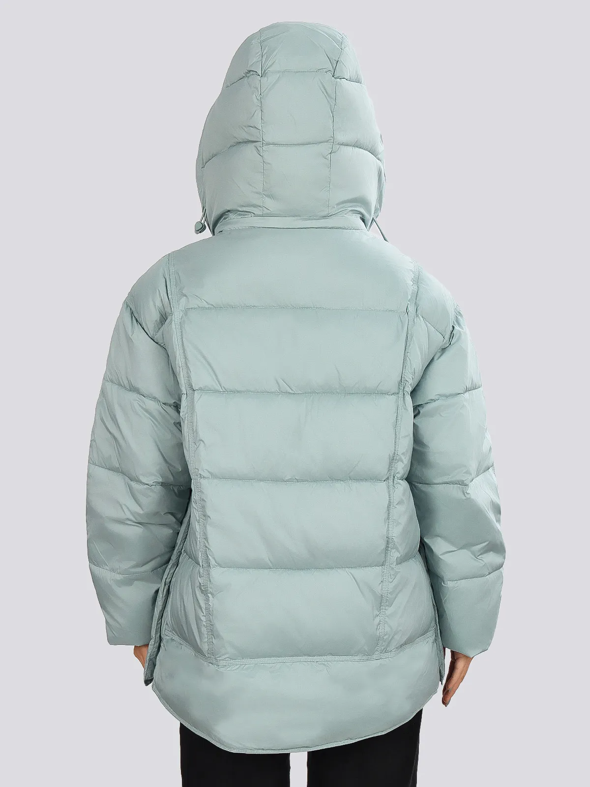 Высокий воротник-стойка защищает шею от холода, а эластичные манжеты плотно облегают запястья, не позволяя холоду проникать внутрь. Несколько боковых карманов удобны для хранения мелочей или согрева рук в холодную погоду.