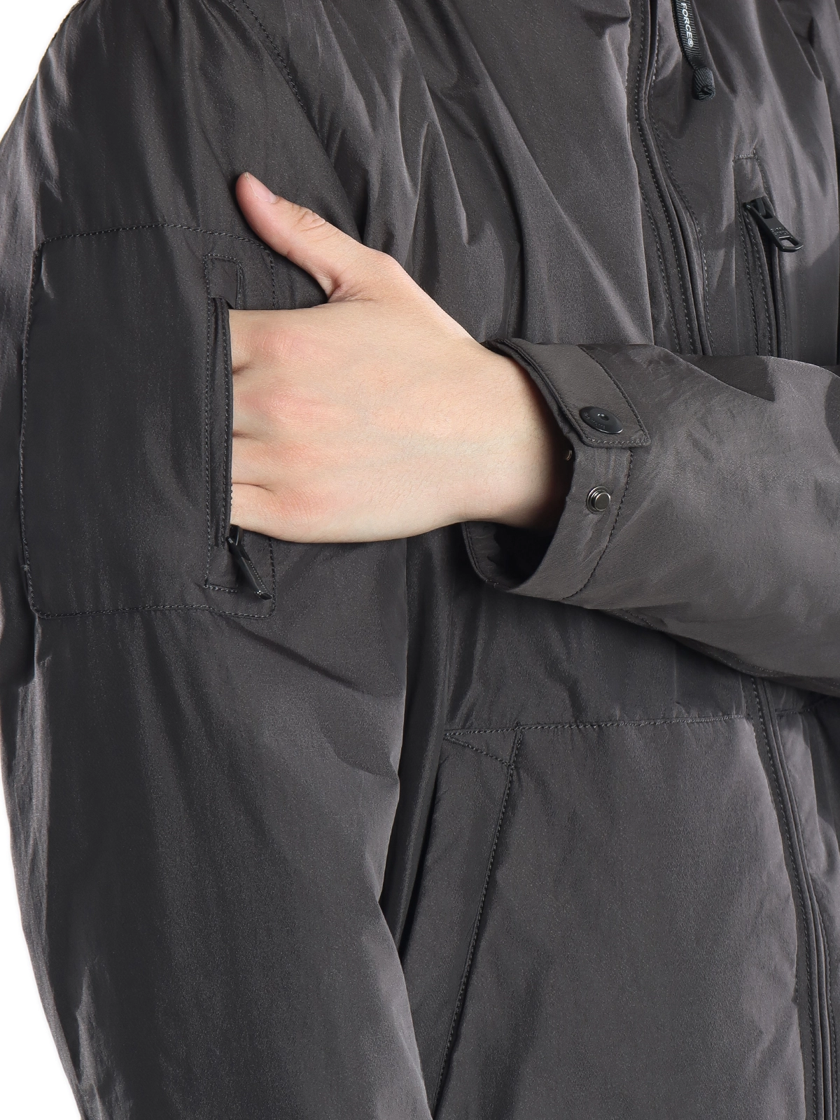 Особенность дизайна куртки — это воротник стойка, который дополнительно защищает шею от холода, обеспечивая комфорт при сильных ветрах. Для удобства в повседневном использовании куртка оснащена несколькими карманами: боковые карманы для хранения мелочей, карман на молнии на рукаве для аксессуаров и документов, а также нагрудный карман на молнии для ценностей, которые нужно держать под рукой.