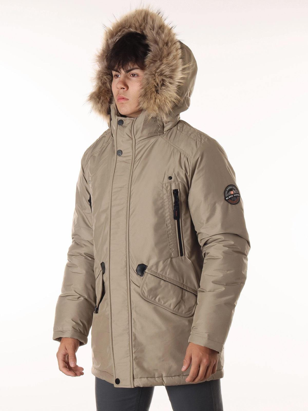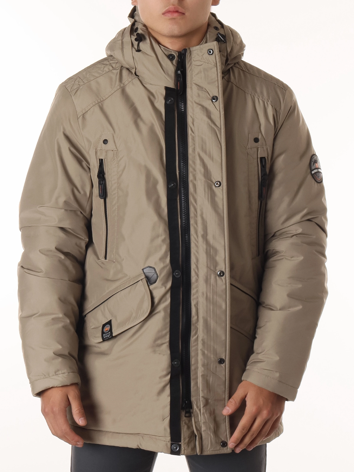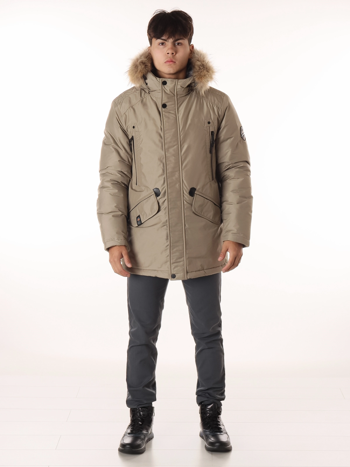 Куртка выполнена из полиэстера, который обеспечивает прочность, долговечность и лёгкость в уходе. Несъёмный капюшон с съёмной меховой опушкой и ветрозащитная планка надёжно защищают от ветра и осадков. Утеплённый воротник добавляет дополнительную защиту от холода.