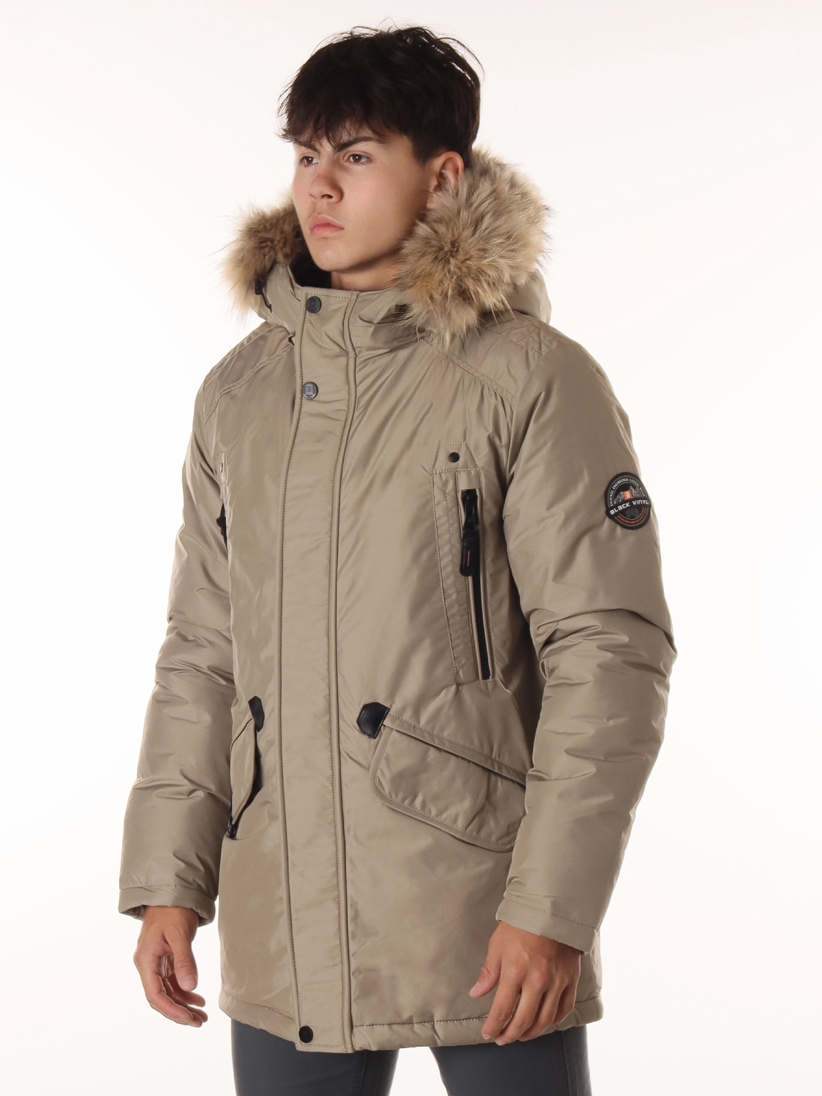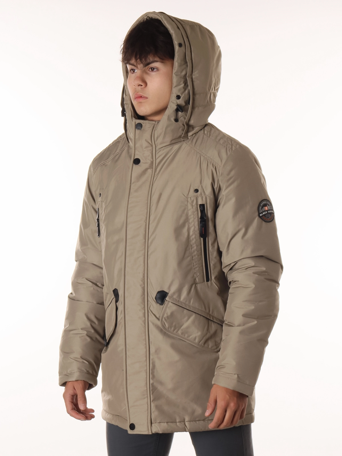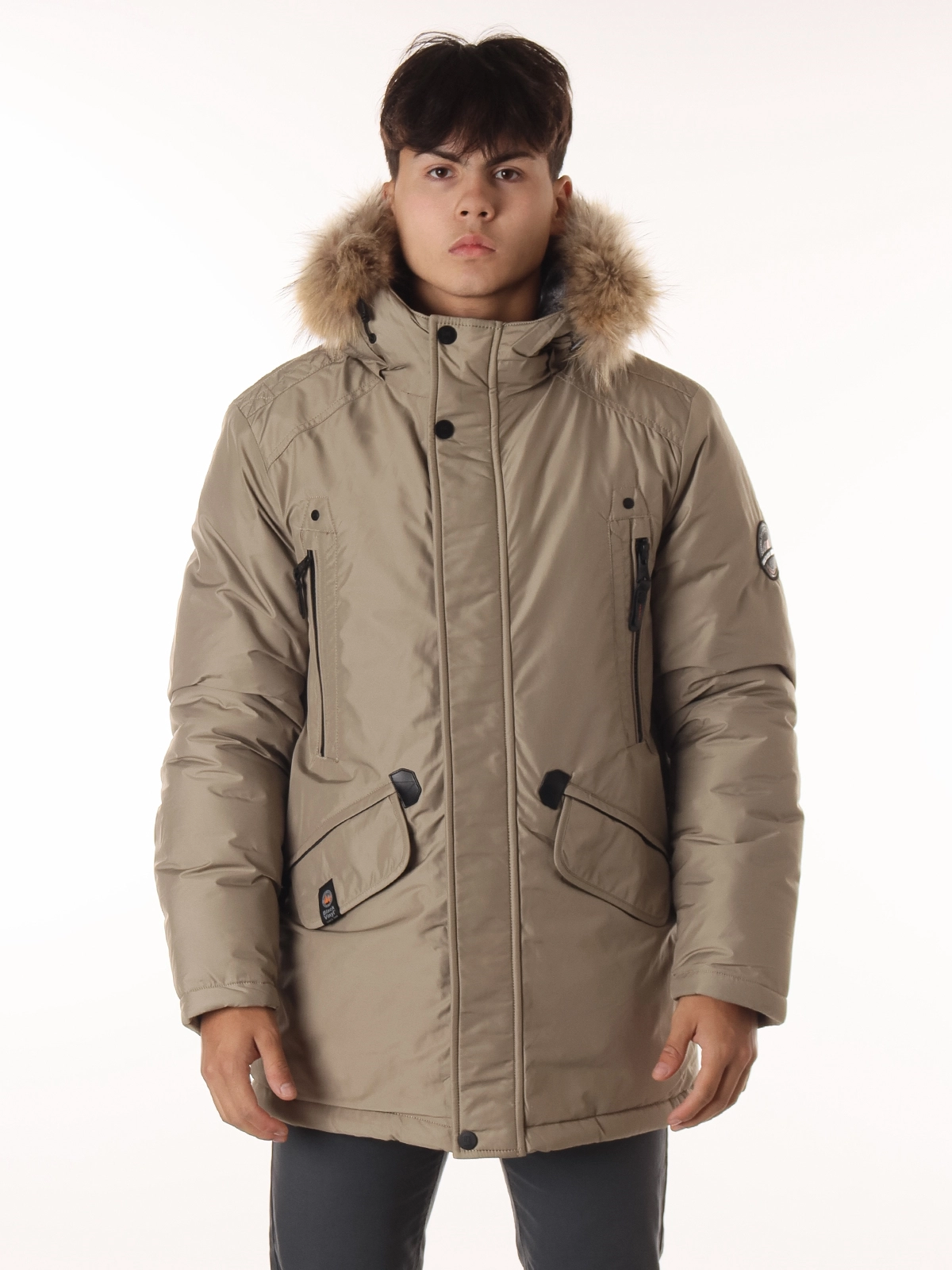 Куртка выполнена из полиэстера, который обеспечивает прочность, долговечность и лёгкость в уходе. Несъёмный капюшон с съёмной меховой опушкой и ветрозащитная планка надёжно защищают от ветра и осадков. Утеплённый воротник добавляет дополнительную защиту от холода.