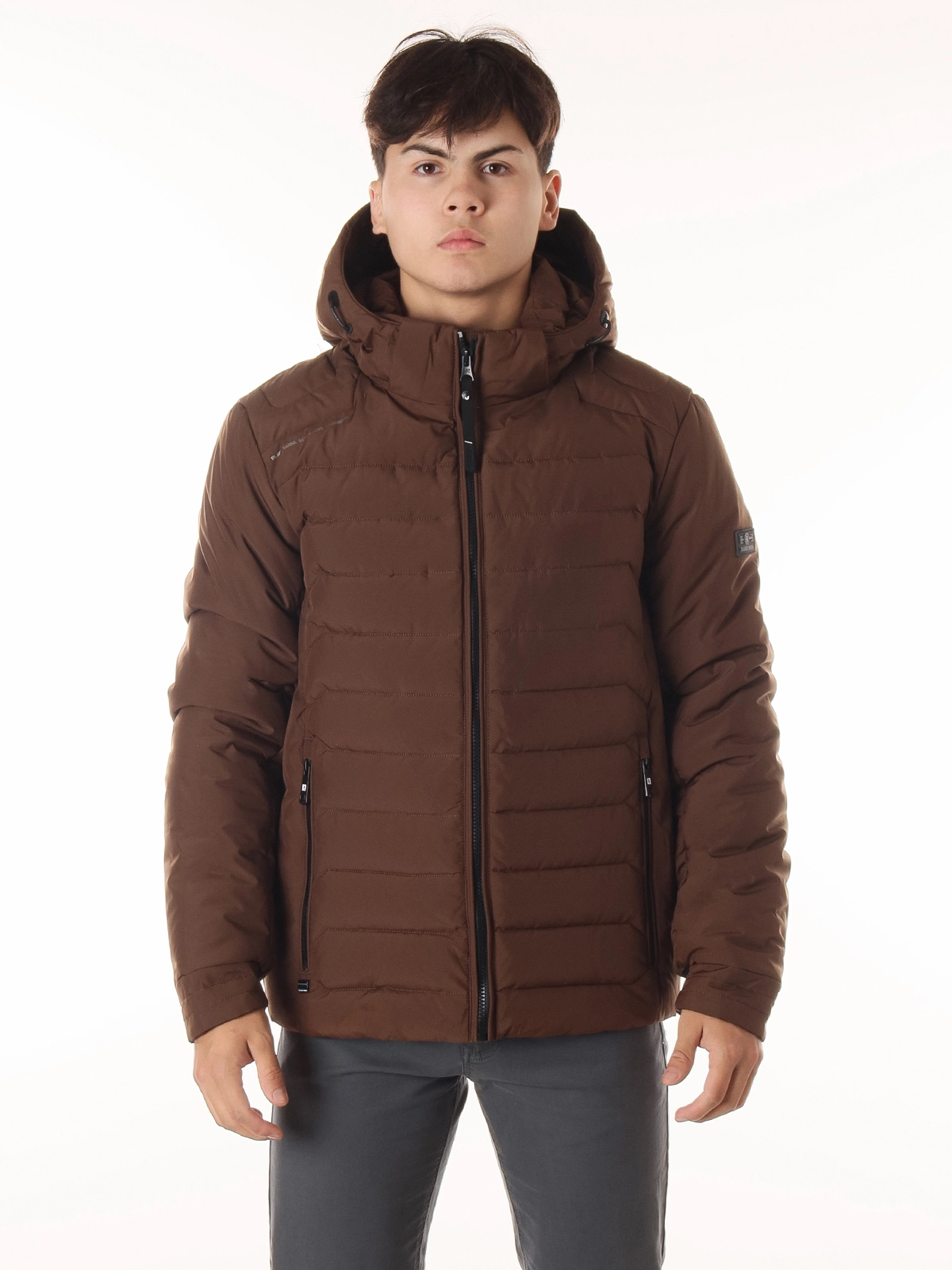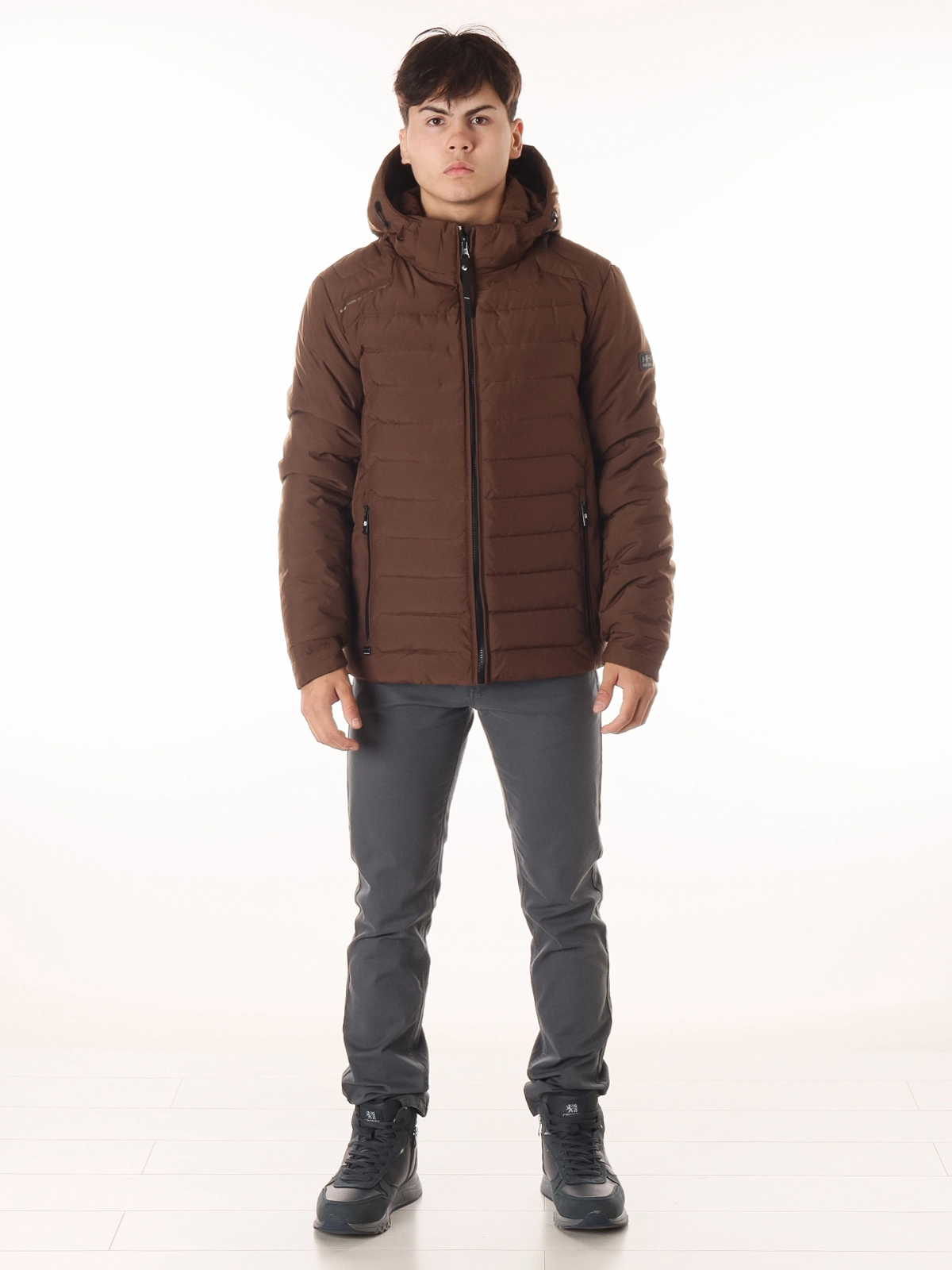 Съемный капюшон обеспечивает универсальность и защиту от ветра и осадков, а воротник-стойка надежно прикрывает шею от холода.