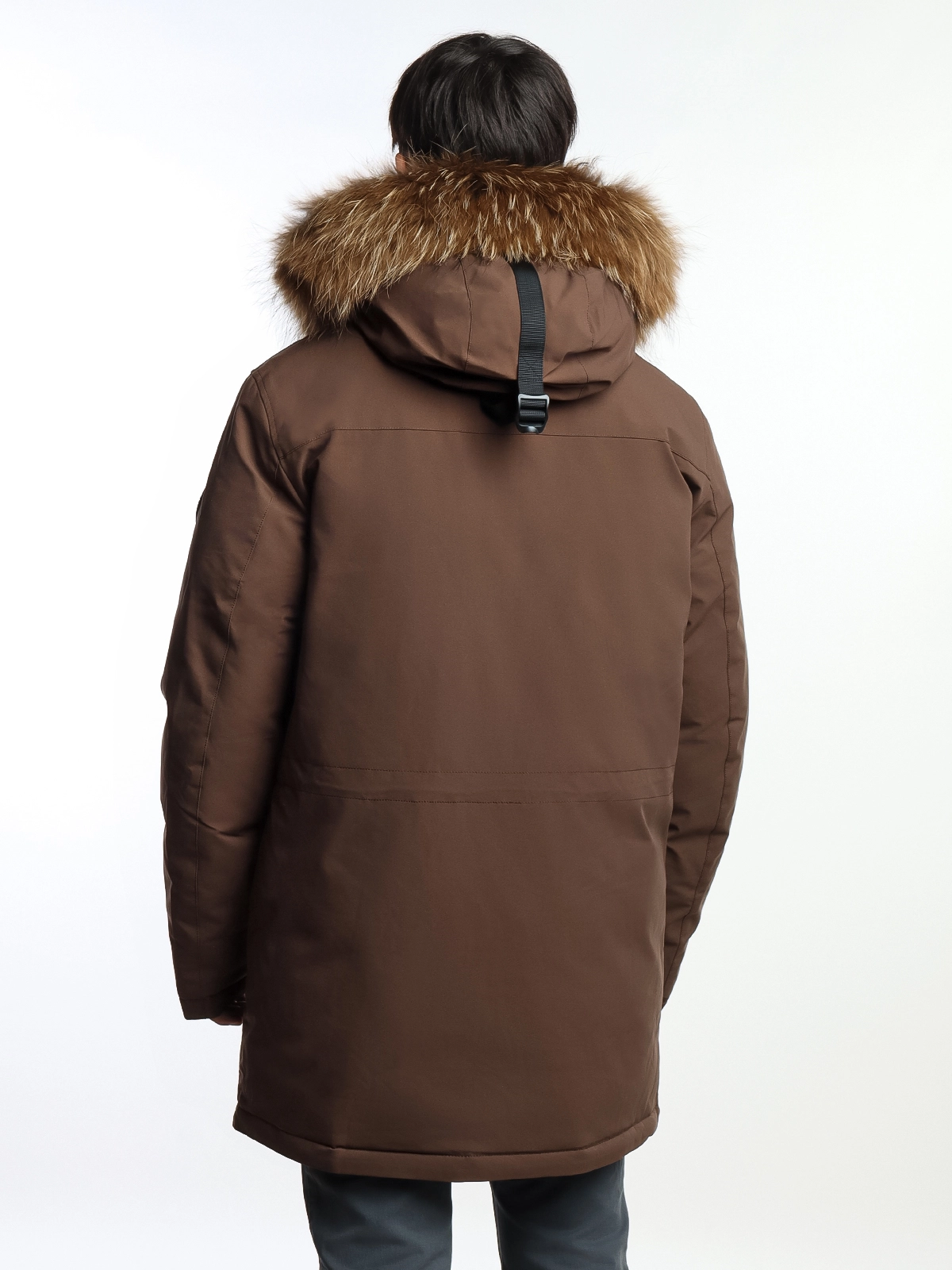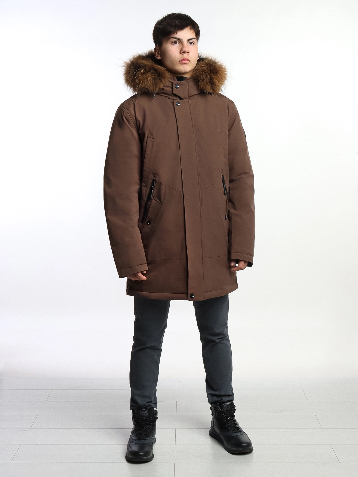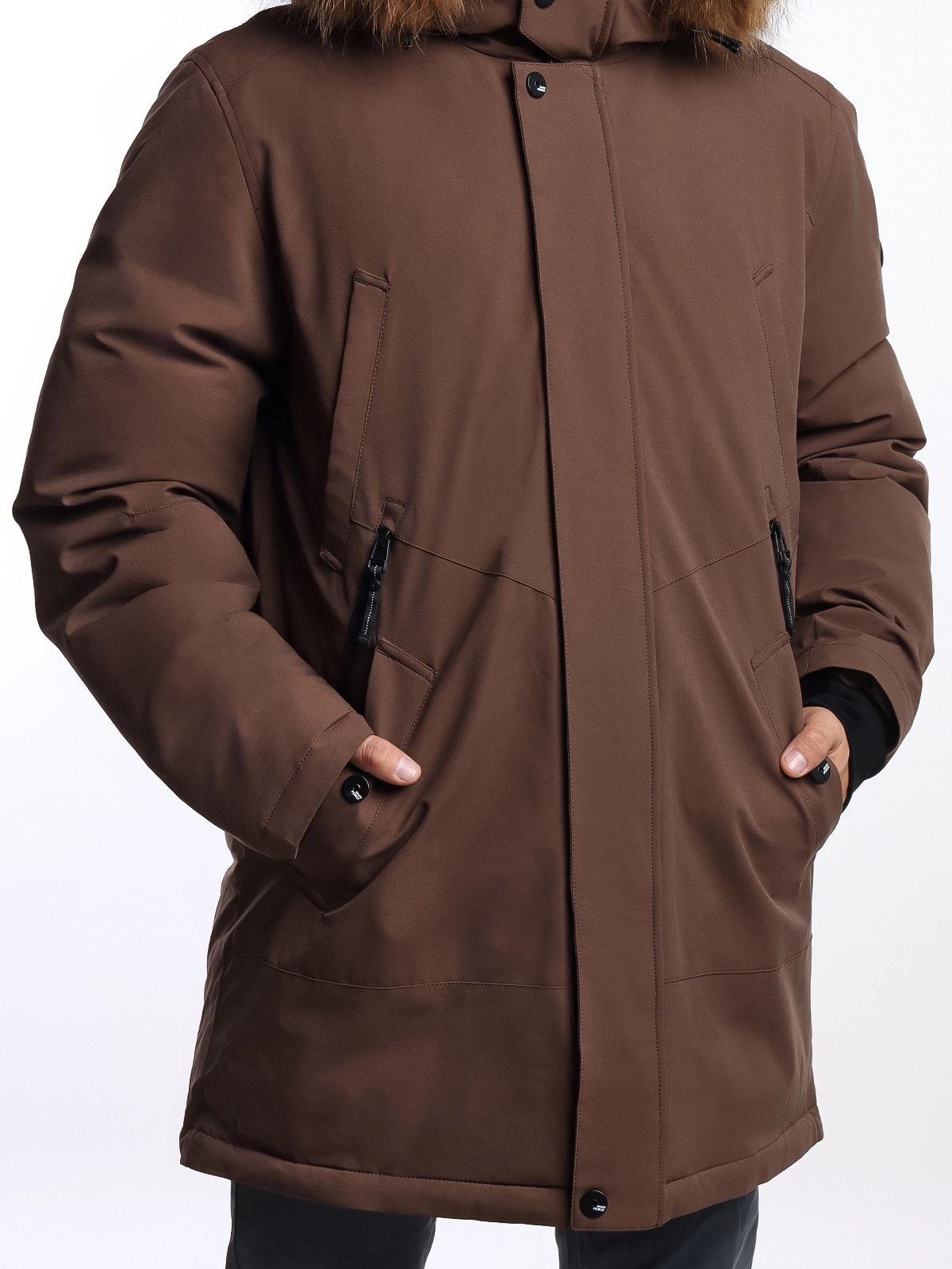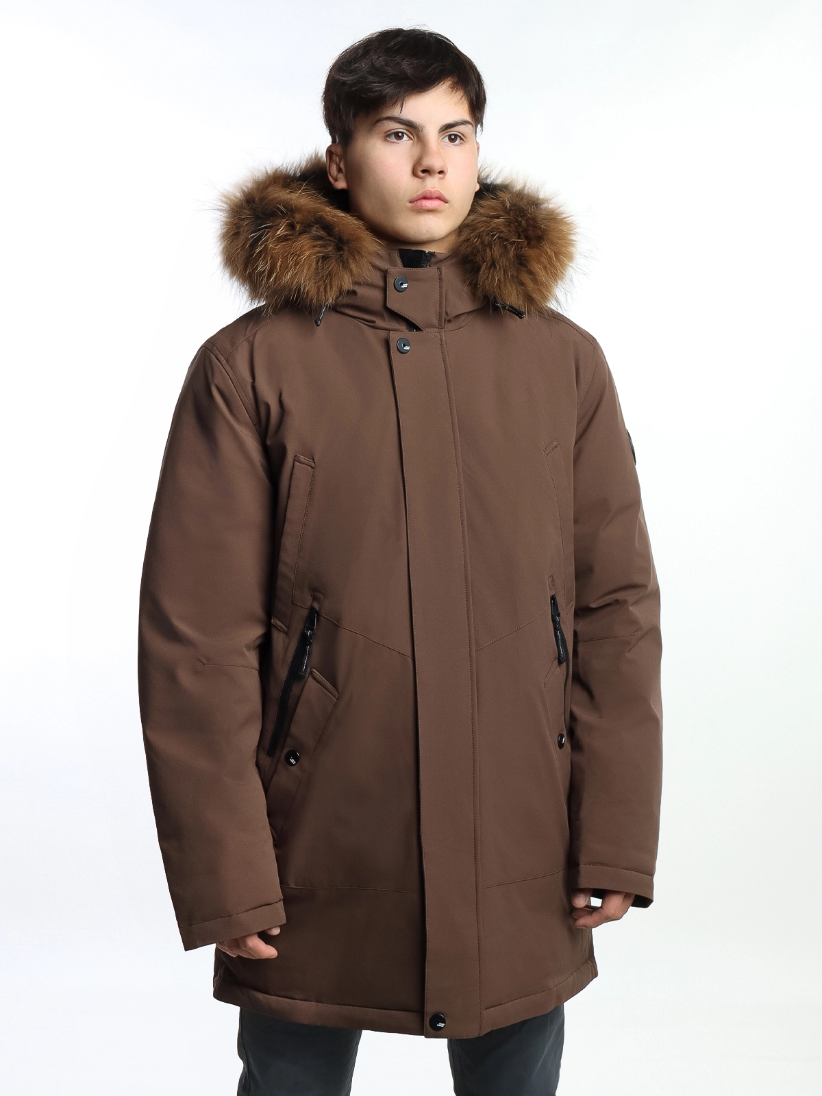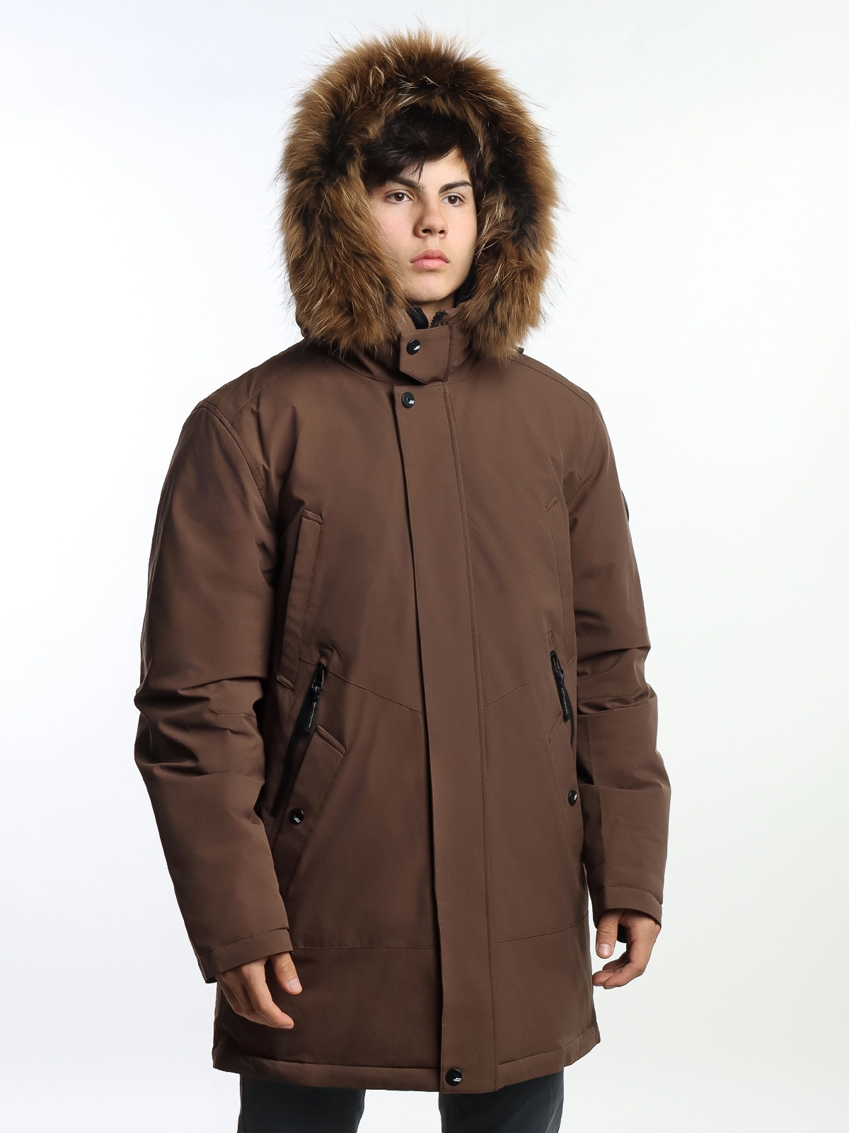 Модель оснащена боковыми и нагрудным карманами для удобного хранения мелочей. Ветрозащитная планка и утеплённый воротник обеспечивают надёжную защиту от холода, а несъёмный капюшон со съёмной меховой опушкой сохраняет тепло и комфорт при ветреной или дождливой погоде.